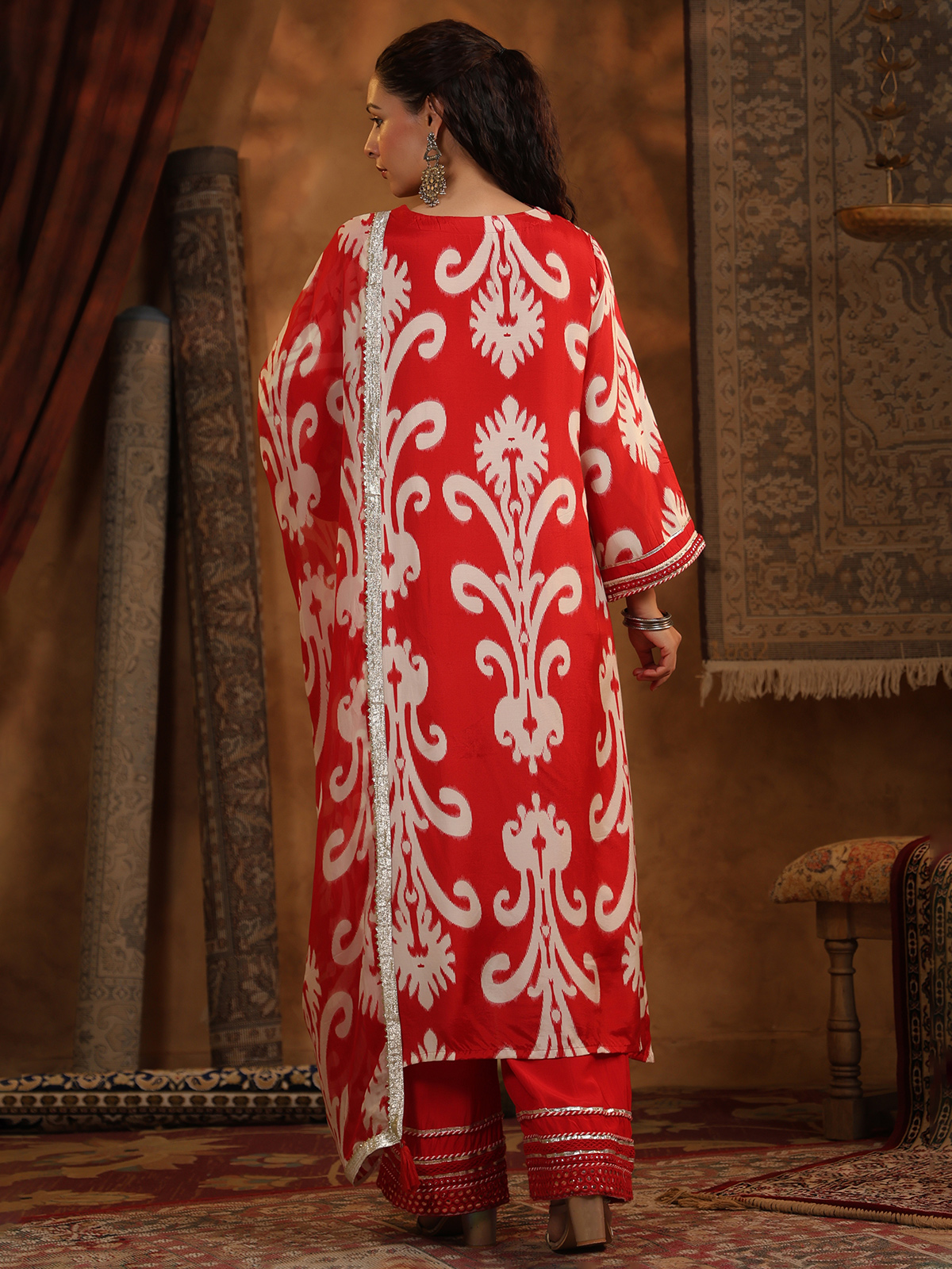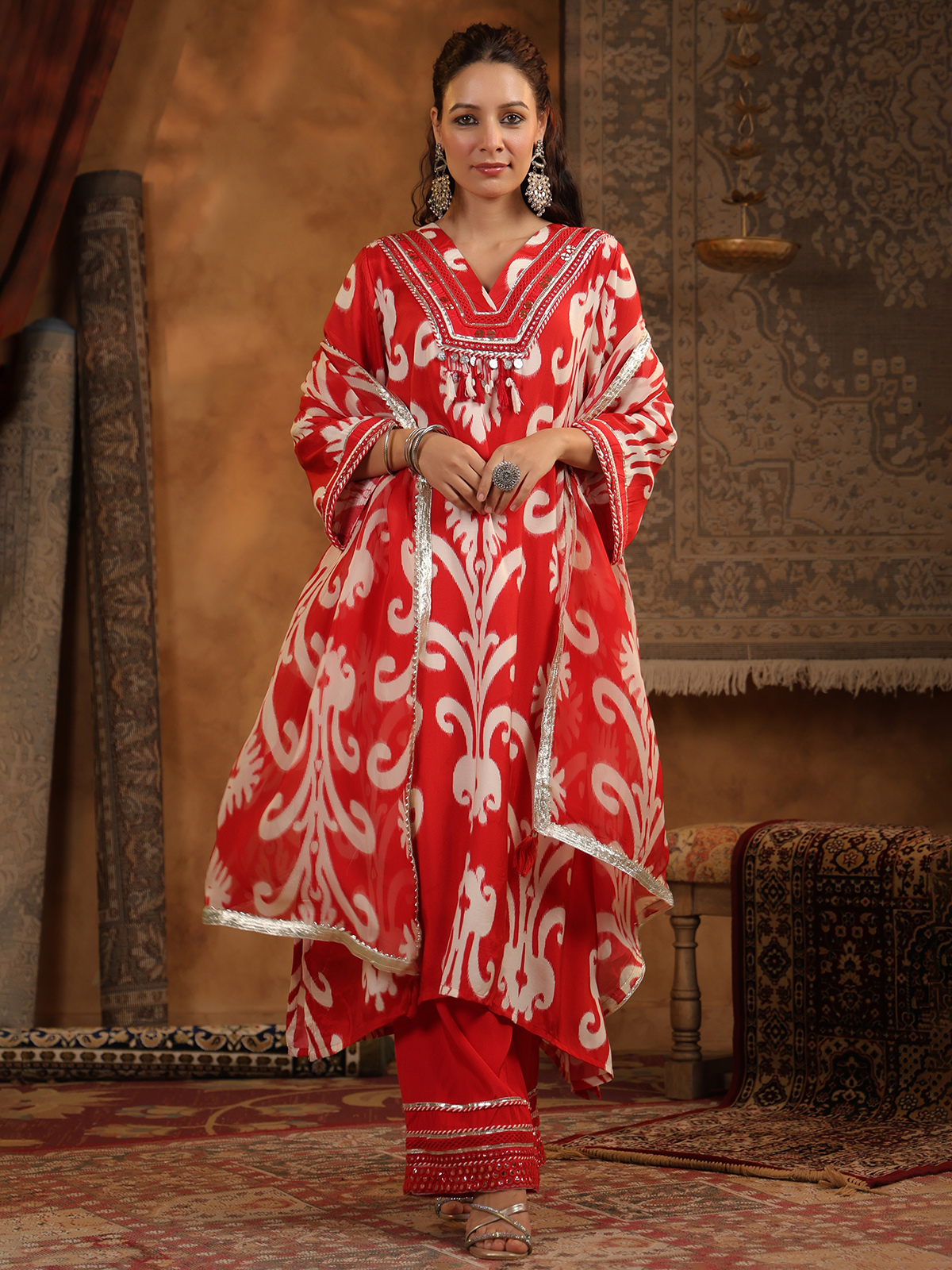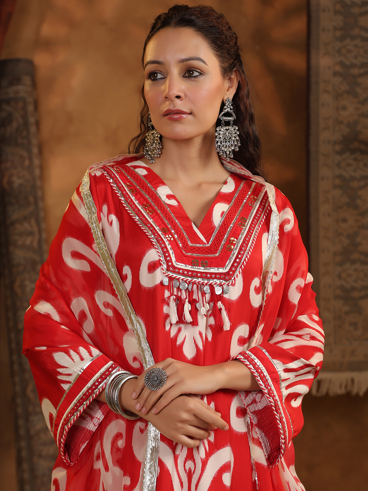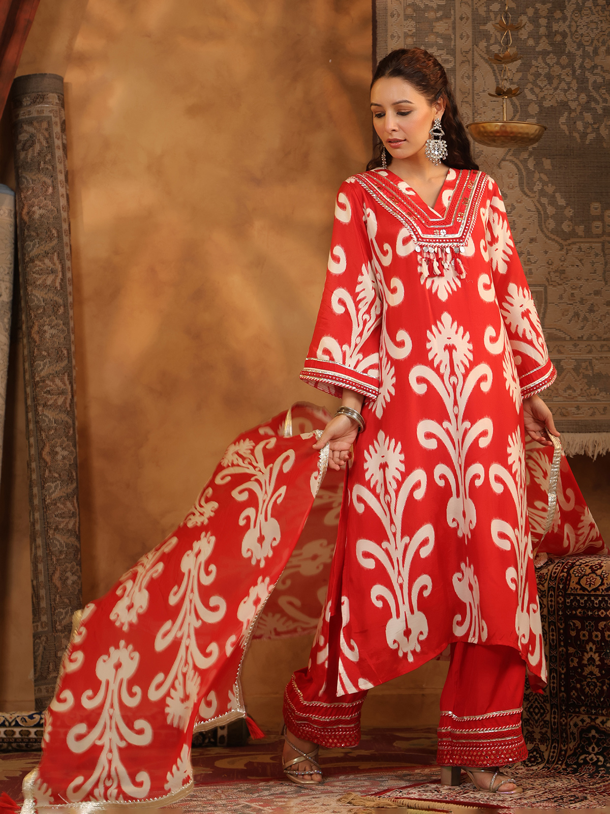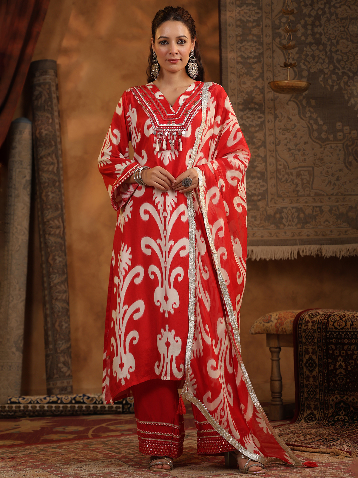 Red Printed Cotton Silk Kurti Set With Matching Pant