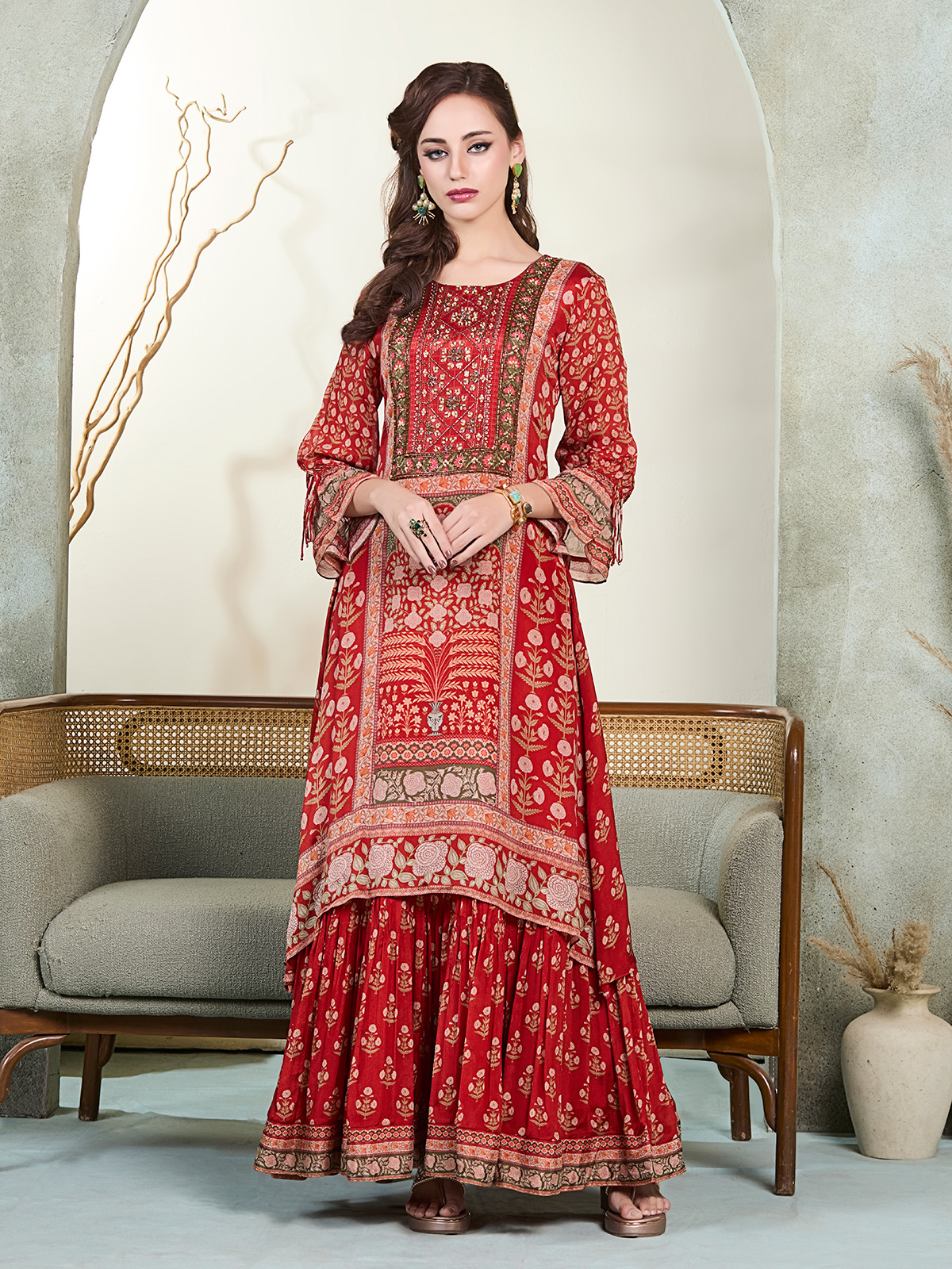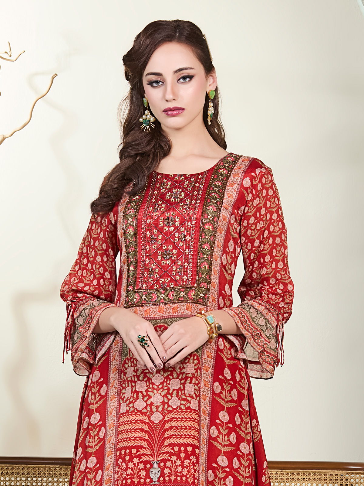 This red printed cotton silk sharara kurti set stands out with delicate bead, sequins, and cutdana highlights that enrich its festive spirit. A round neckline paired with quarter sleeves keeps the outfit effortlessly refined. Perfect for weddings, cultural celebrations, and special events where vibrant charm is desired.