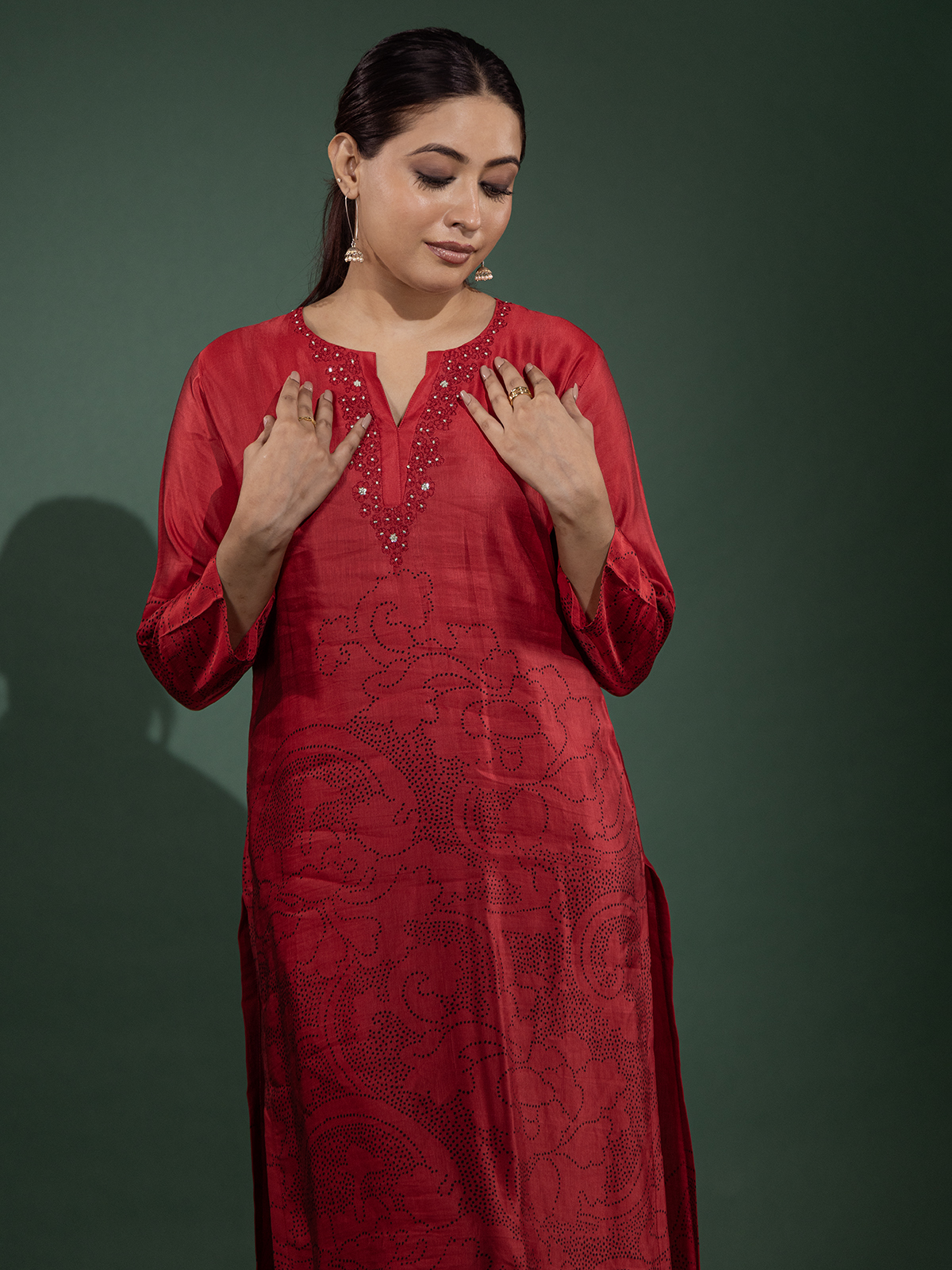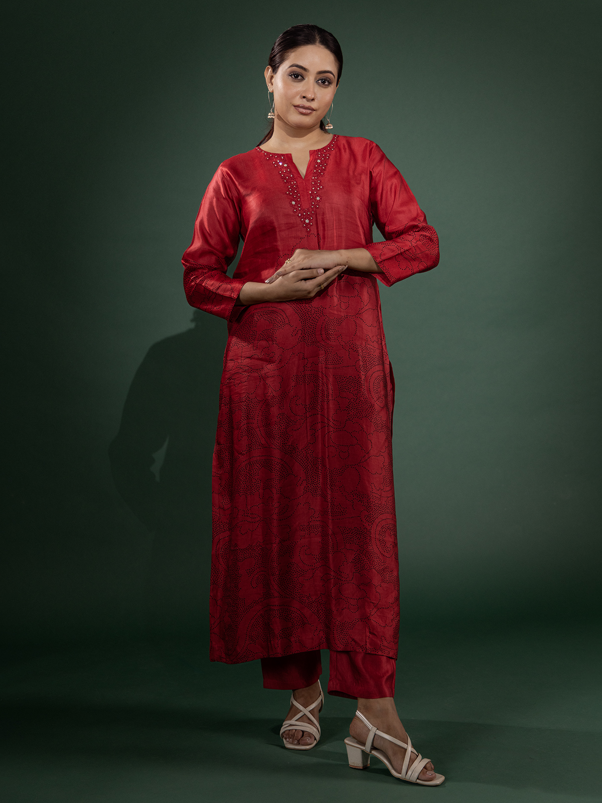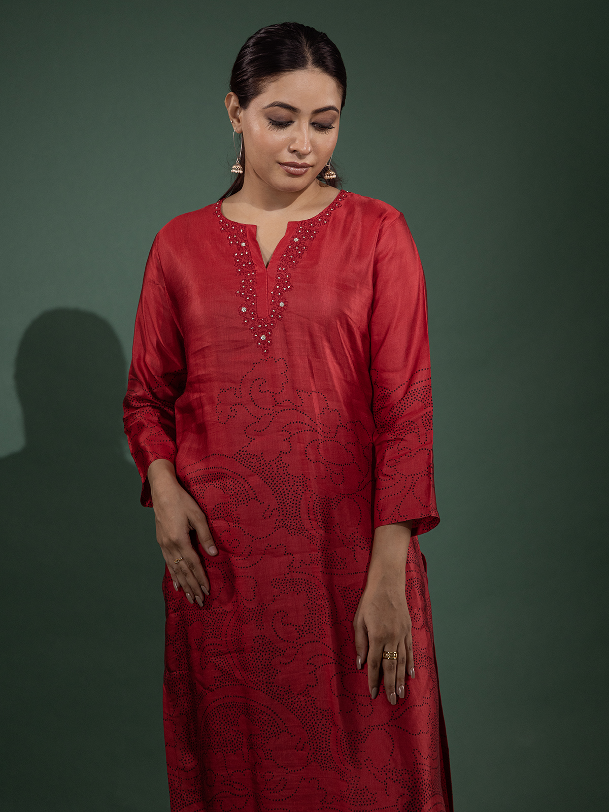 Bathed in radiant silk, this red printed kurti set features intricate beads, sequins and thread work that infuse it with festive elegance. The quarter sleeves enhance its refined appeal, while the coordinating pants complete a look that shines with poised, effortless grandeur.
