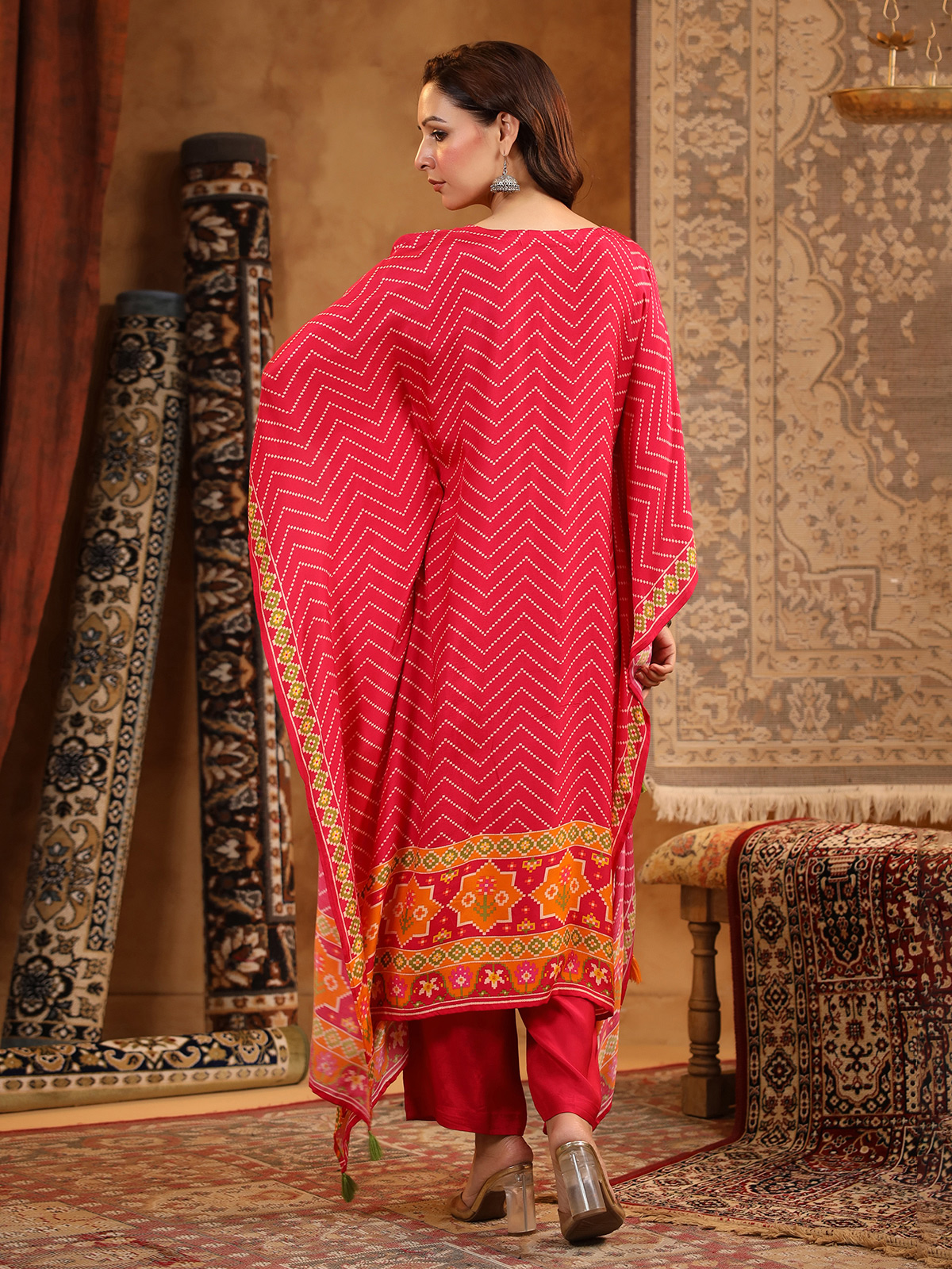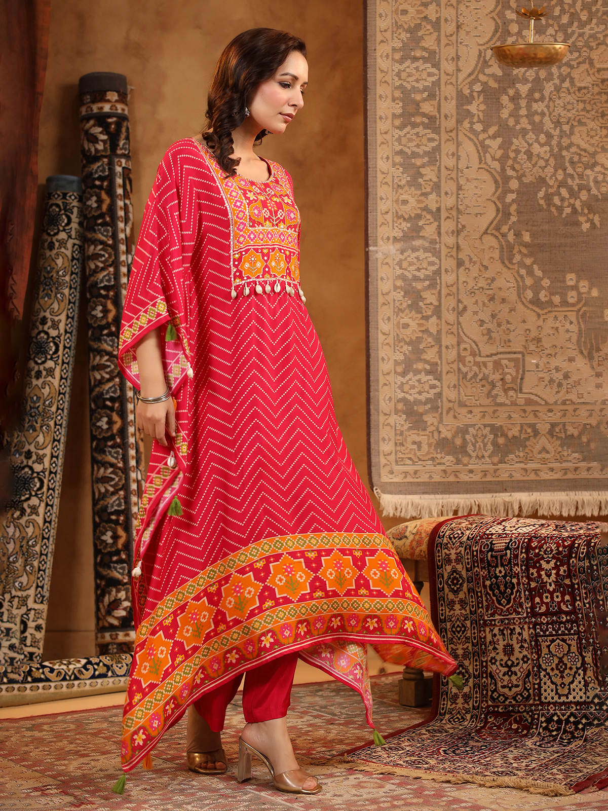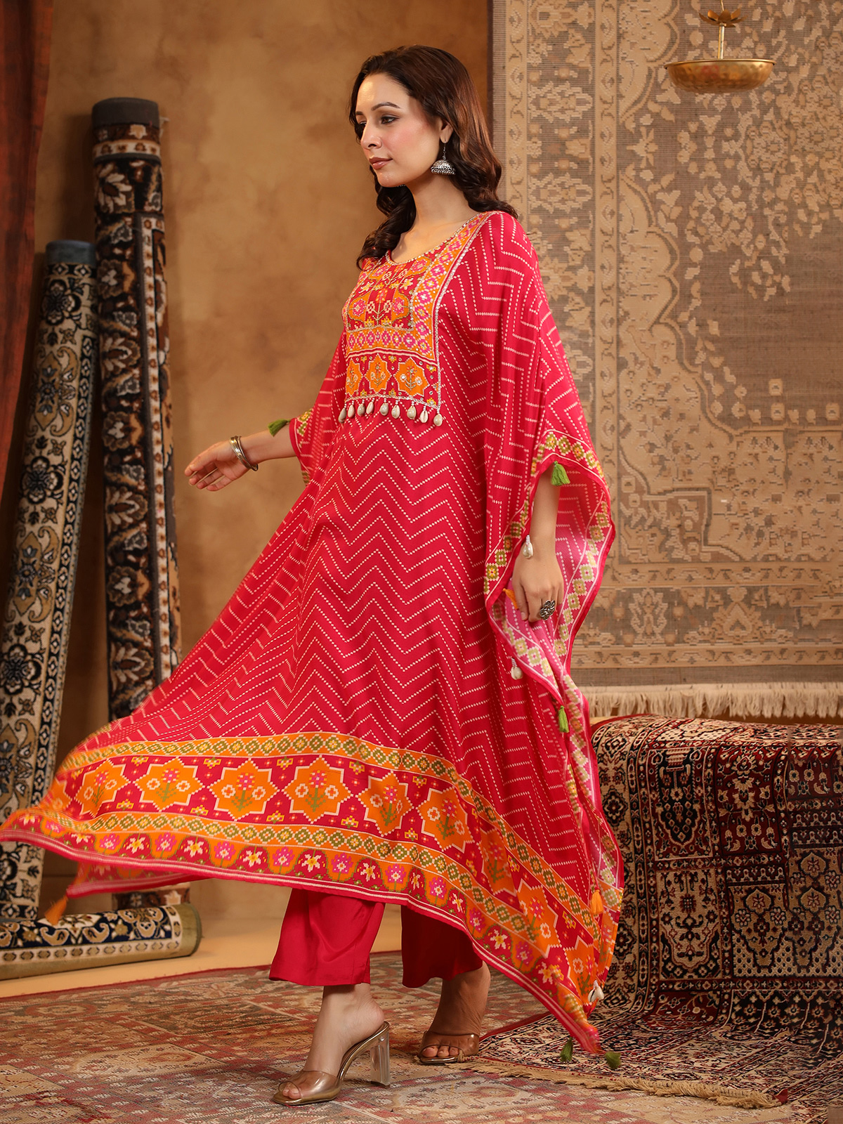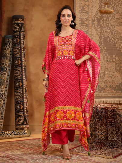 Red Silk Kaftan Style Kurti Pant Set