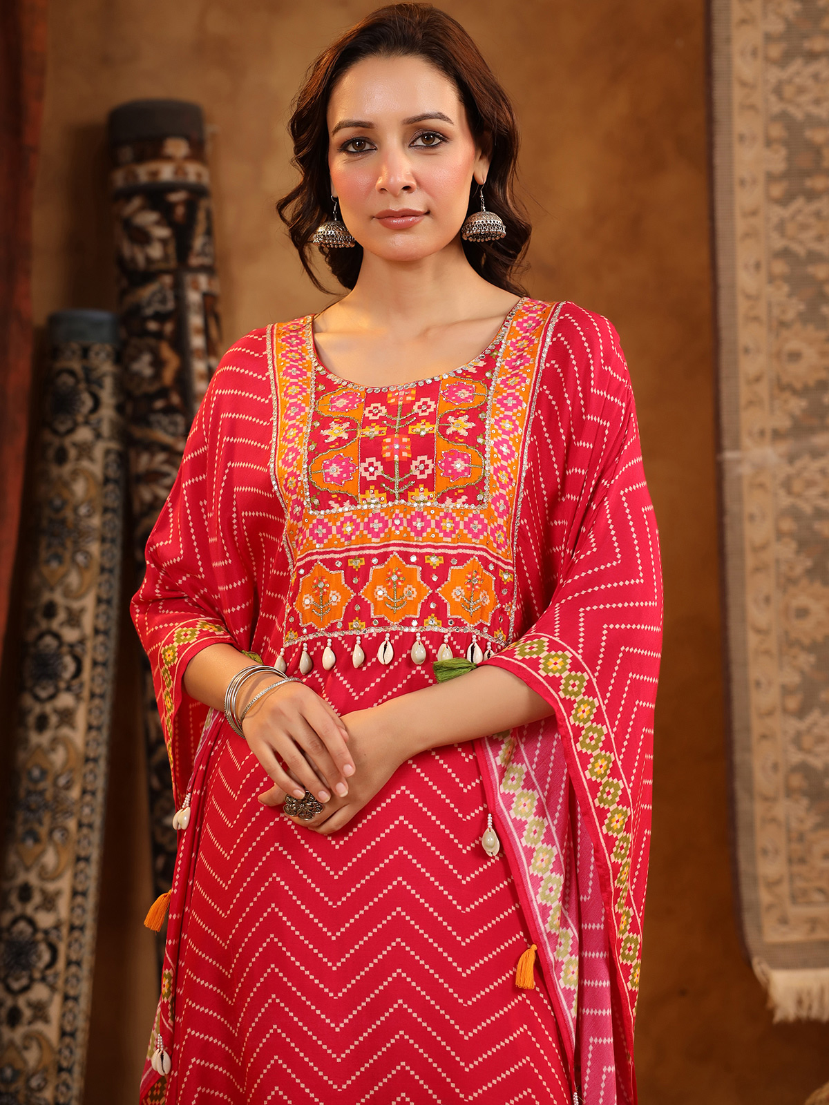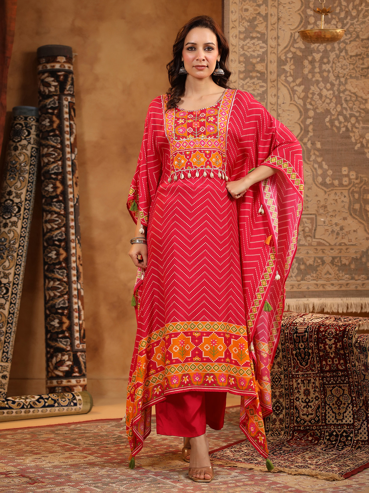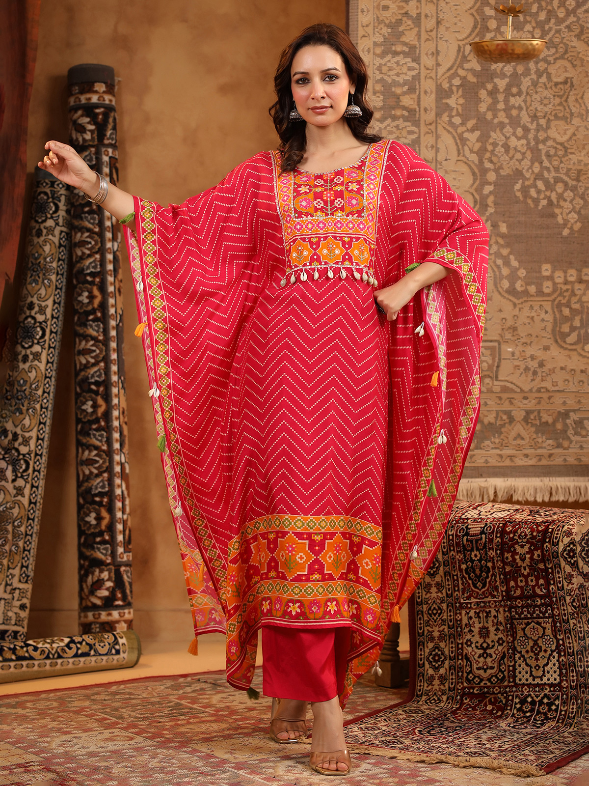 Striking red silk kaftan style kurti set featuring printed detailing and adorned with cowrie shells, mirror, pearls, sequins and resham work. Designed with a round neckline, this festive ensemble is paired with a pant for contemporary ethnic celebrations.