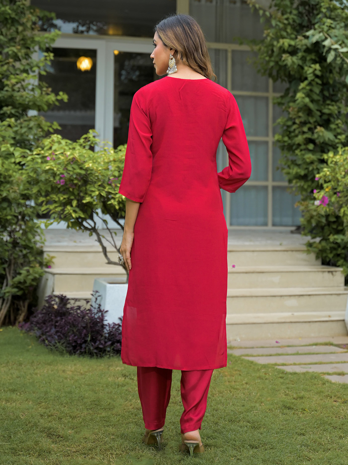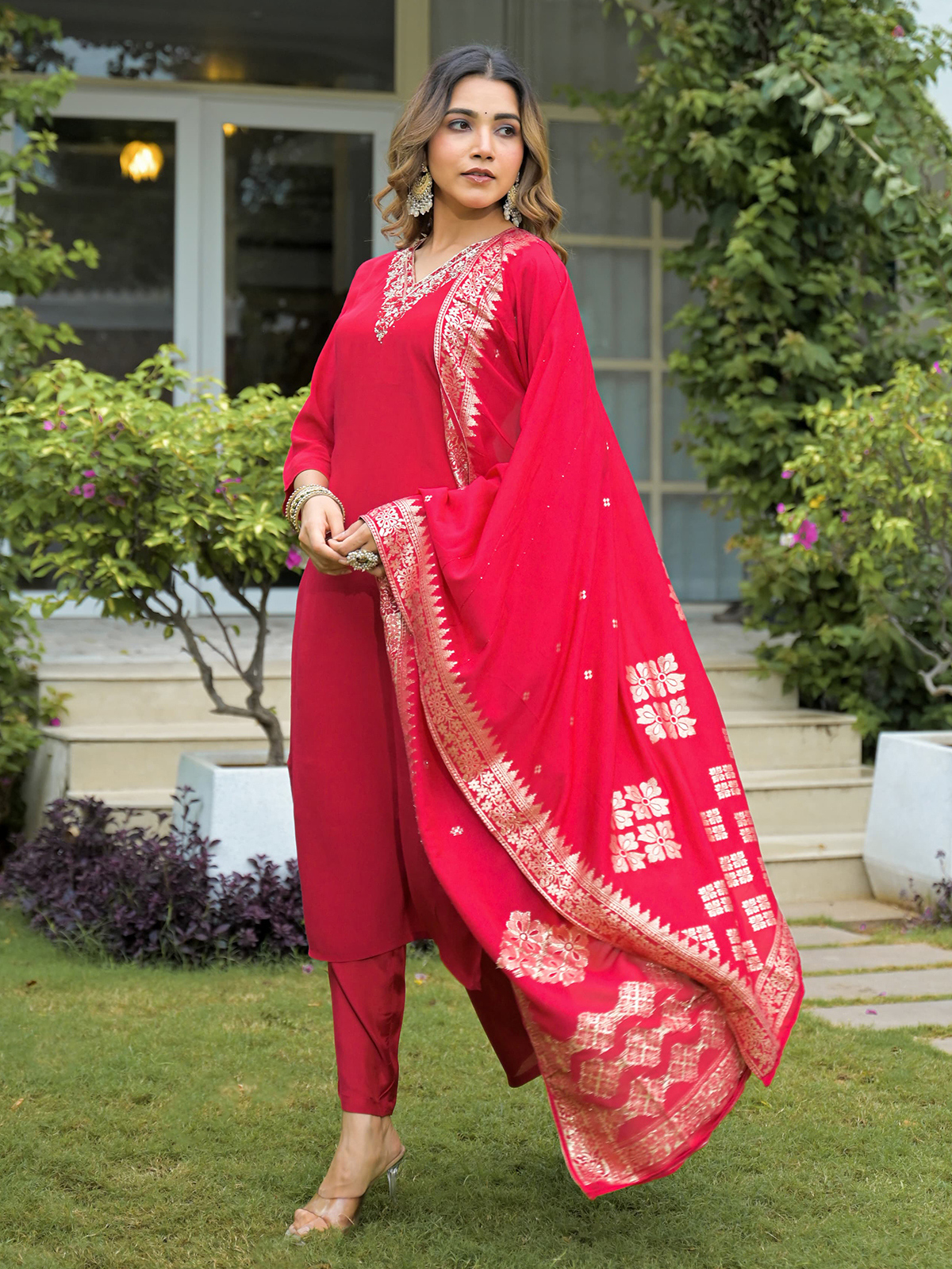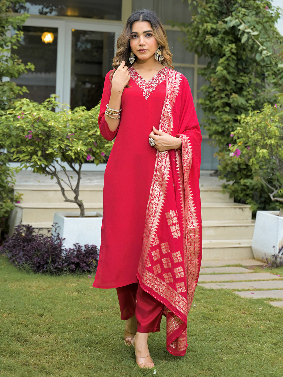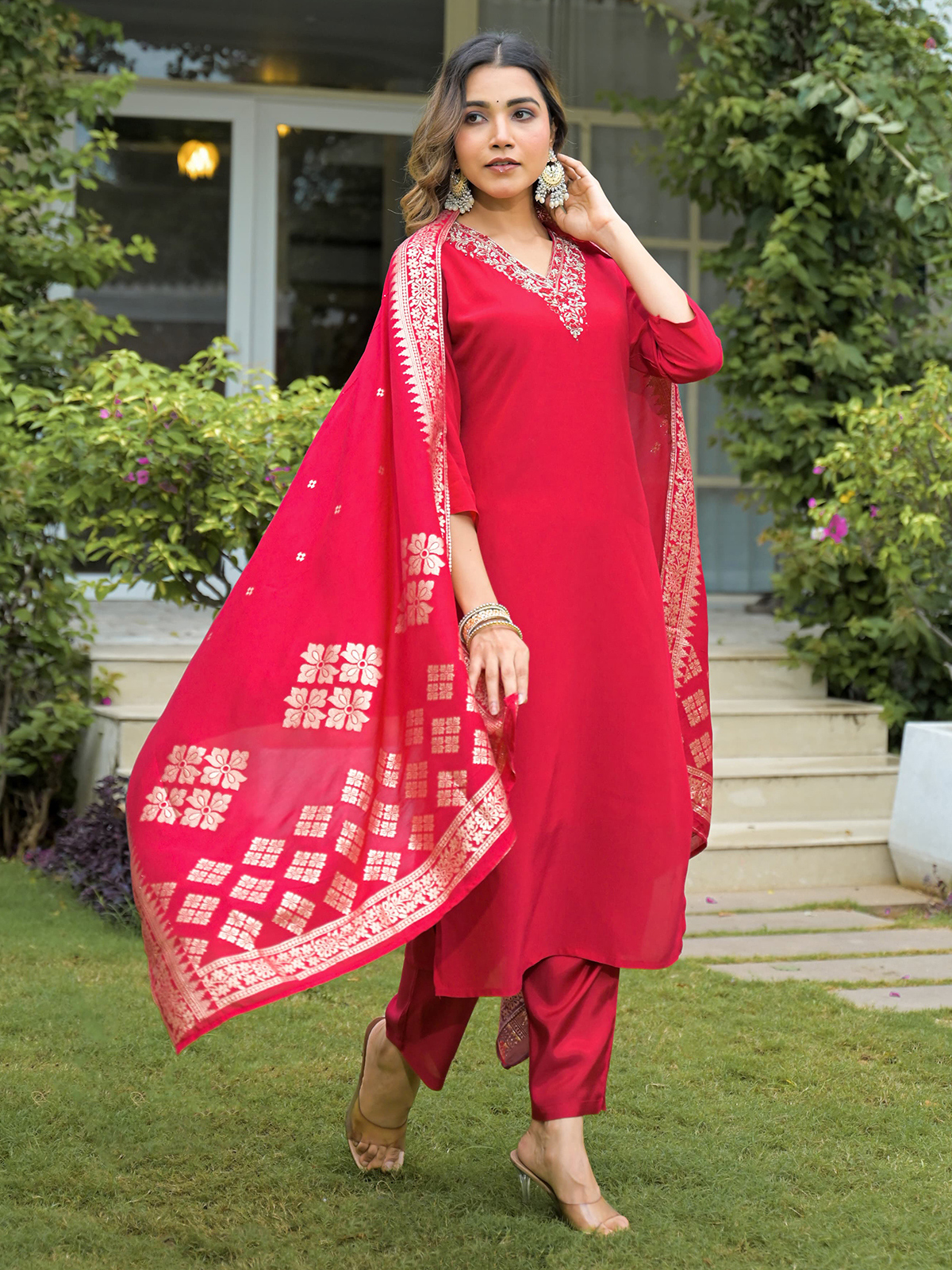 This red silk kurti set showcases tones with graceful cutdana, thread, beads, sequins, zari and stones work. Designed with a V neck and quarter sleeves, it includes a printed dupatta and pant, offering a vibrant look perfect for summer festivities.