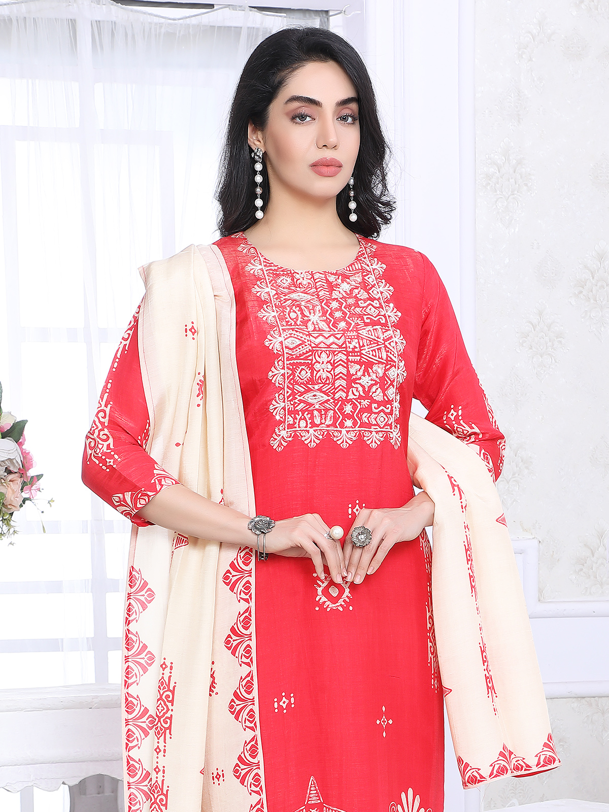 Bright and feminine reddish pink silk kurti set is crafted for festive elegance. The printed yoke style kurti features delicate cutdana, beads, sequins and diamond embellishments that add graceful shimmer. Styled with quarter sleeves, tailored pants and a contrast dupatta, this ensemble offers a vibrant yet refined look perfect for Eid celebrations and festive occasions.