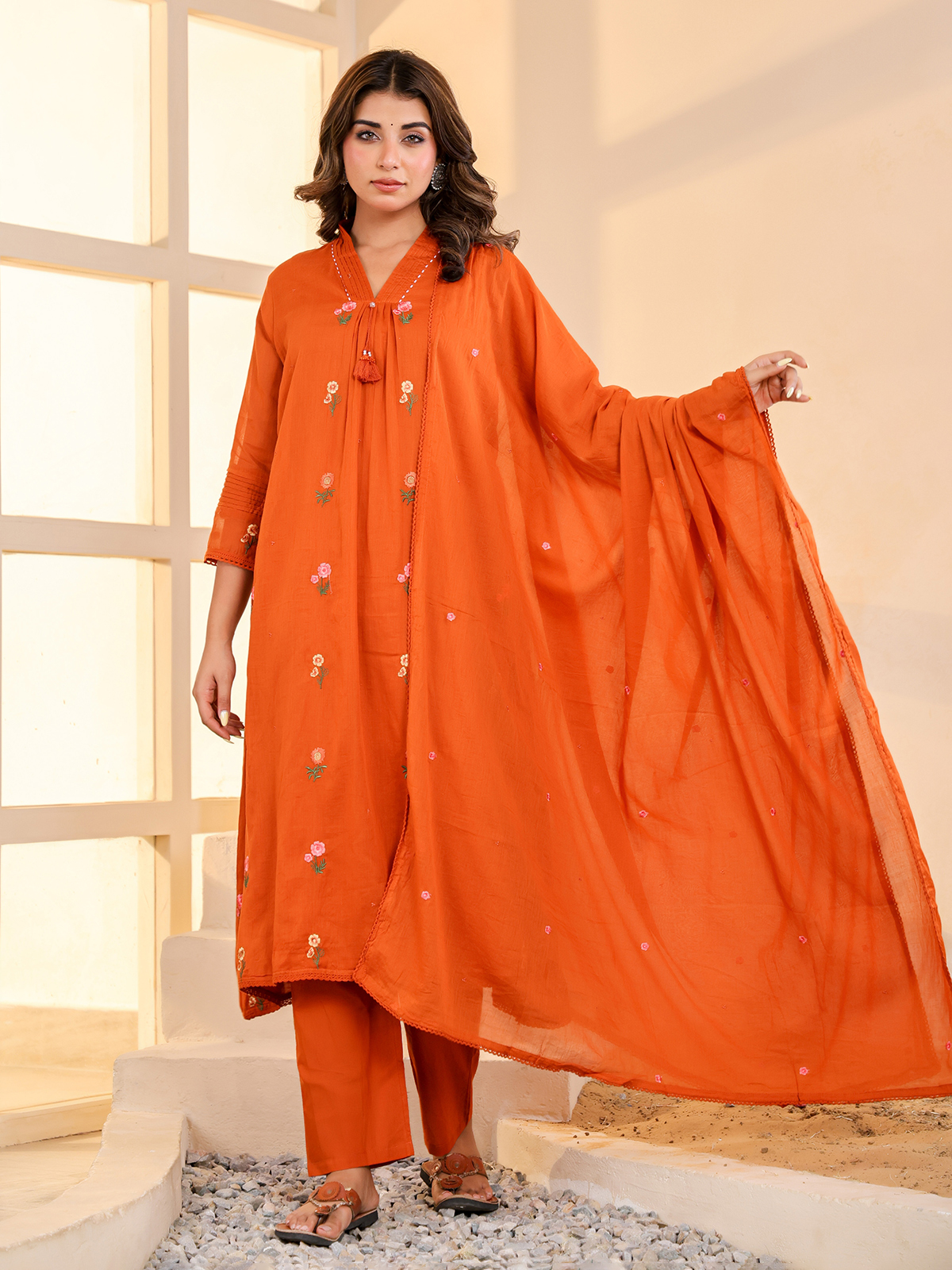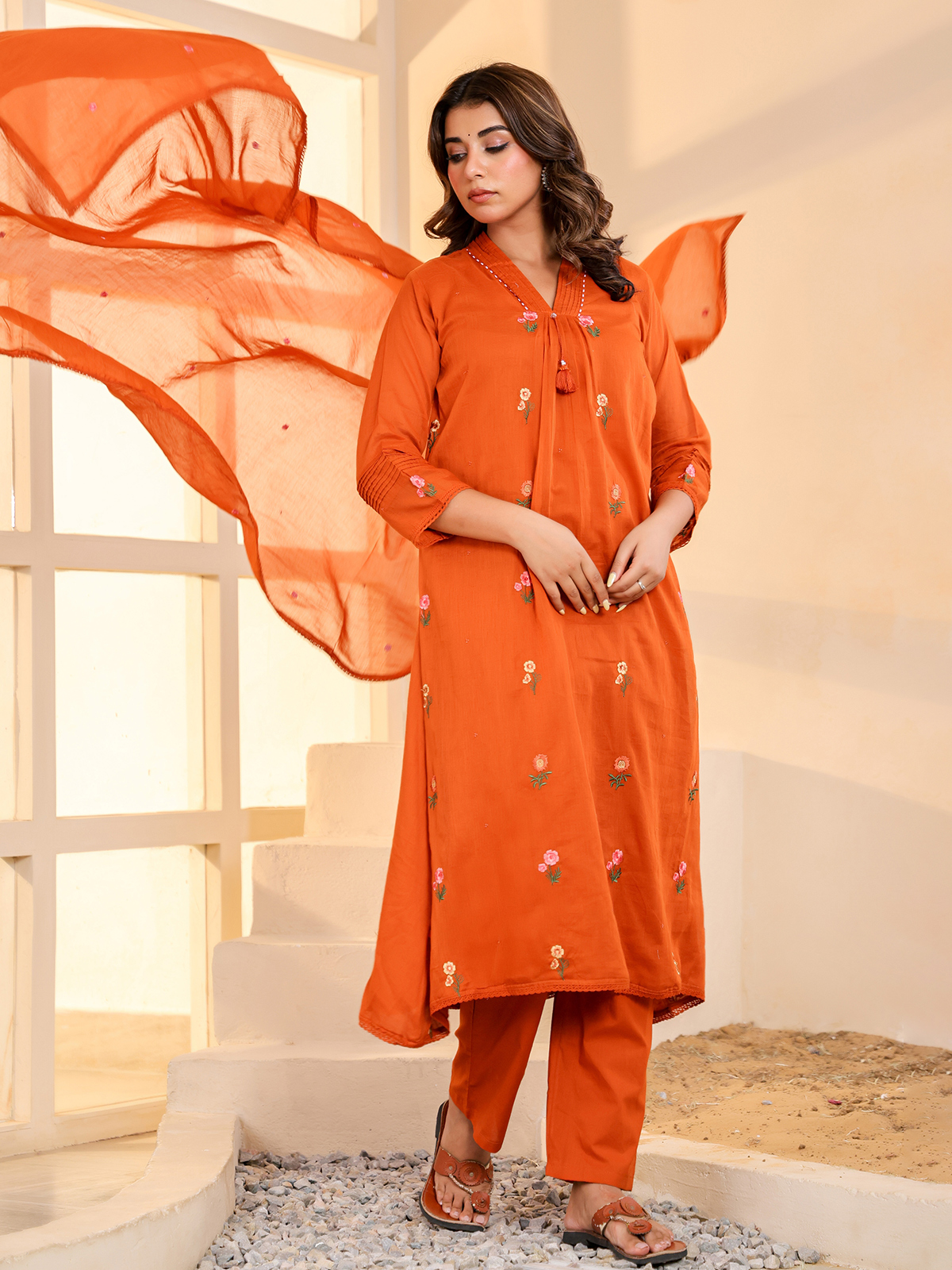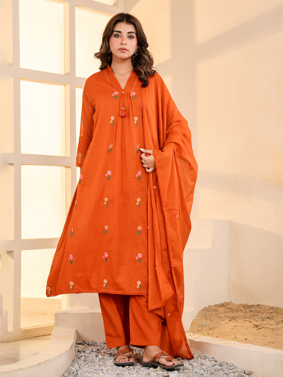 Vibrant and warm in appeal, this rust orange cotton kurti set captures timeless festive elegance. Crafted with a flattering V neckline and quarter sleeves, it is detailed with delicate embroidery for refined beauty. Ideal for festive celebrations, it is paired with comfortable pants and a complementing dupatta.