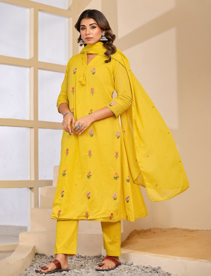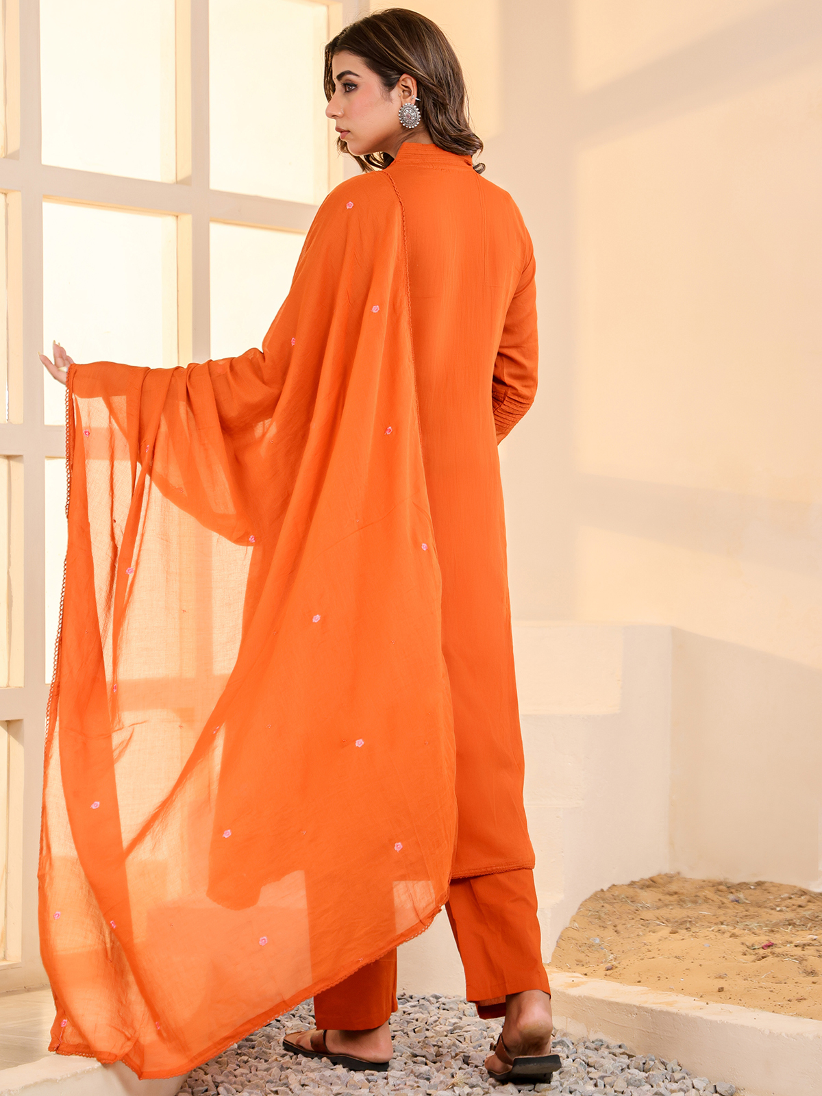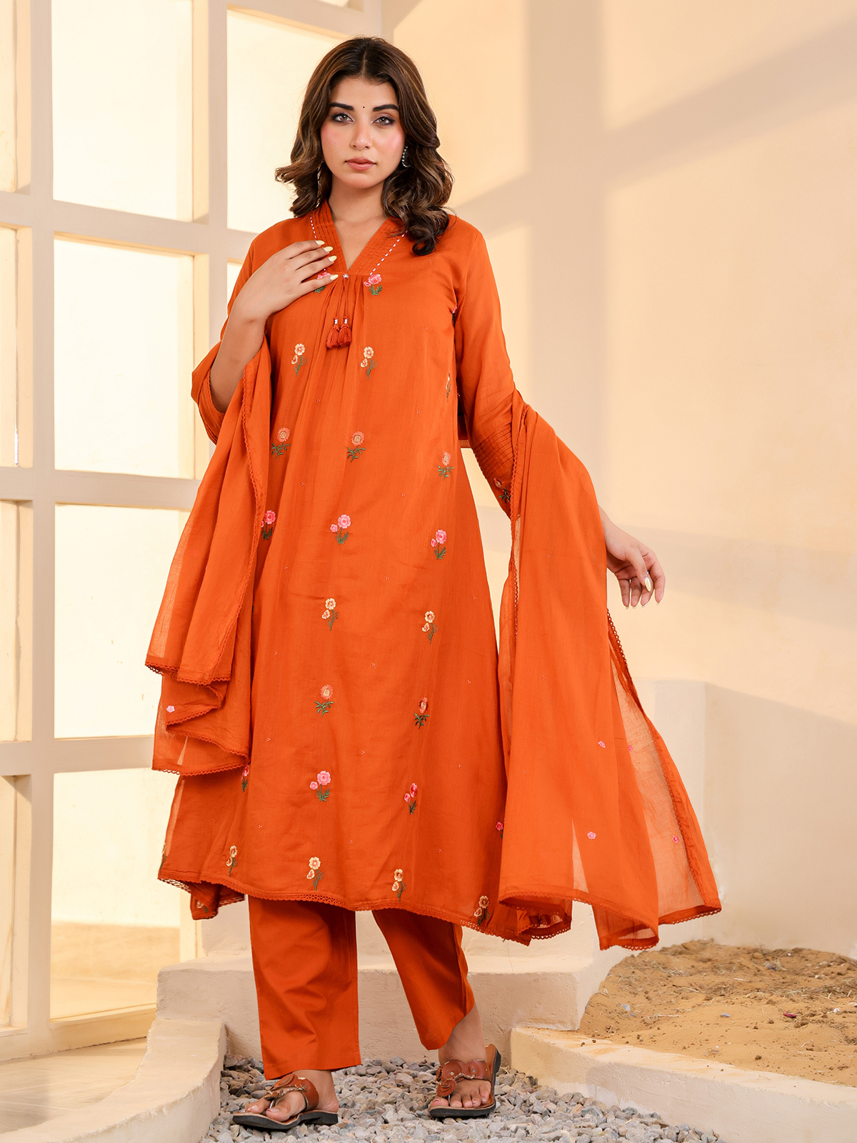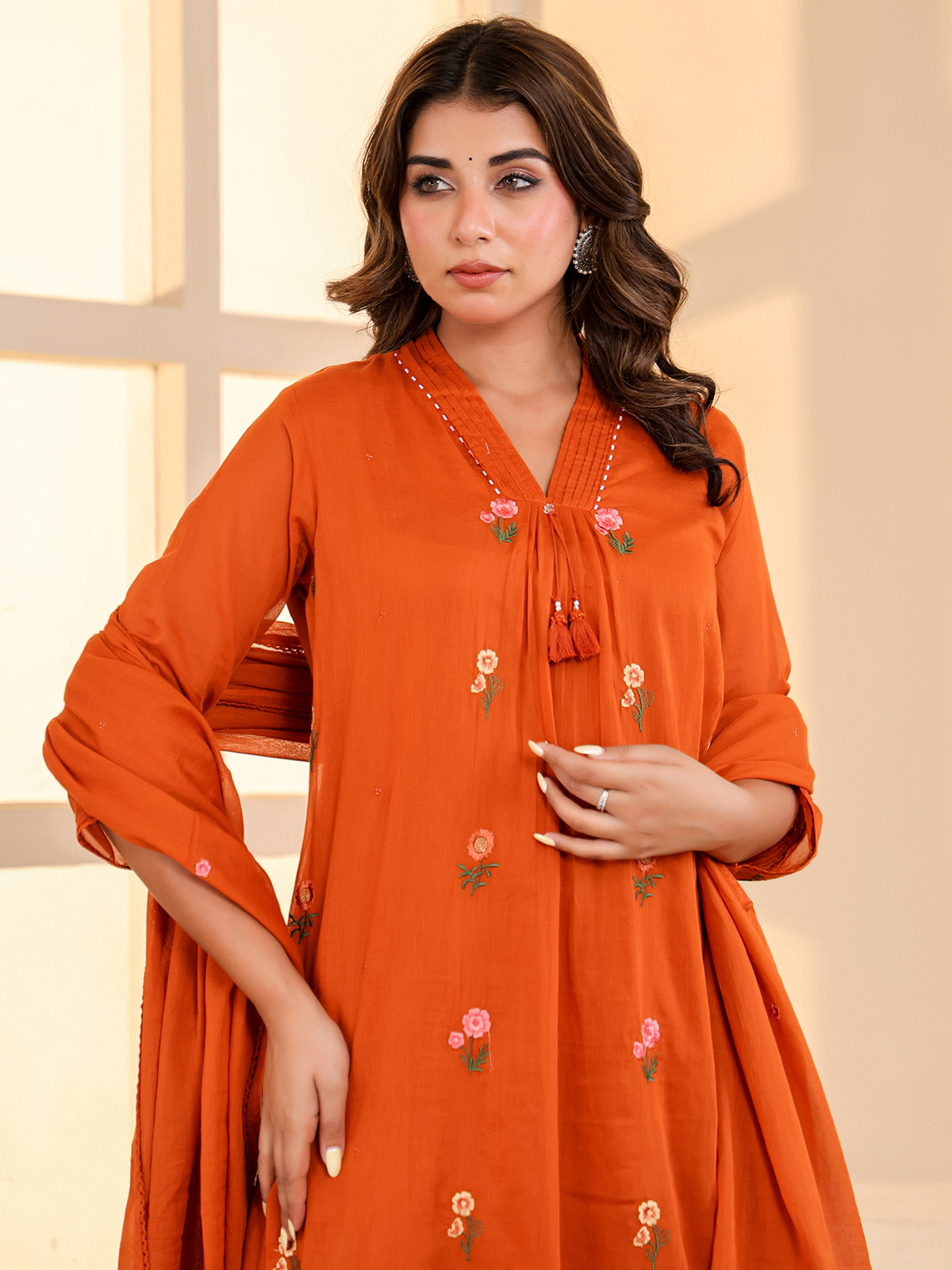 Vibrant and warm in appeal, this rust orange cotton kurti set captures timeless festive elegance. Crafted with a flattering V neckline and quarter sleeves, it is detailed with delicate embroidery for refined beauty. Ideal for festive celebrations, it is paired with comfortable pants and a complementing dupatta.