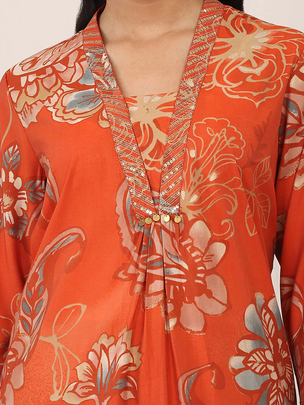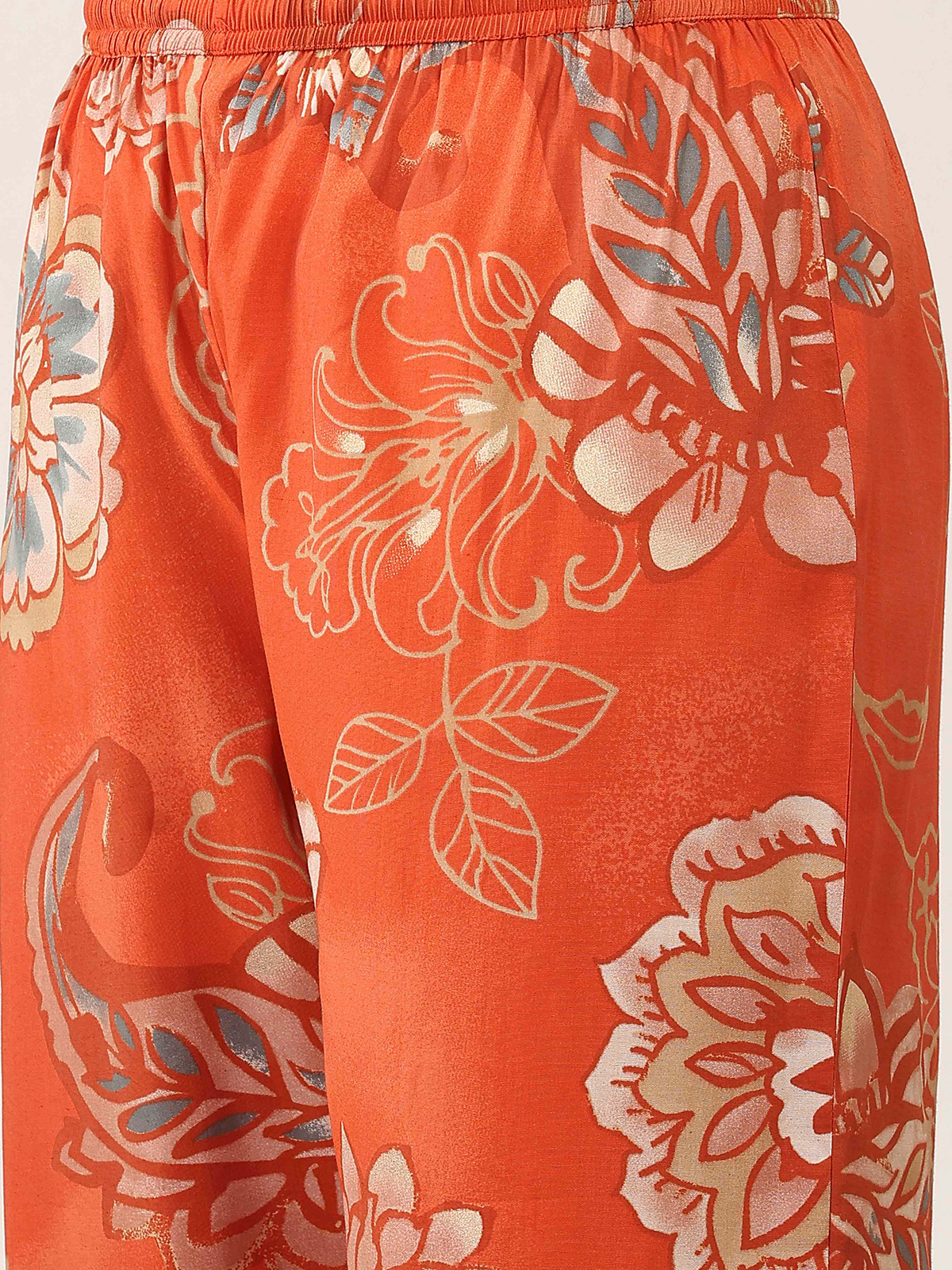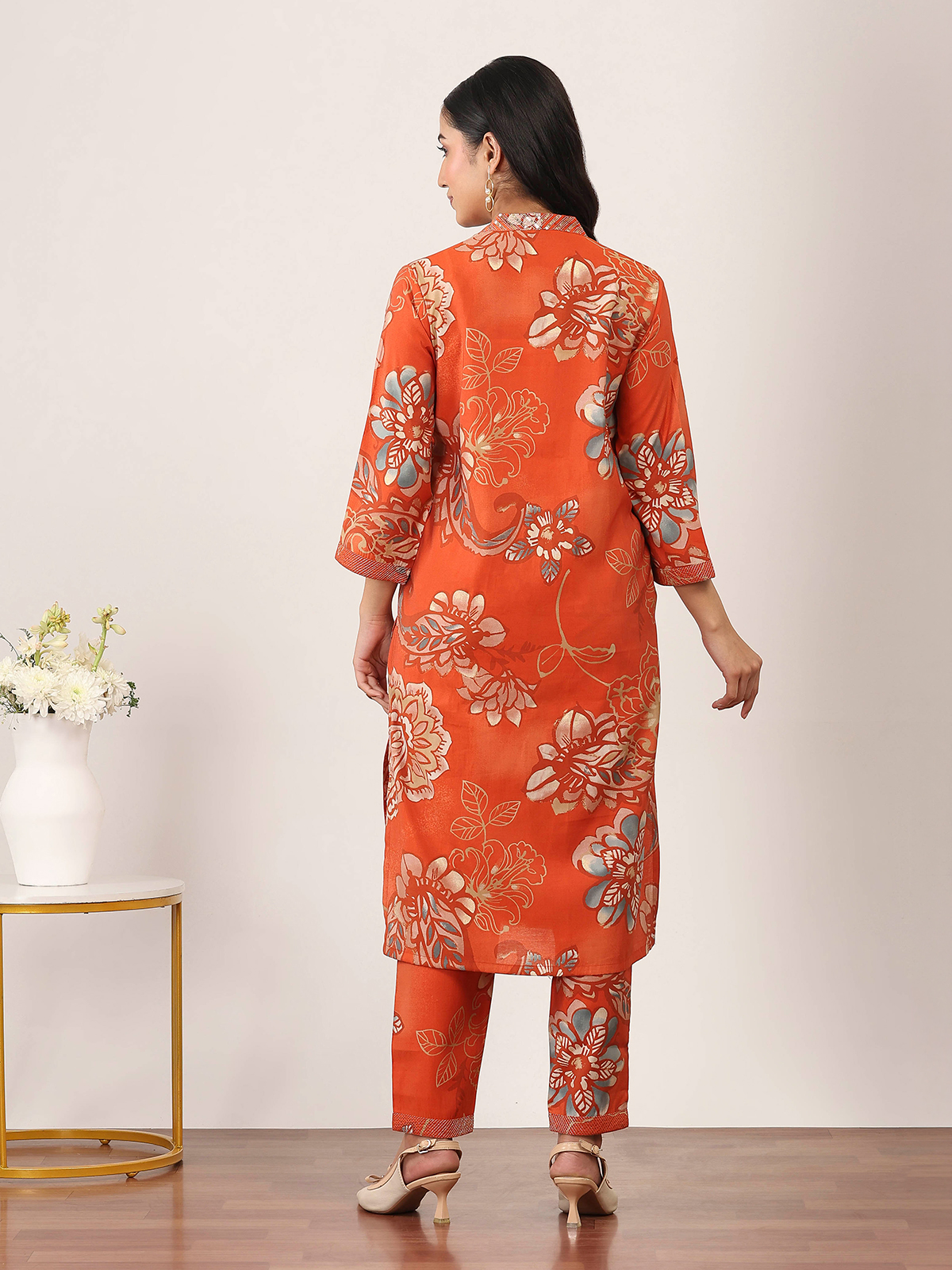 Rust Orange Cotton Silk Floral Printed Kurti Set