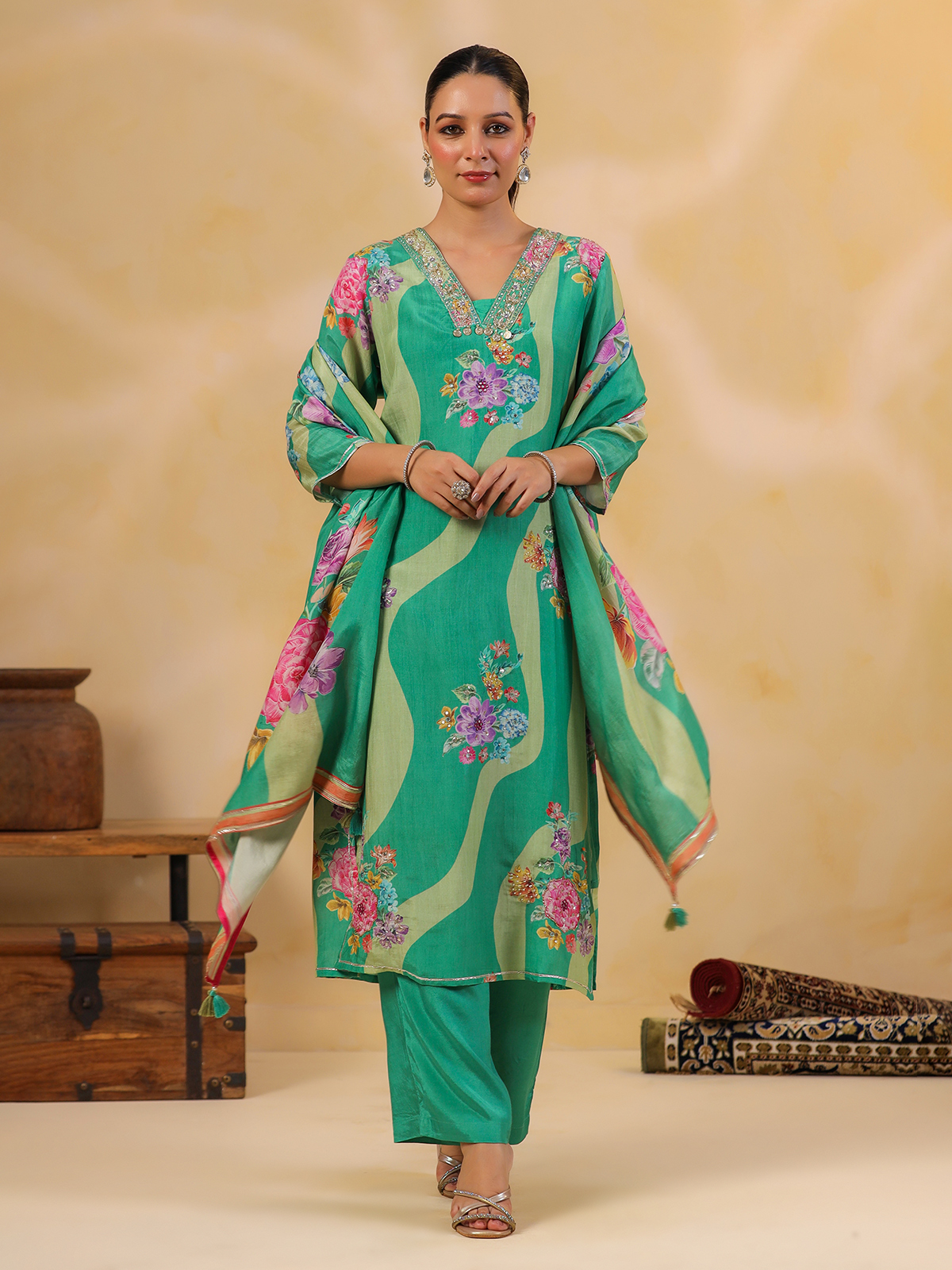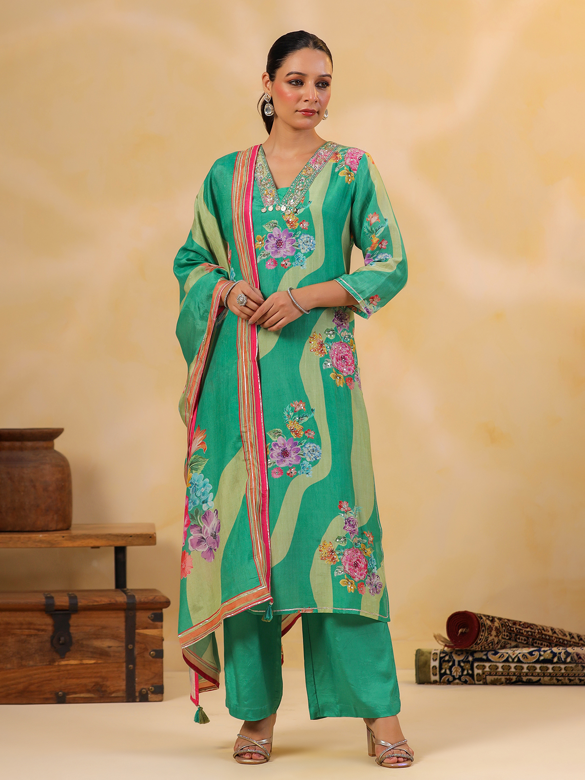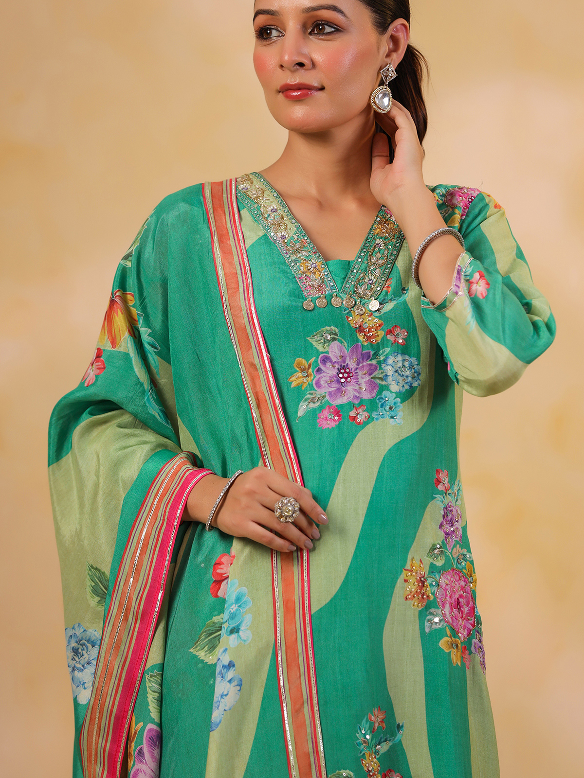 Grand in sage green silk, this kurti set glimmers with cutdana, sequins, coins, mirror, zardosi, and bead embellishments. Styled with a V-neckline and quarter sleeves, it is paired with a pant and dupatta. A luxurious festive ensemble designed for weddings and celebratory evenings.