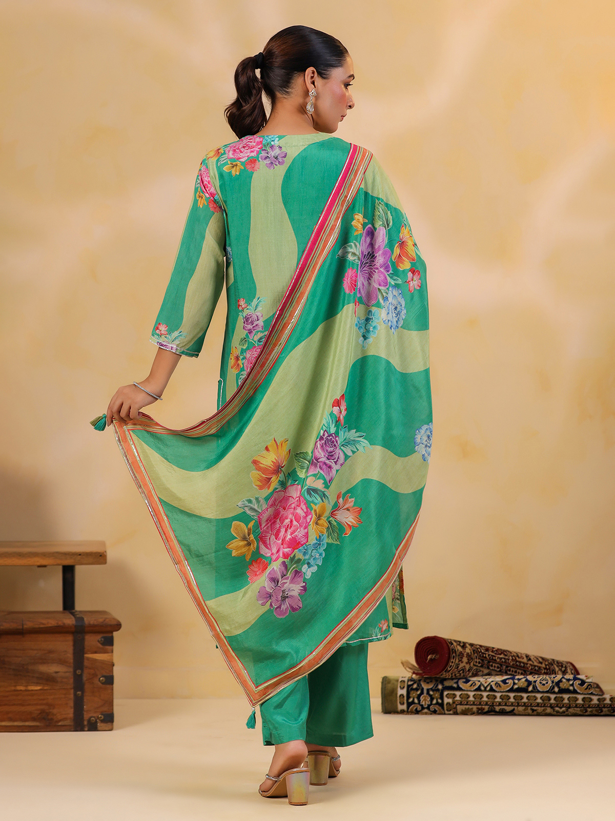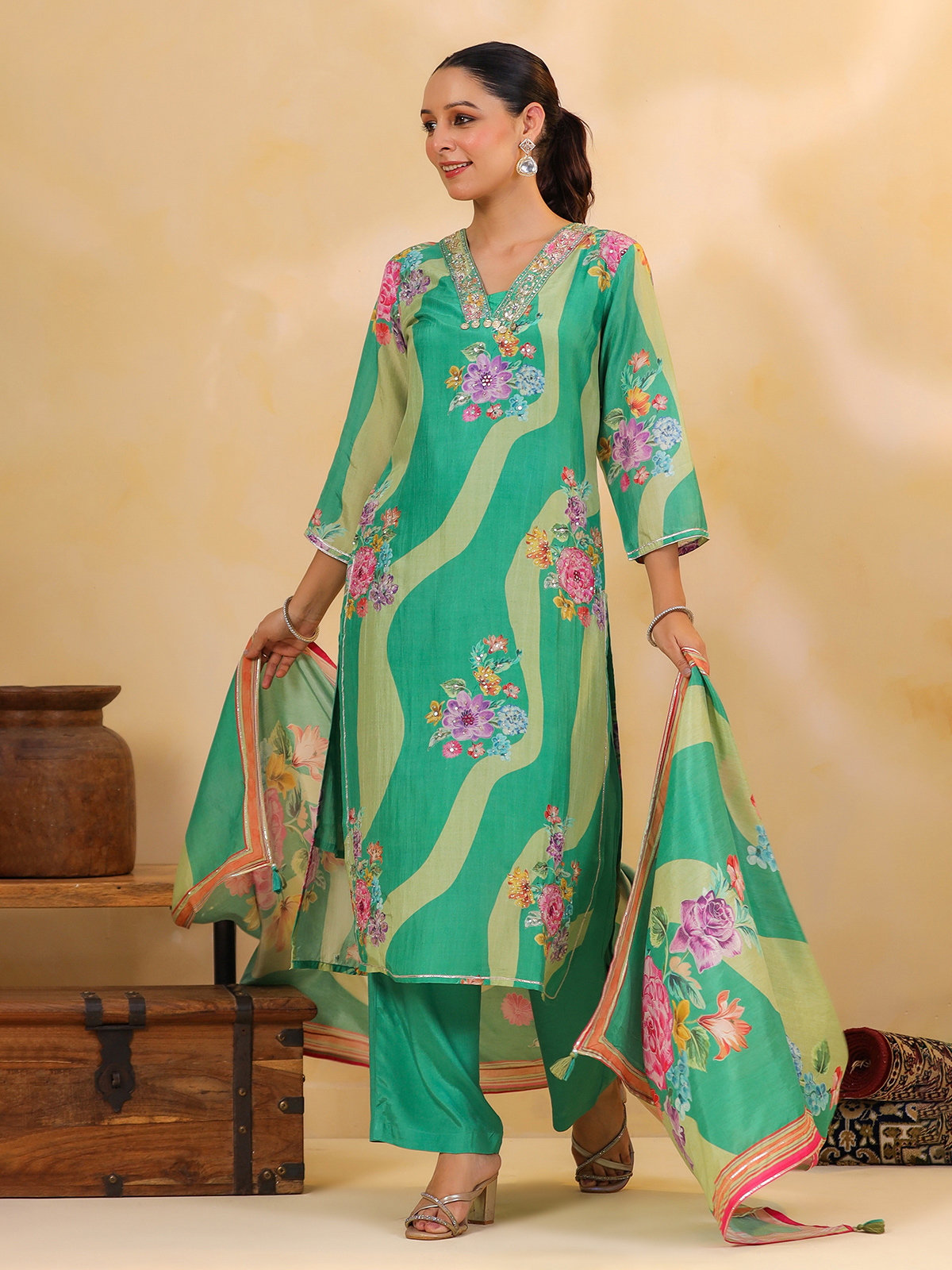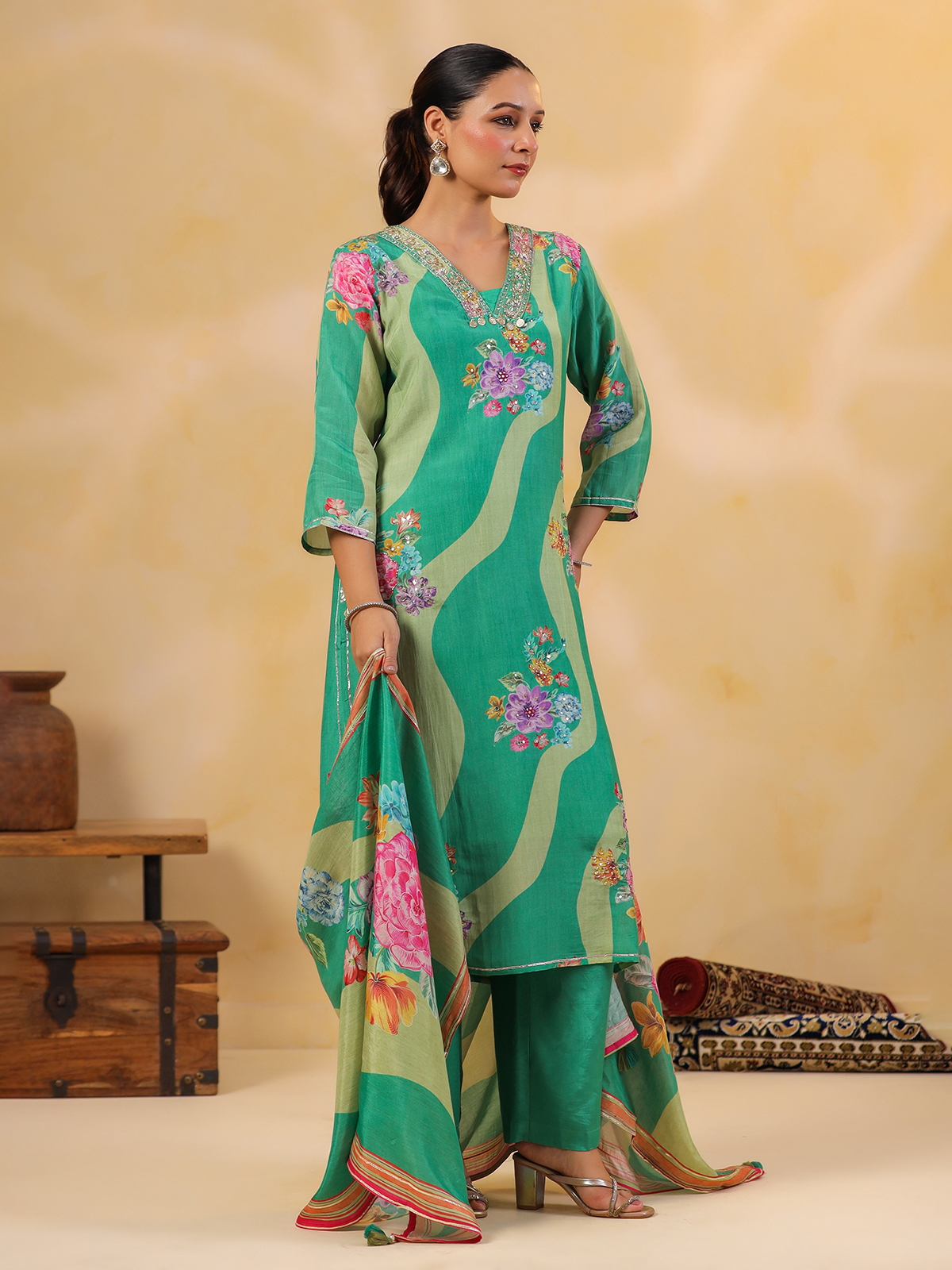 Grand in sage green silk, this kurti set glimmers with cutdana, sequins, coins, mirror, zardosi, and bead embellishments. Styled with a V-neckline and quarter sleeves, it is paired with a pant and dupatta. A luxurious festive ensemble designed for weddings and celebratory evenings.