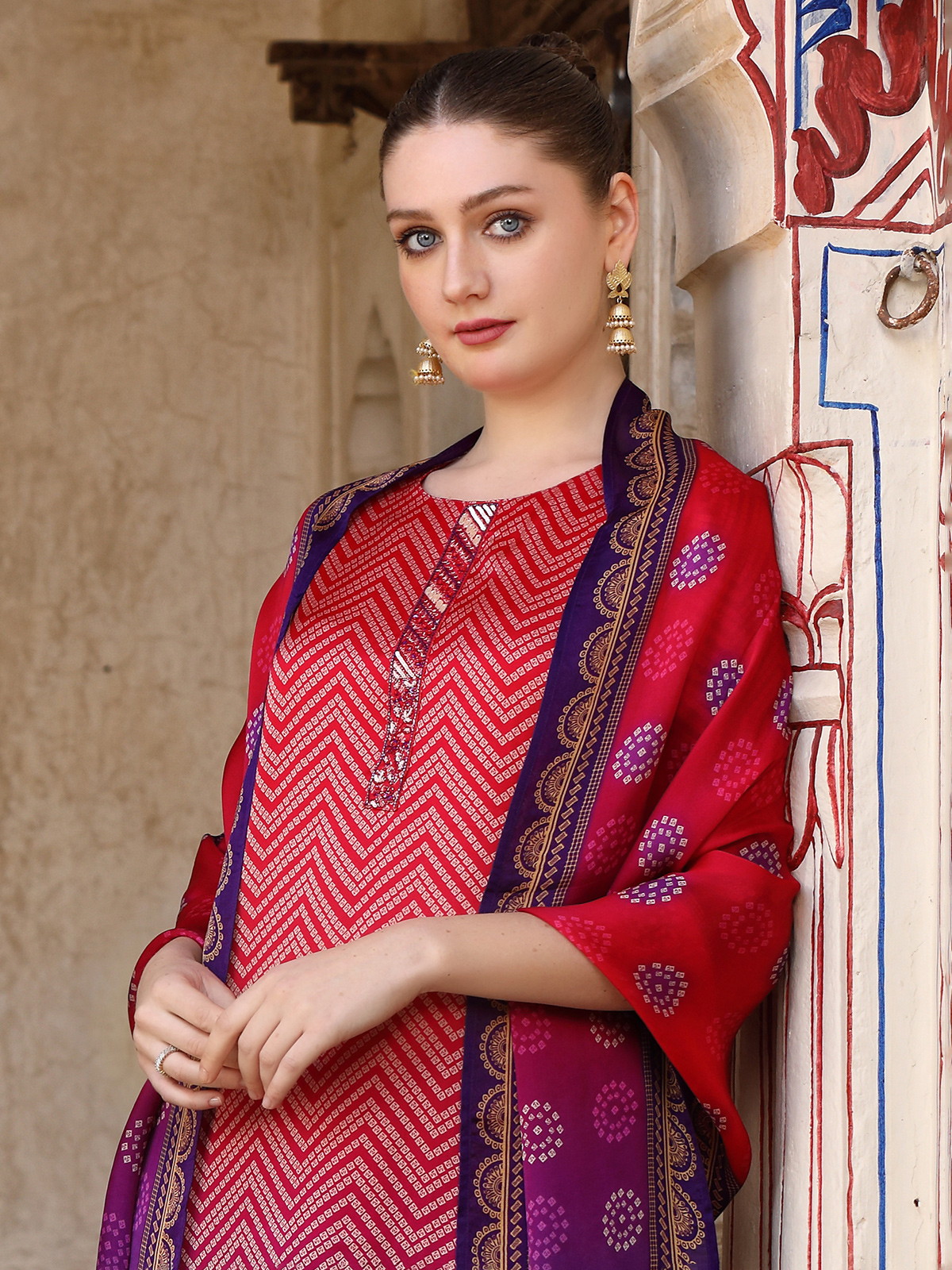 Crafted in shaded maroon and purple silk, this printed kurti set is styled with a round neckline and quarter sleeves. Teamed with a pant and dupatta, it exudes festive charm, bringing together vibrant hues, elegance, and comfort for celebratory occasions.