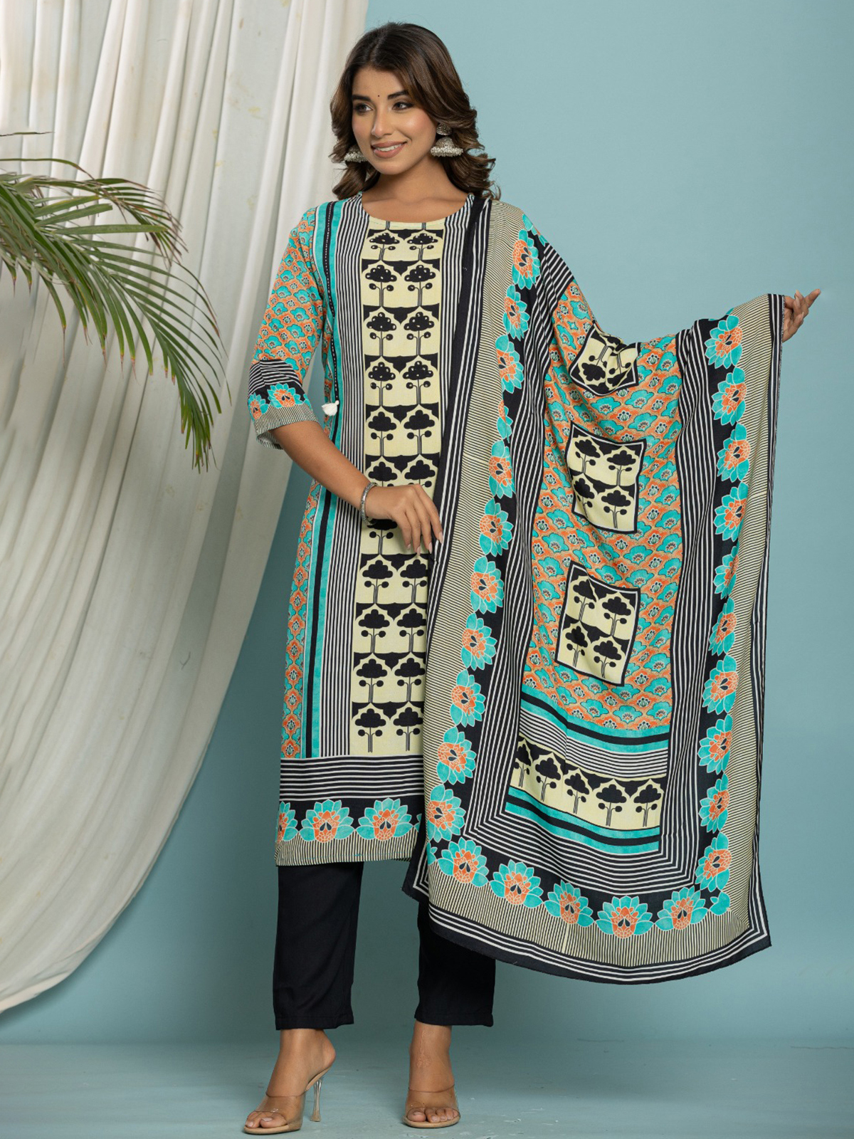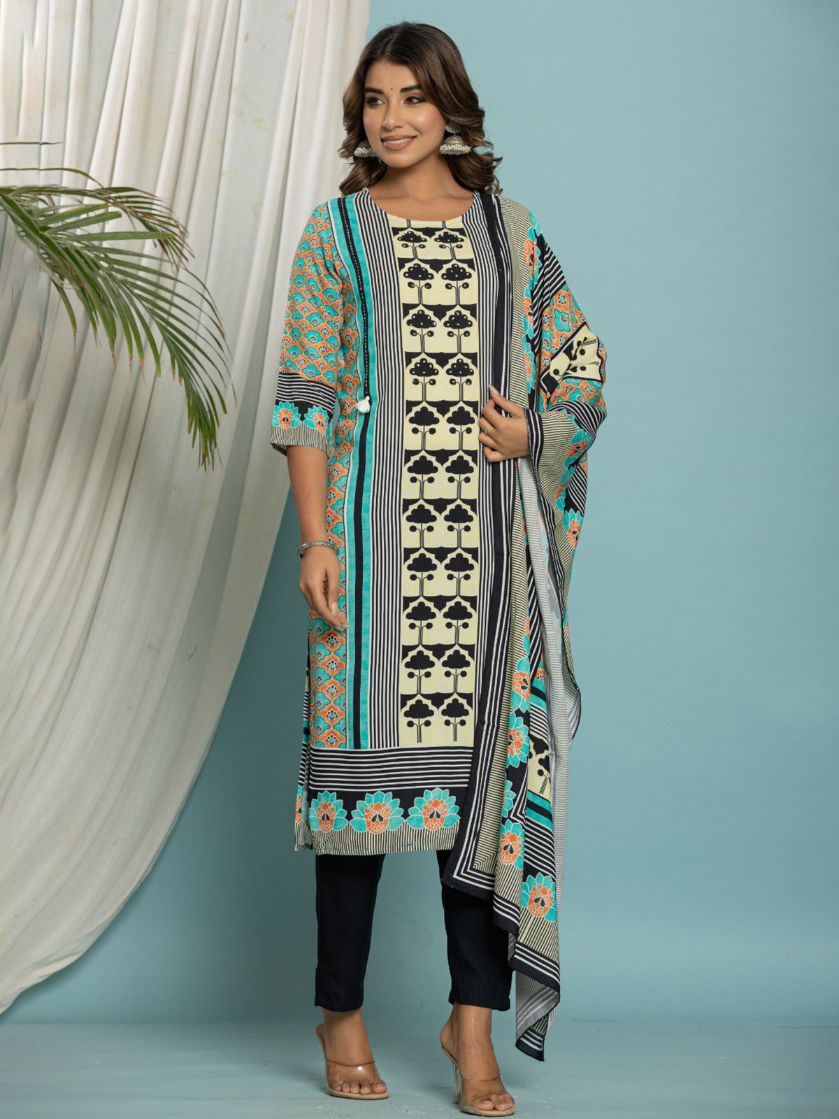 Sky Blue Cotton Kurti Set With Prints For Women