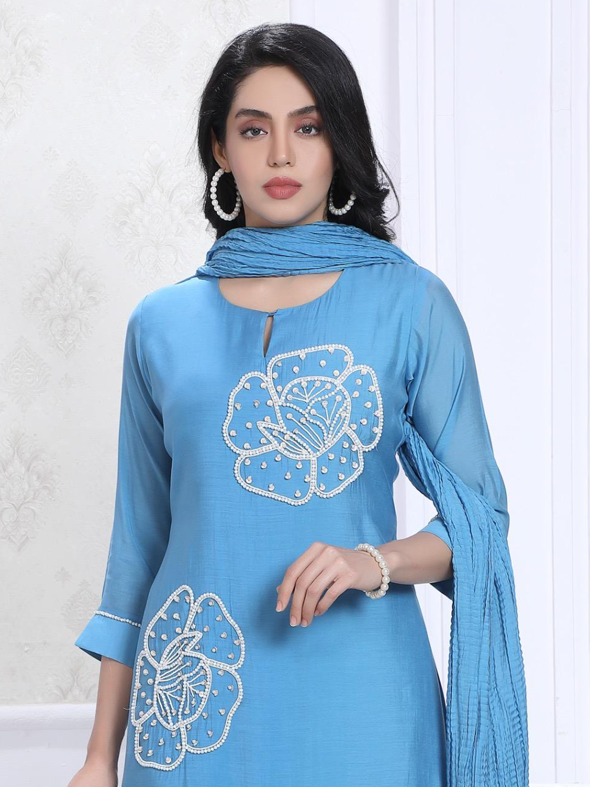 This sky blue silk kurti set is beautifully decorated with thread work, pearls, sequins and beads work. Featuring a stylish keyhole neckline and quarter sleeves, it is paired with pants and a dupatta. A perfect festive ensemble that blends elegance with subtle sparkle.