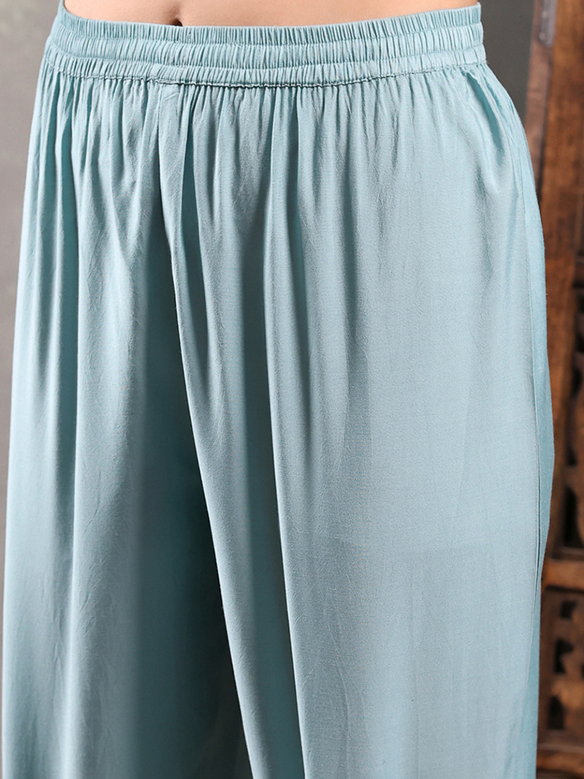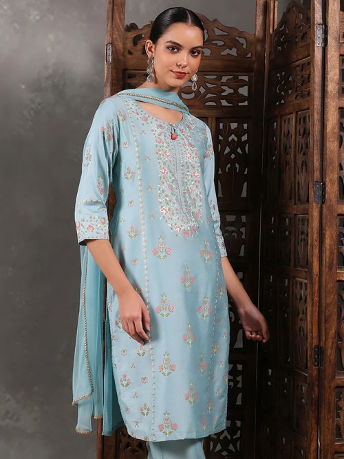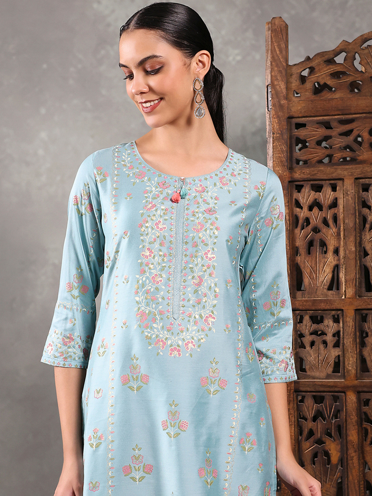 Elevate your festive style with this sky blue silk printed kurti set. Designed with a round neckline and quarter sleeves, it is paired with matching pant and dupatta for a look that is graceful, comfortable, and perfect for cultural gatherings or family occasions.