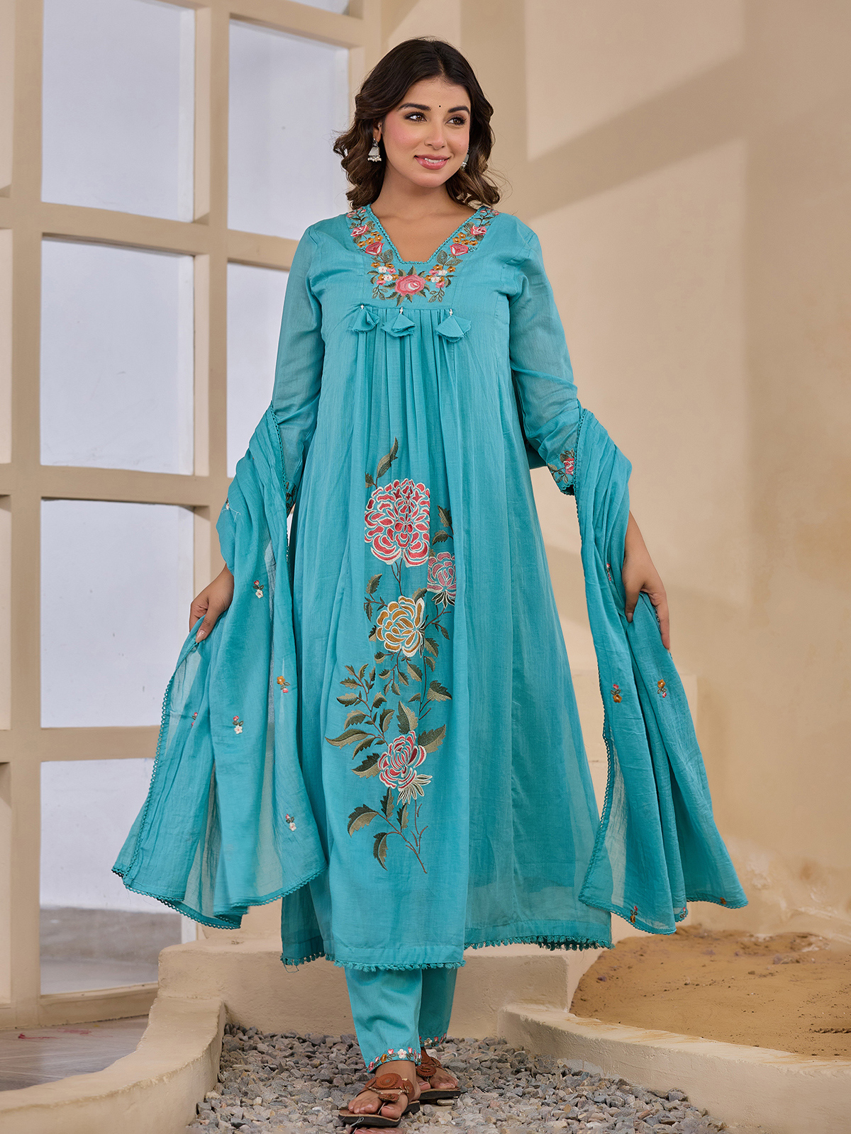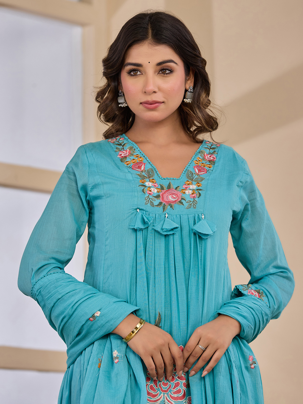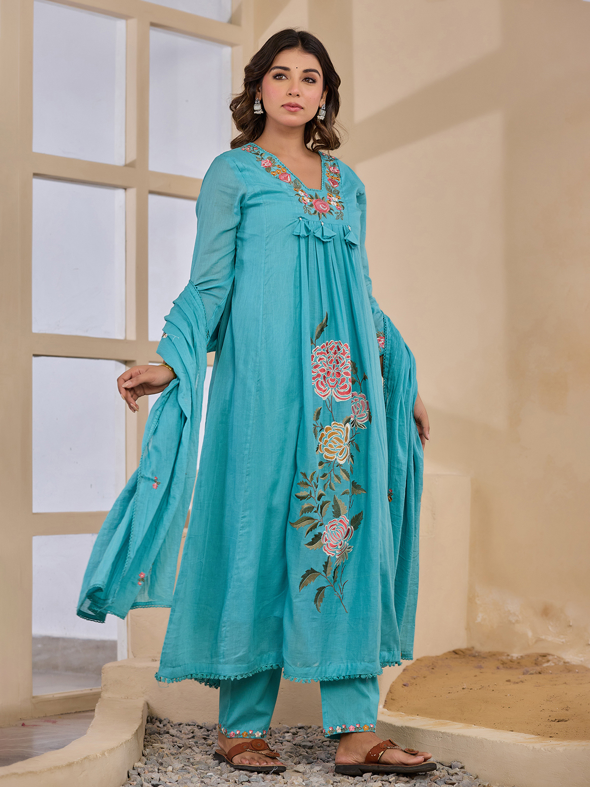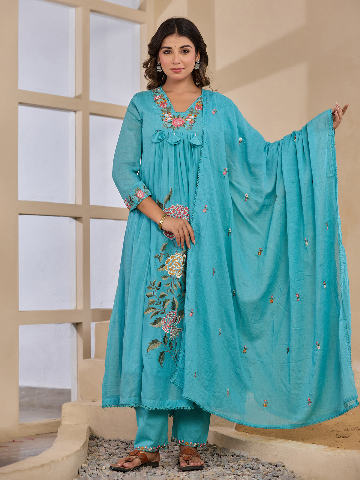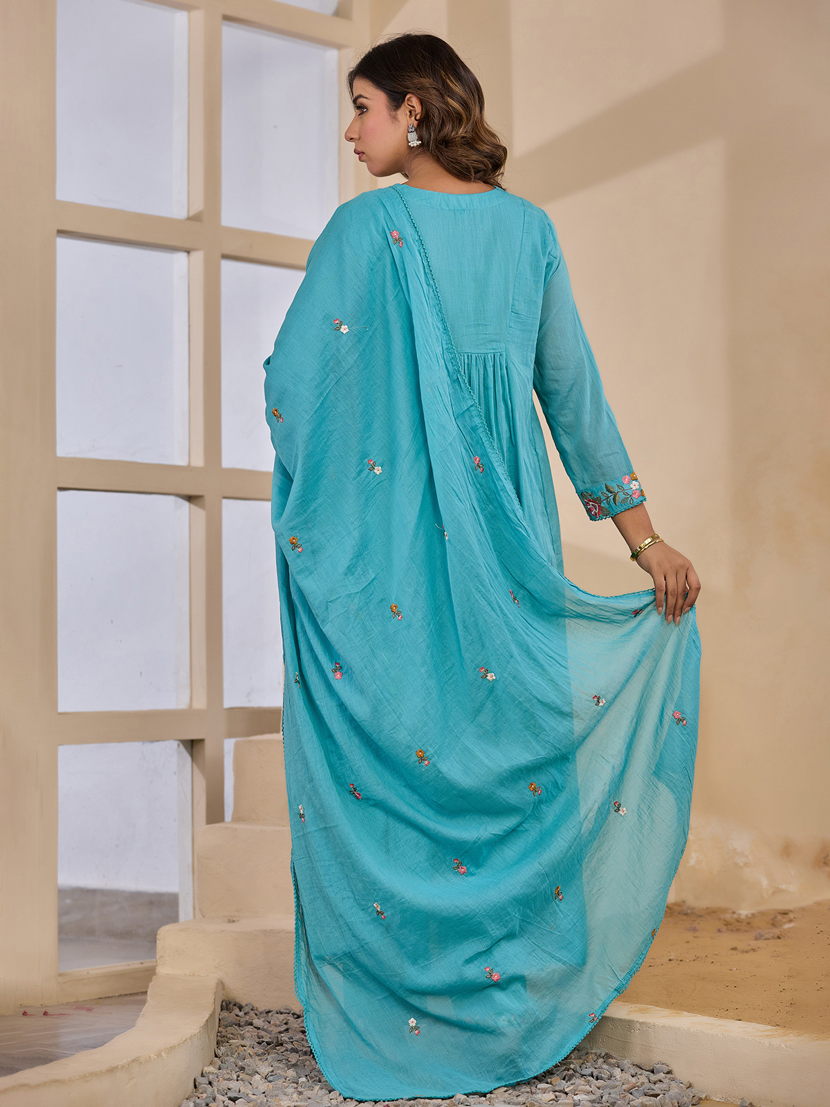 Emanating calm charm, this light blue cotton silk kurti set is adorned with fine embroidery. With quarter sleeves, straight pants, and a graceful dupatta, it’s the ideal pick for daytime festivities and serene gatherings.