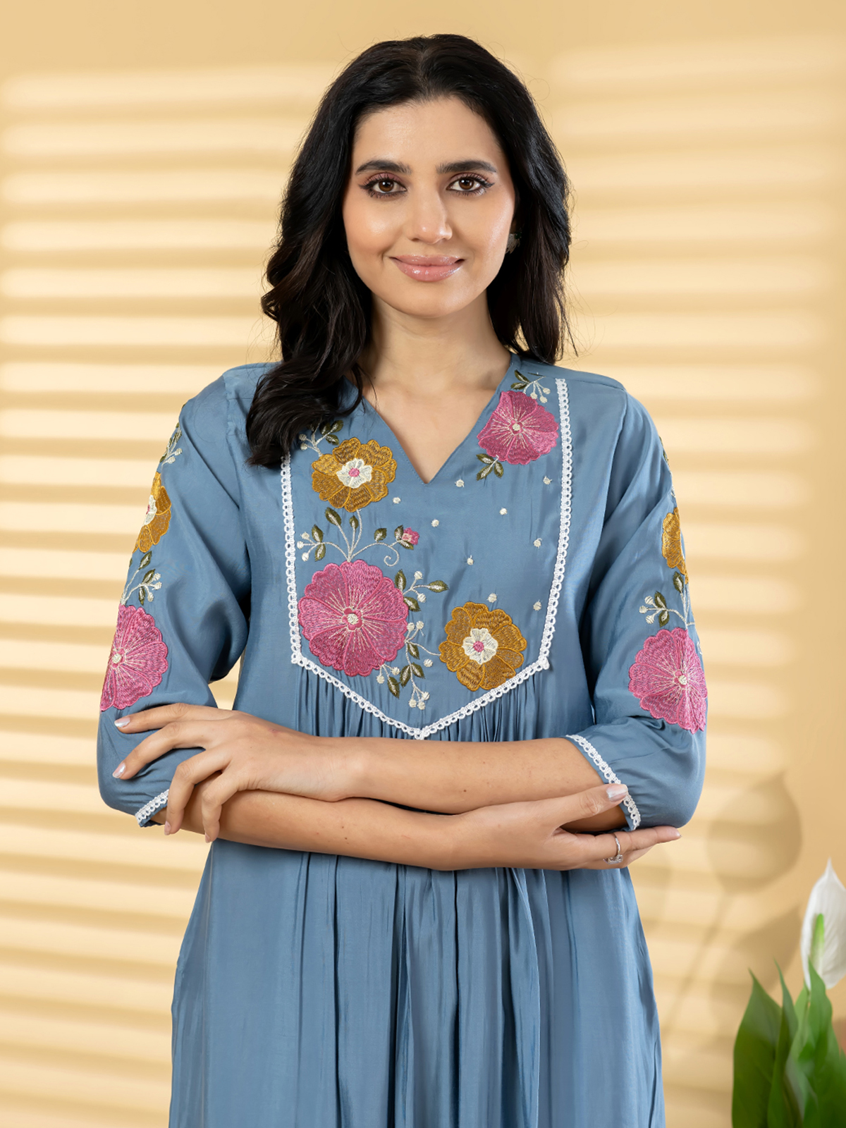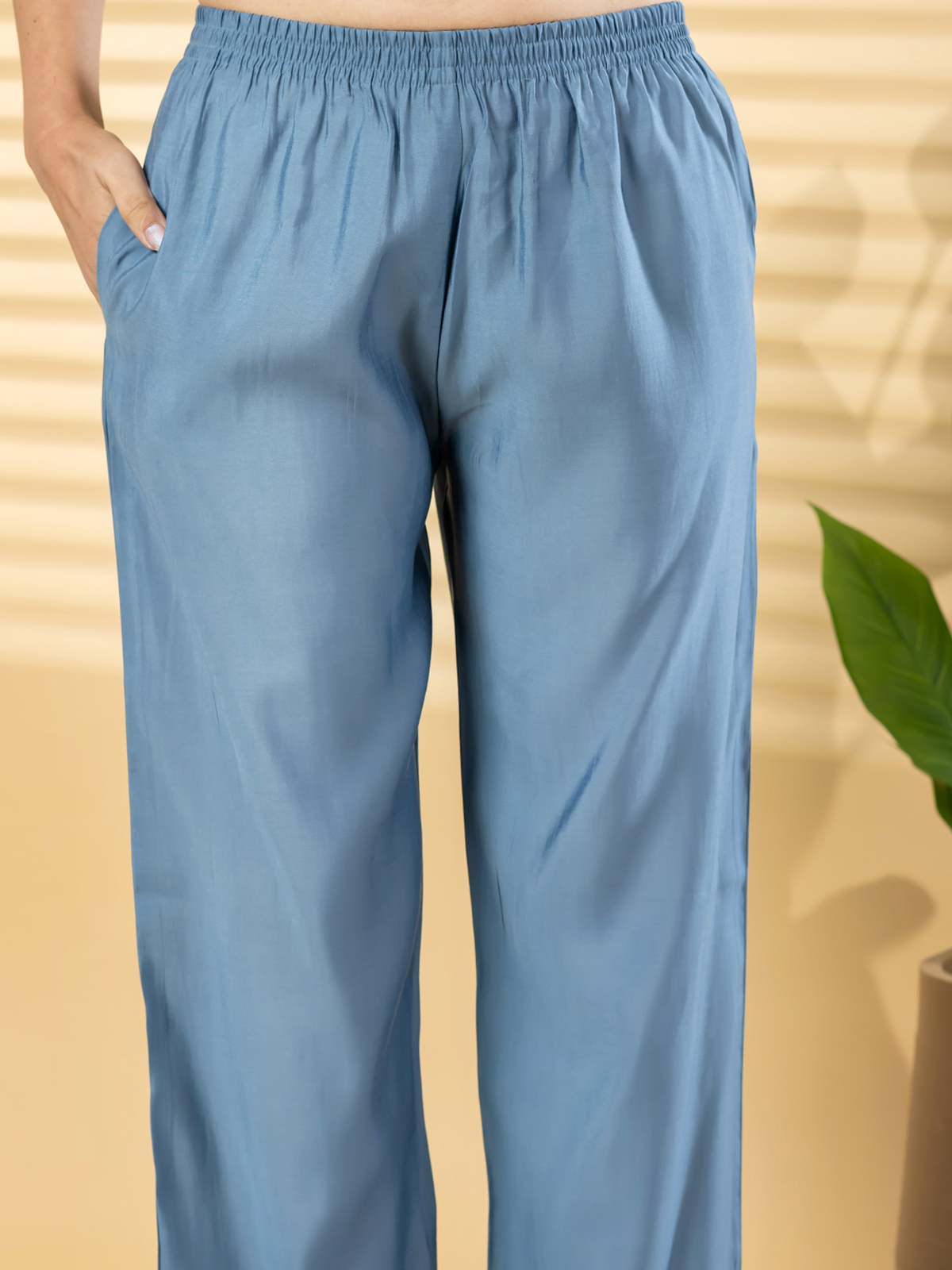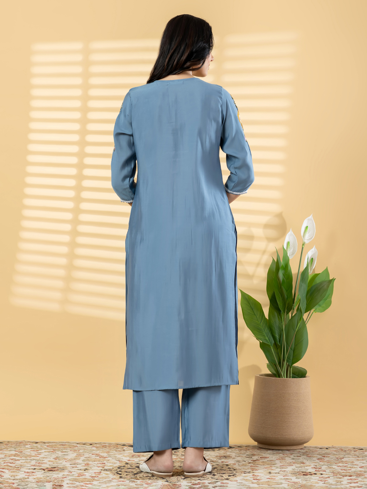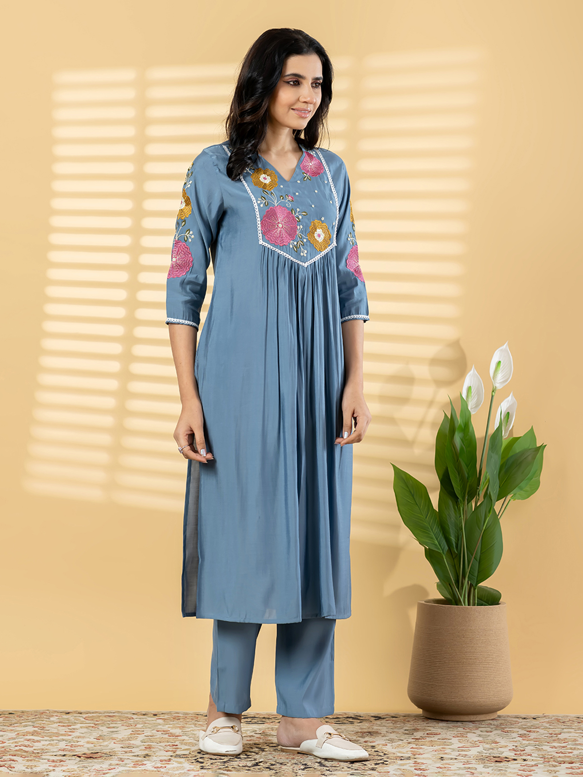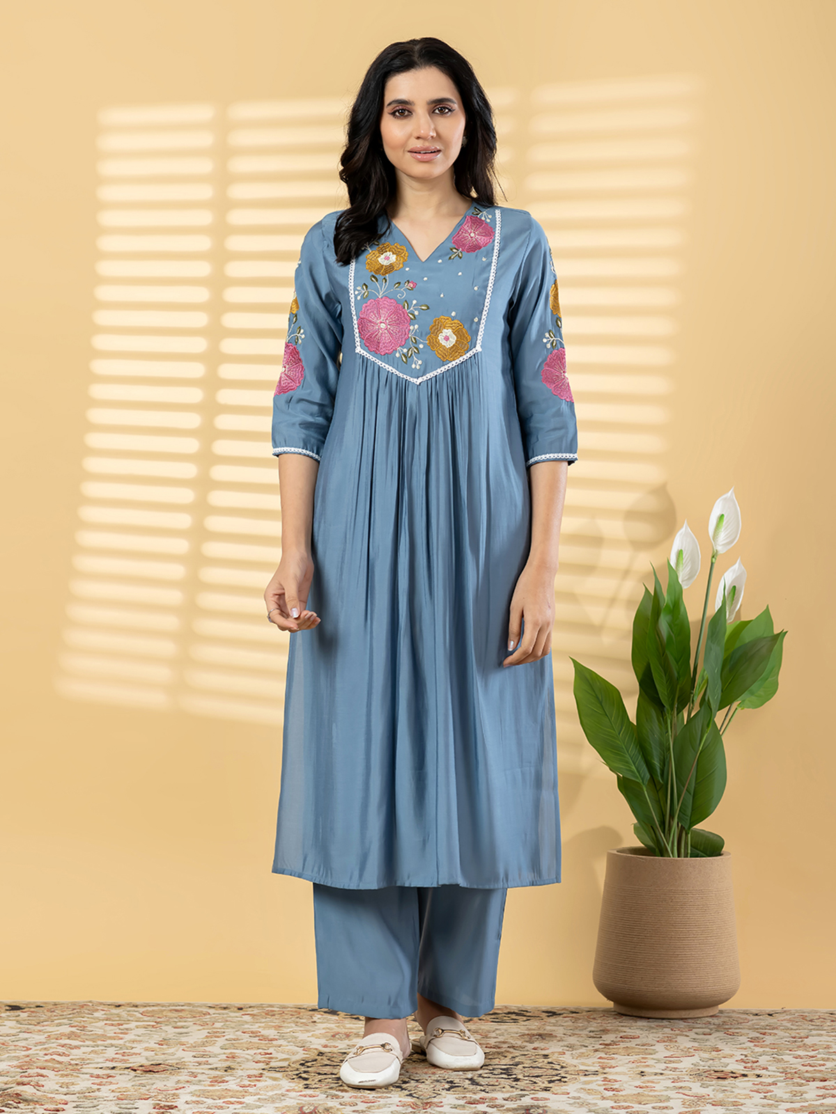 Designed for elegant celebrations, this stone blue cotton silk outfit showcases artistic surface detailing that enhances its sophisticated appeal. The V-shaped neckline and structured silhouette create a refined look, complemented by comfortable pocketed trousers. Ideal for festive evenings and cultural functions, it blends modern tailoring with timeless ethnic aesthetics.