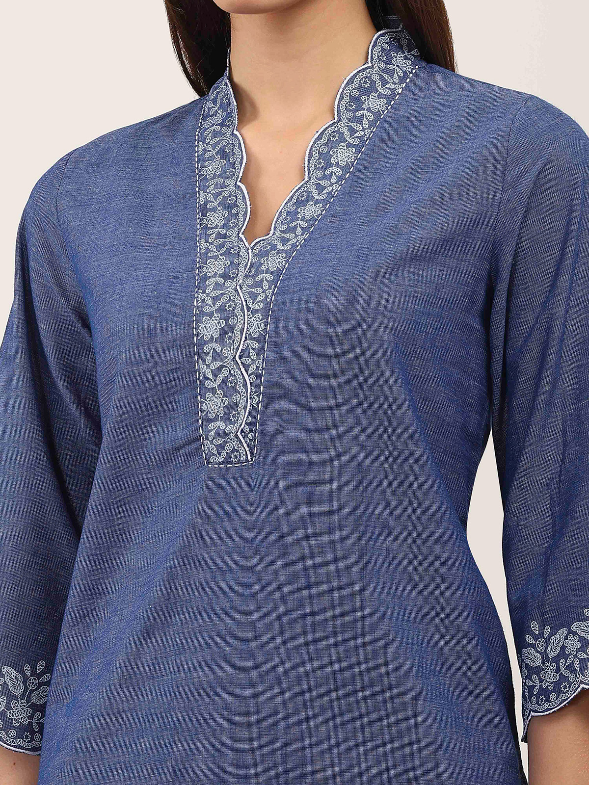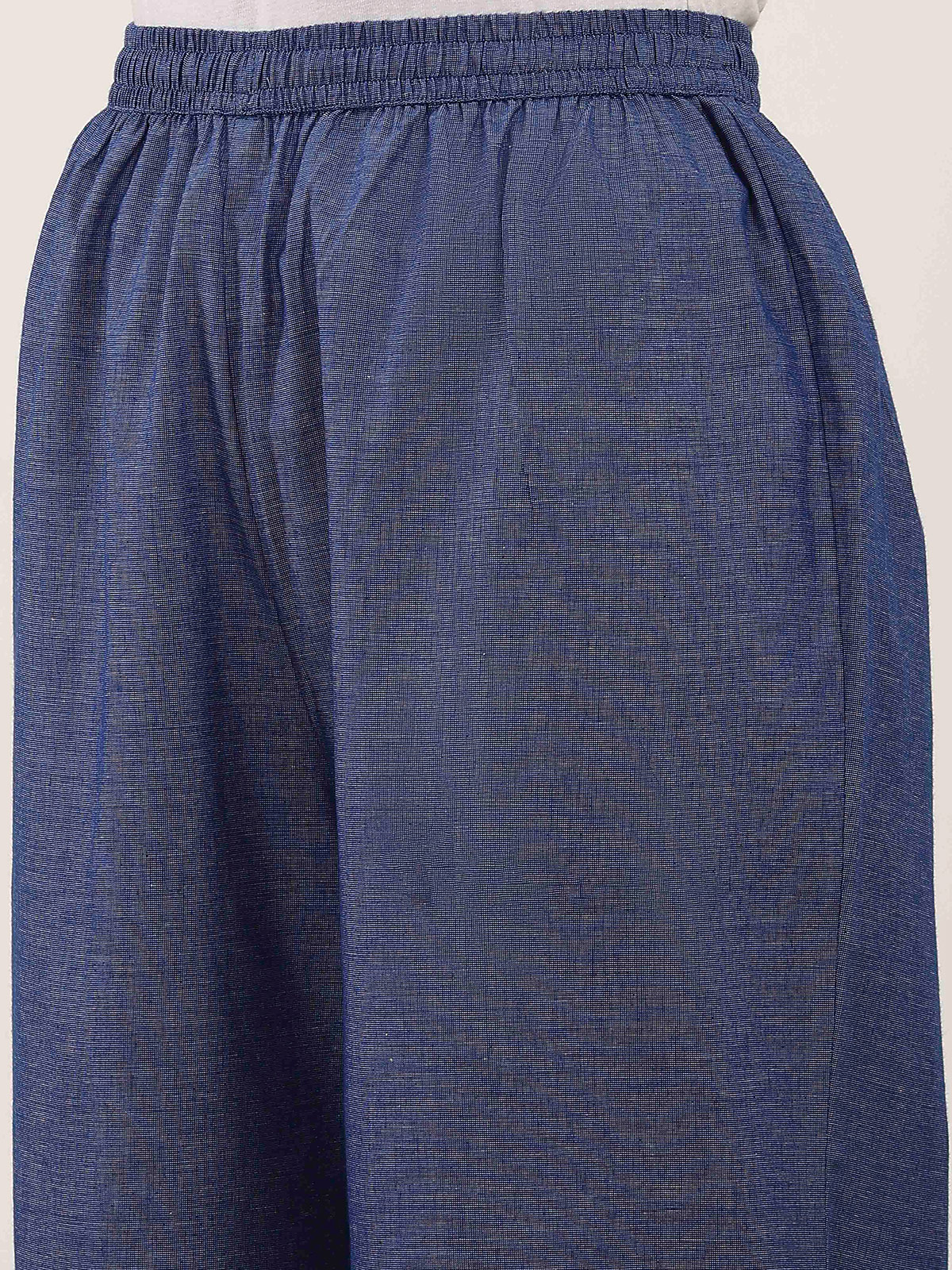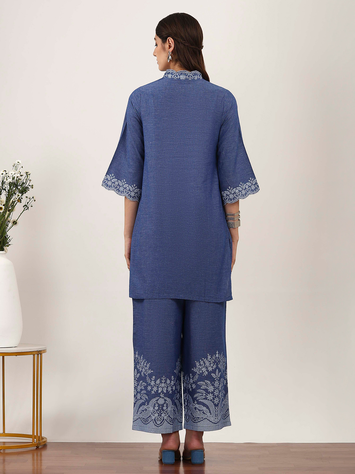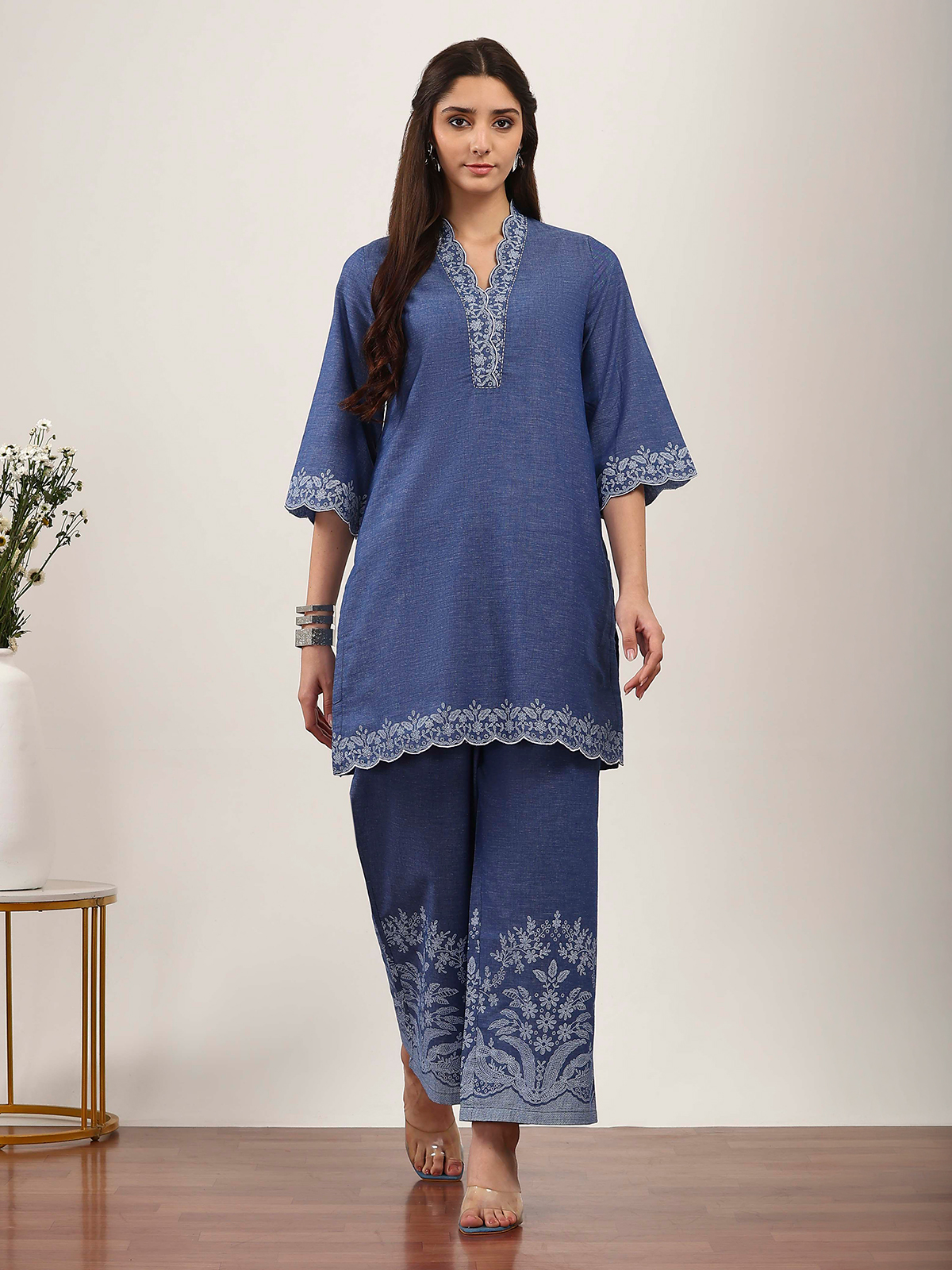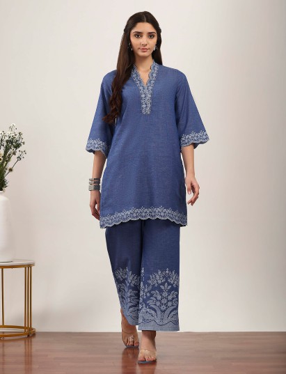 This stone blue silk kurti set features minimal printed accents that create understated elegance. Styled with a V neckline and quarter sleeves, it delivers a clean, modern silhouette. Paired with matching pants, it is ideal for office-friendly wear, casual outings, and everyday comfort.