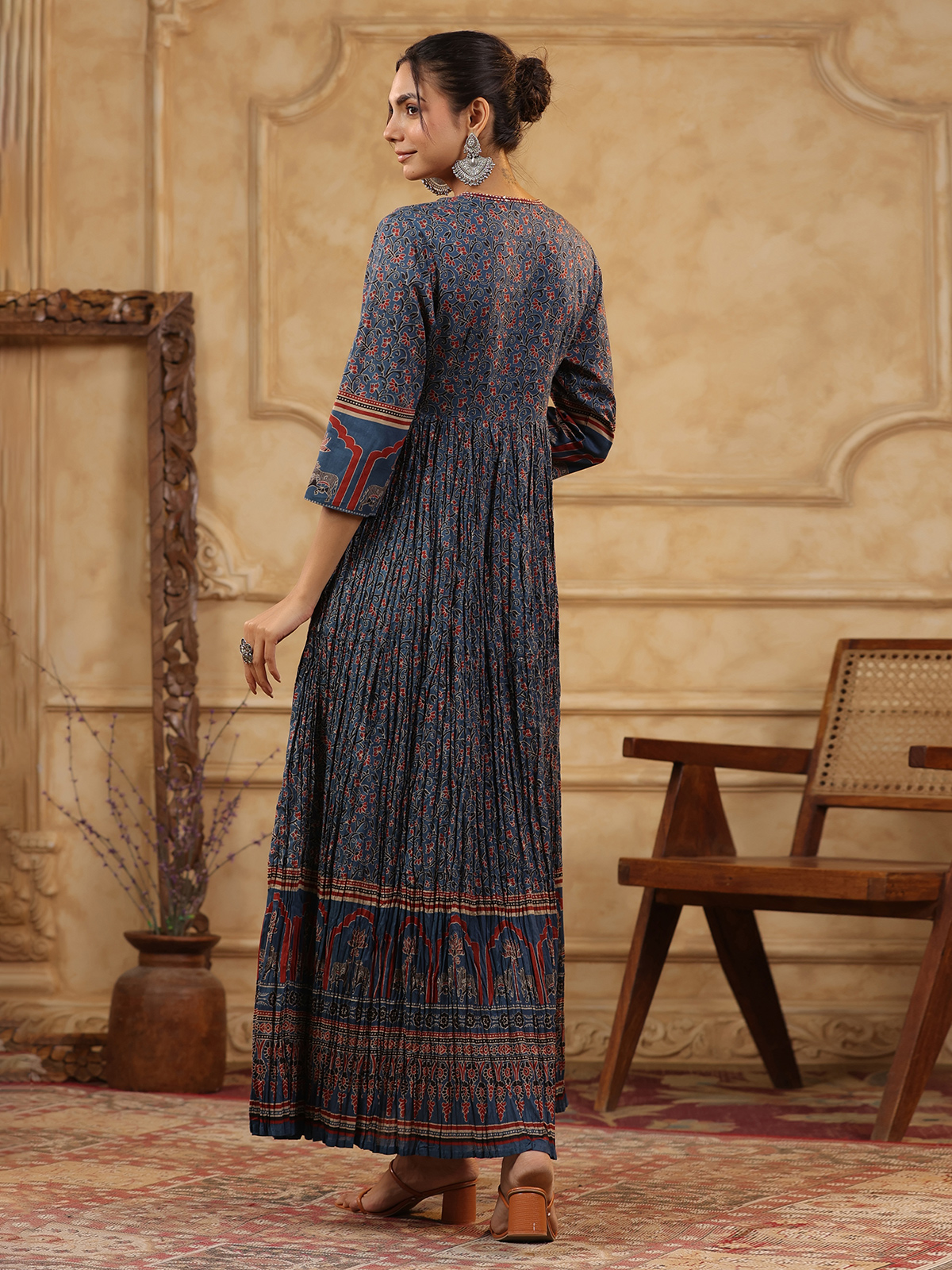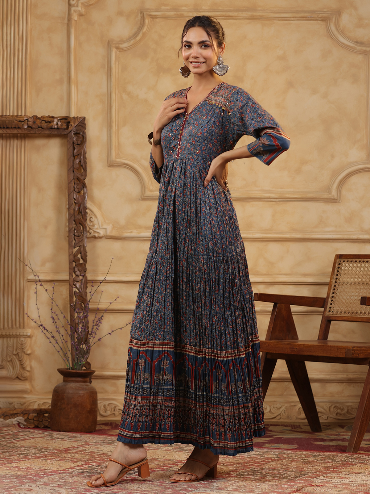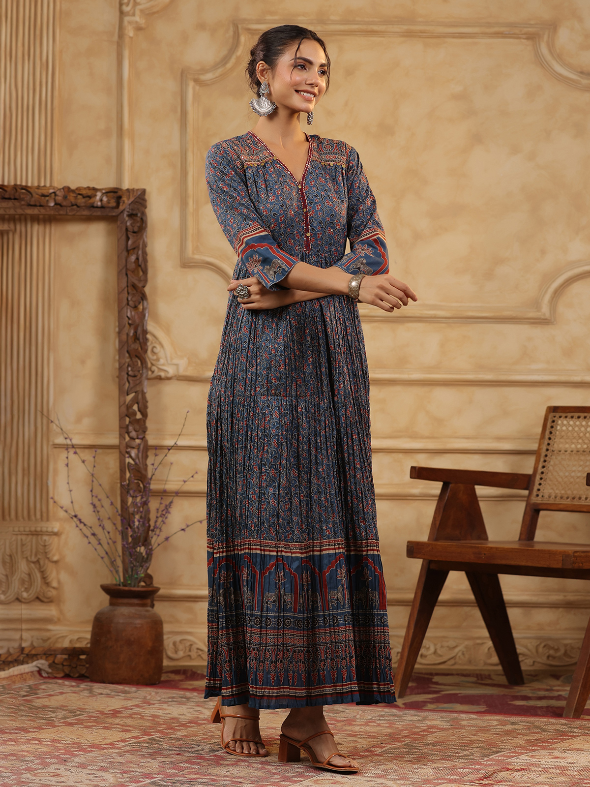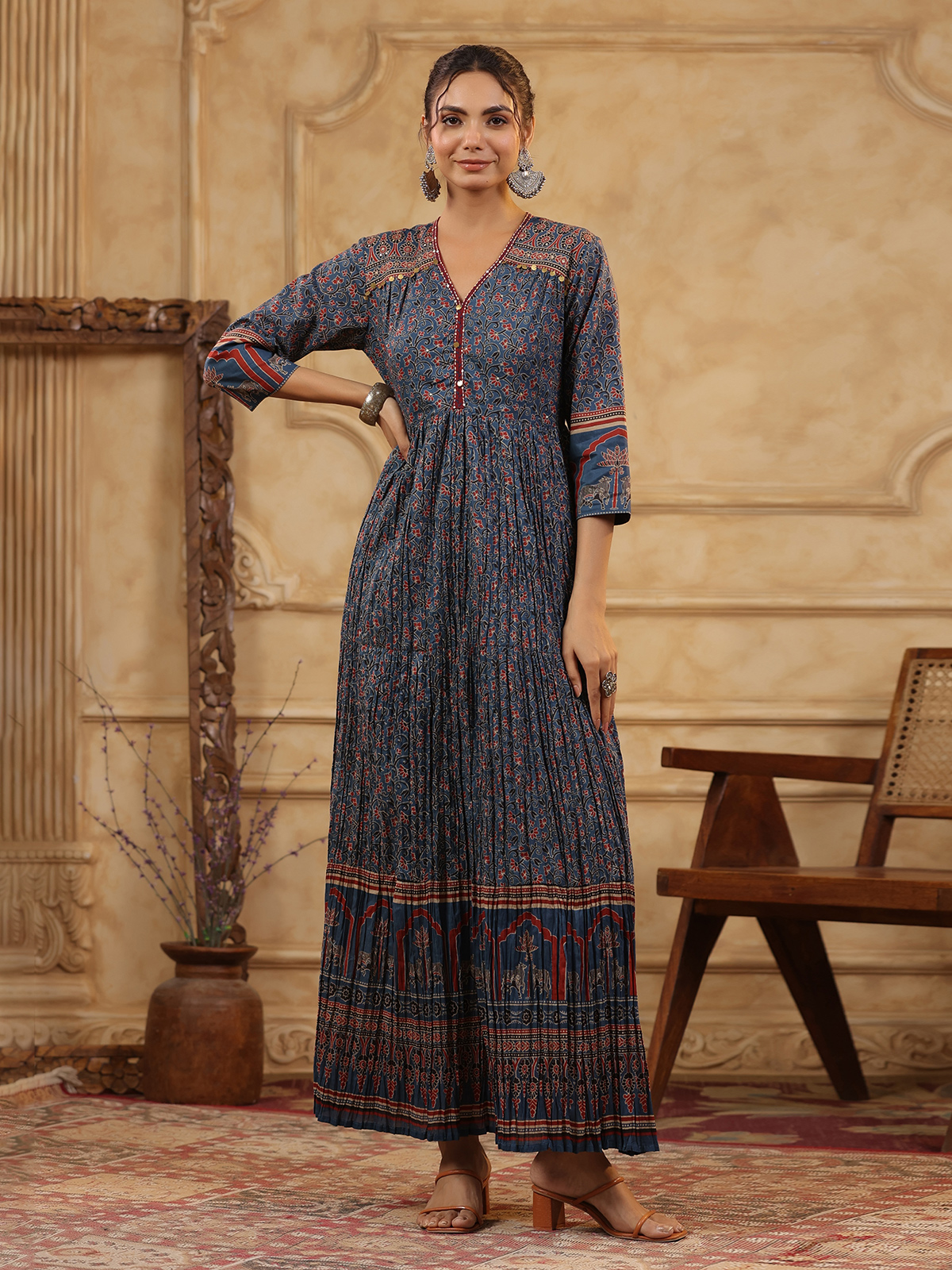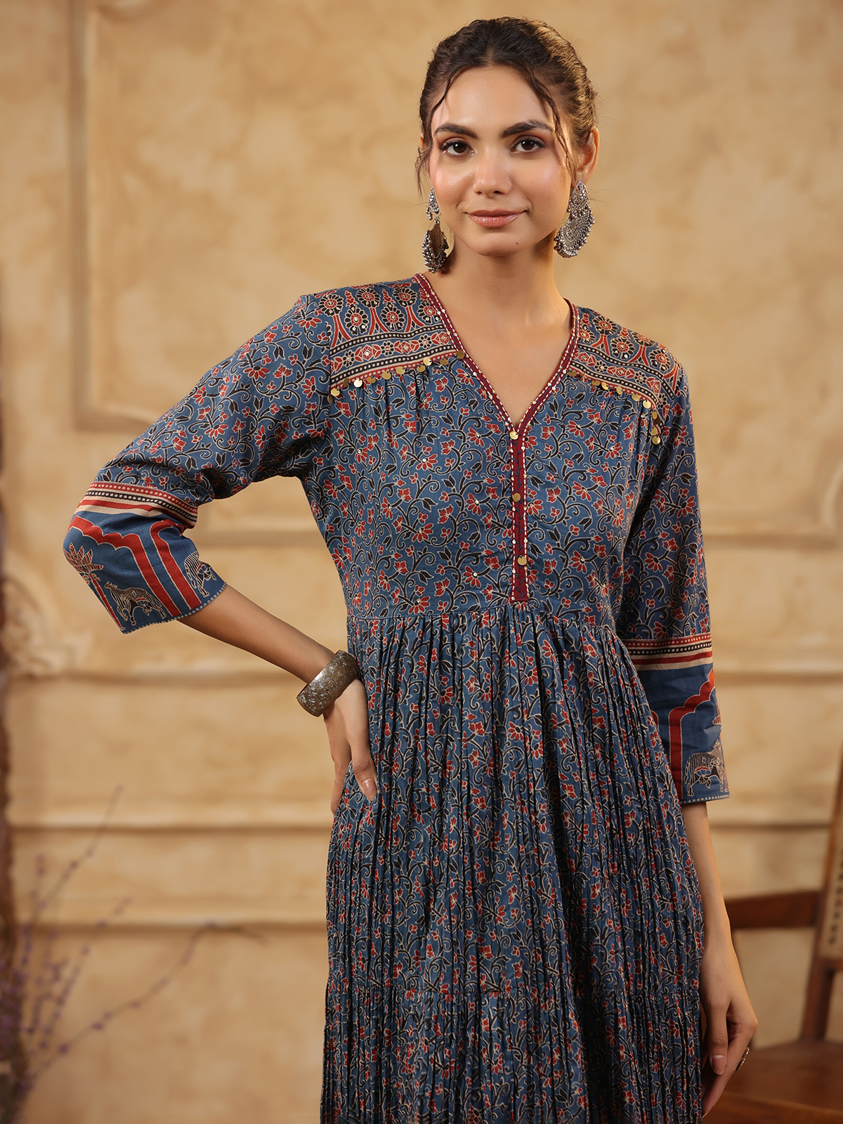 Elegant and striking, this stone blue silk kurti set features intricate prints, delicately enhanced with sequins, beads, and coin accents. Styled with a V-neck and quarter sleeves, it brings a subtle yet radiant charm to festive gatherings and traditional occasions alike.