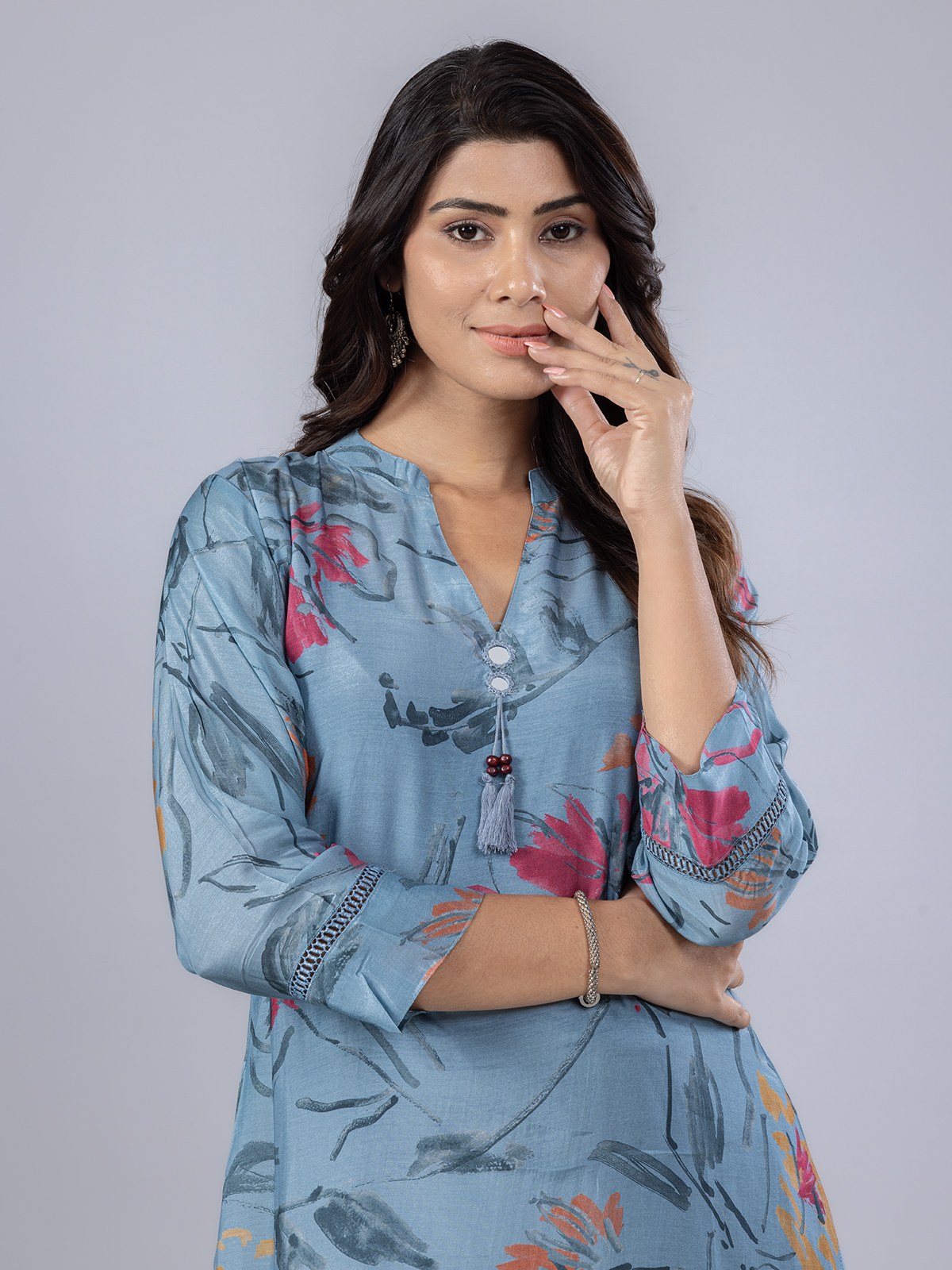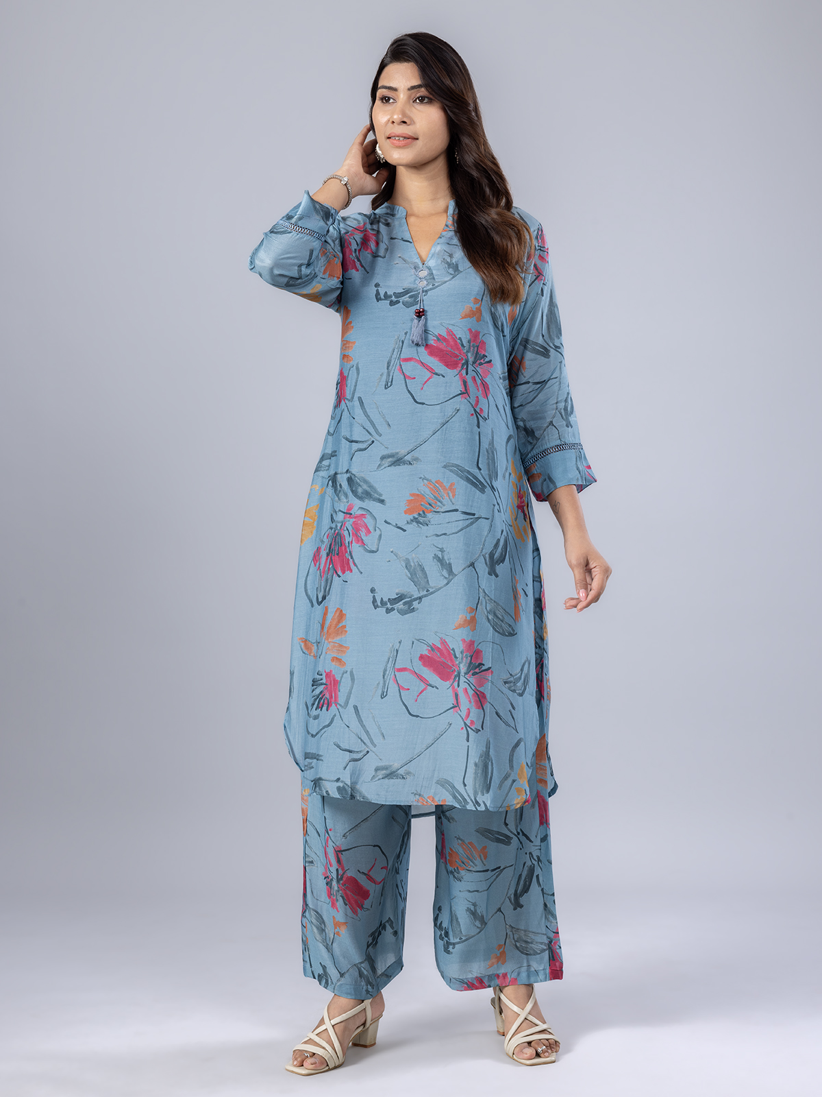 Celebrate in elegance with this stone blue silk kurti set, designed with chic floral prints. Featuring a stylish collar neckline and quarter sleeves, it perfectly balances sophistication with comfort. Completed with a matching palazzo bottom, this ensemble is ideal for festive occasions, radiating class and modern ethnic charm.