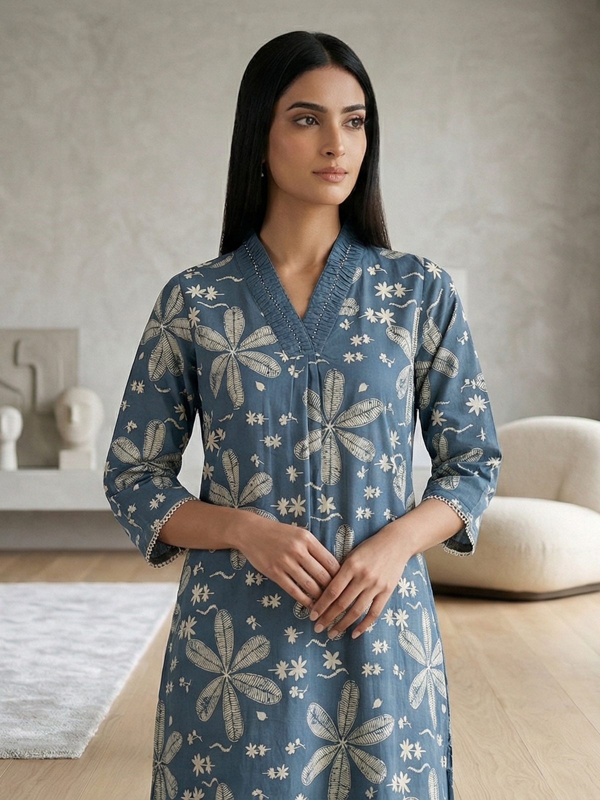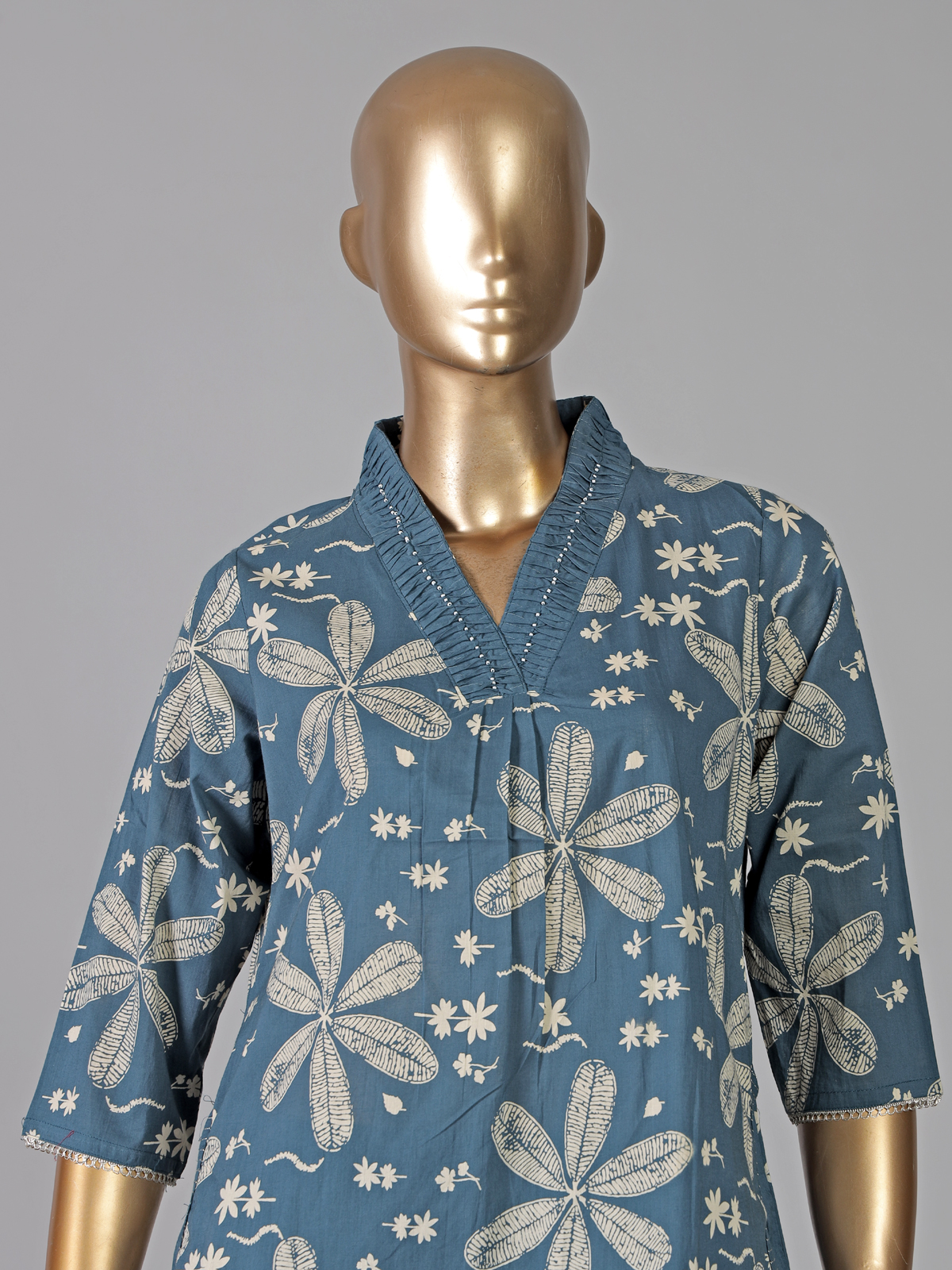 Modern and subtle stone grey cotton silk kurti set is ideal for everyday elegance. Designed with a V neckline and quarter sleeves. It features delicate floral prints. Paired with pants, it offers a refined and comfortable casual festive style.
