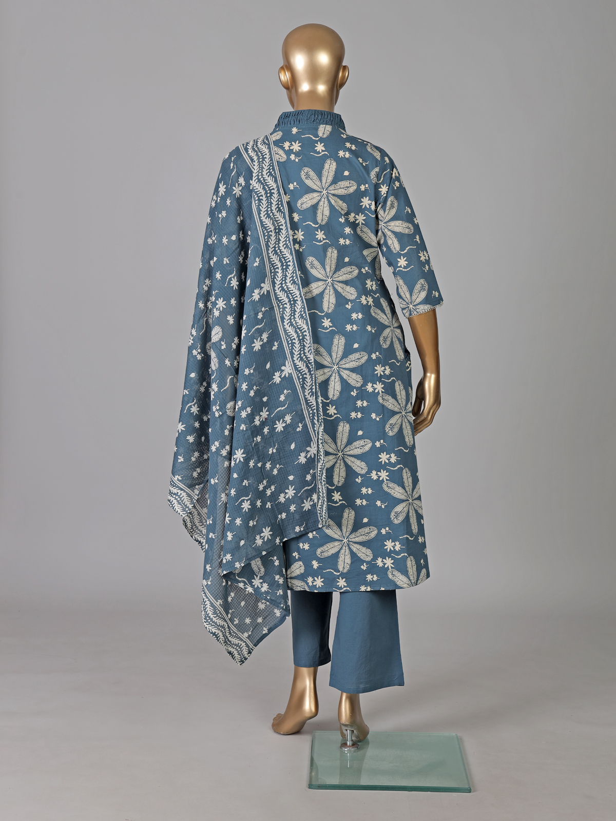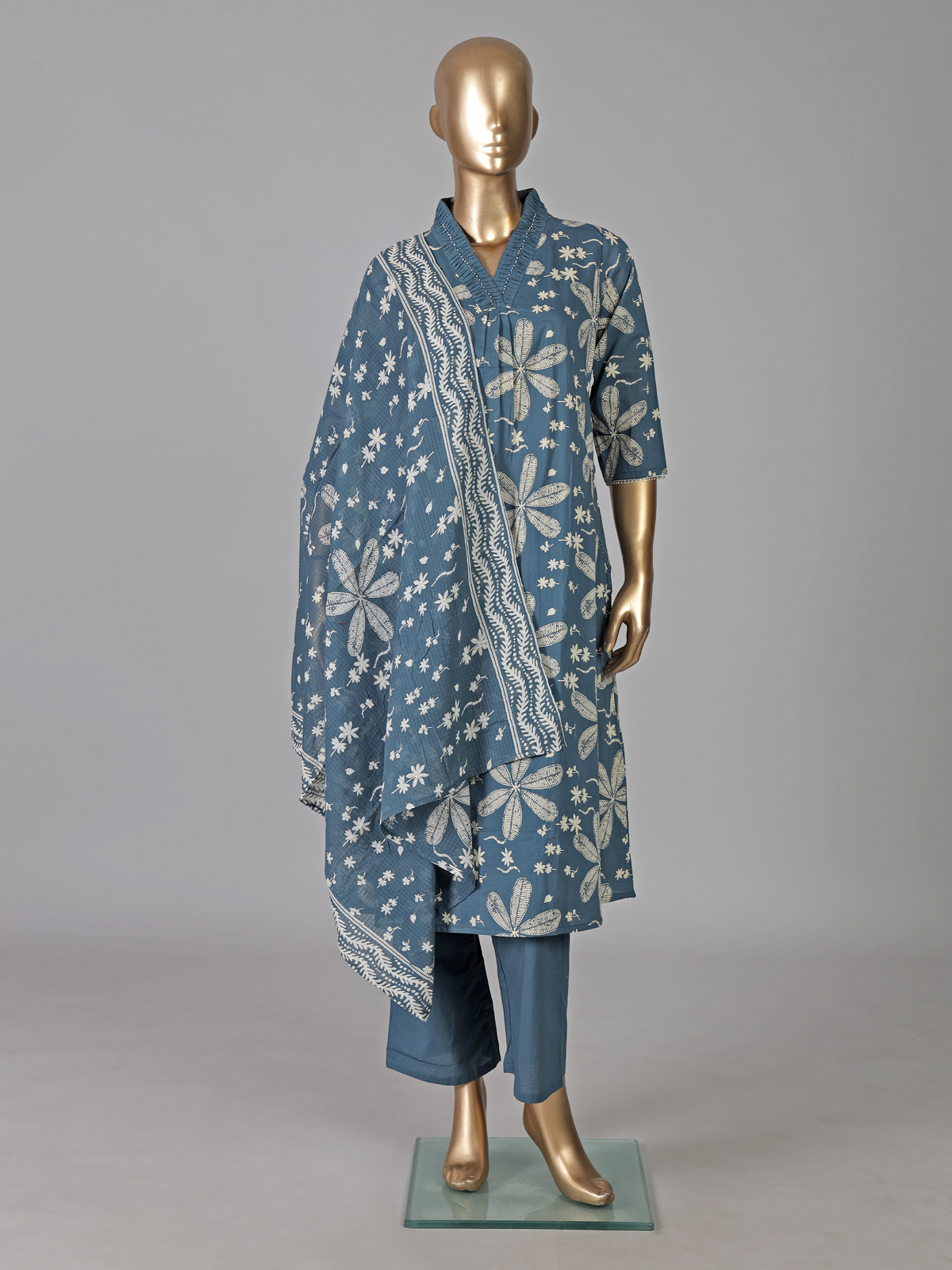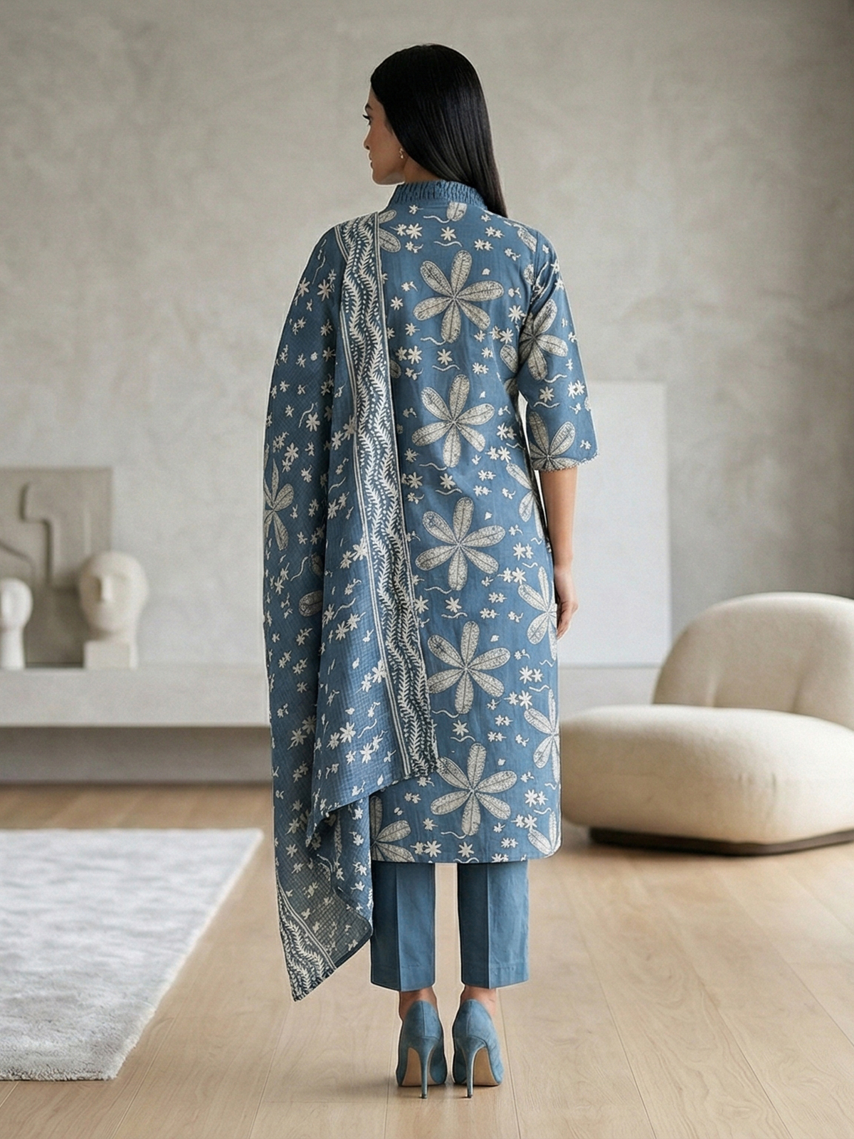 Stone Grey Cotton Silk Floral Printed Casual Kurti Set