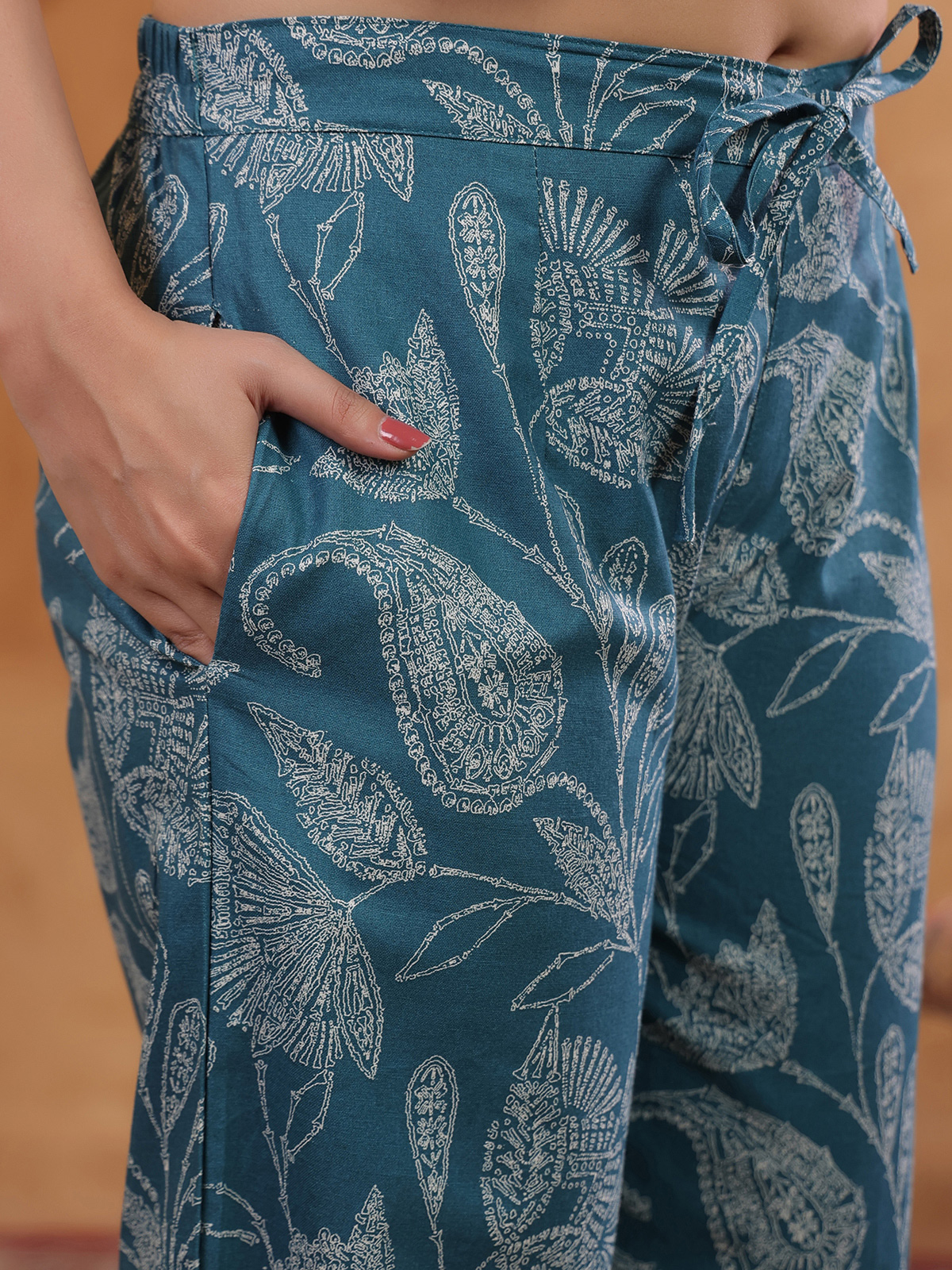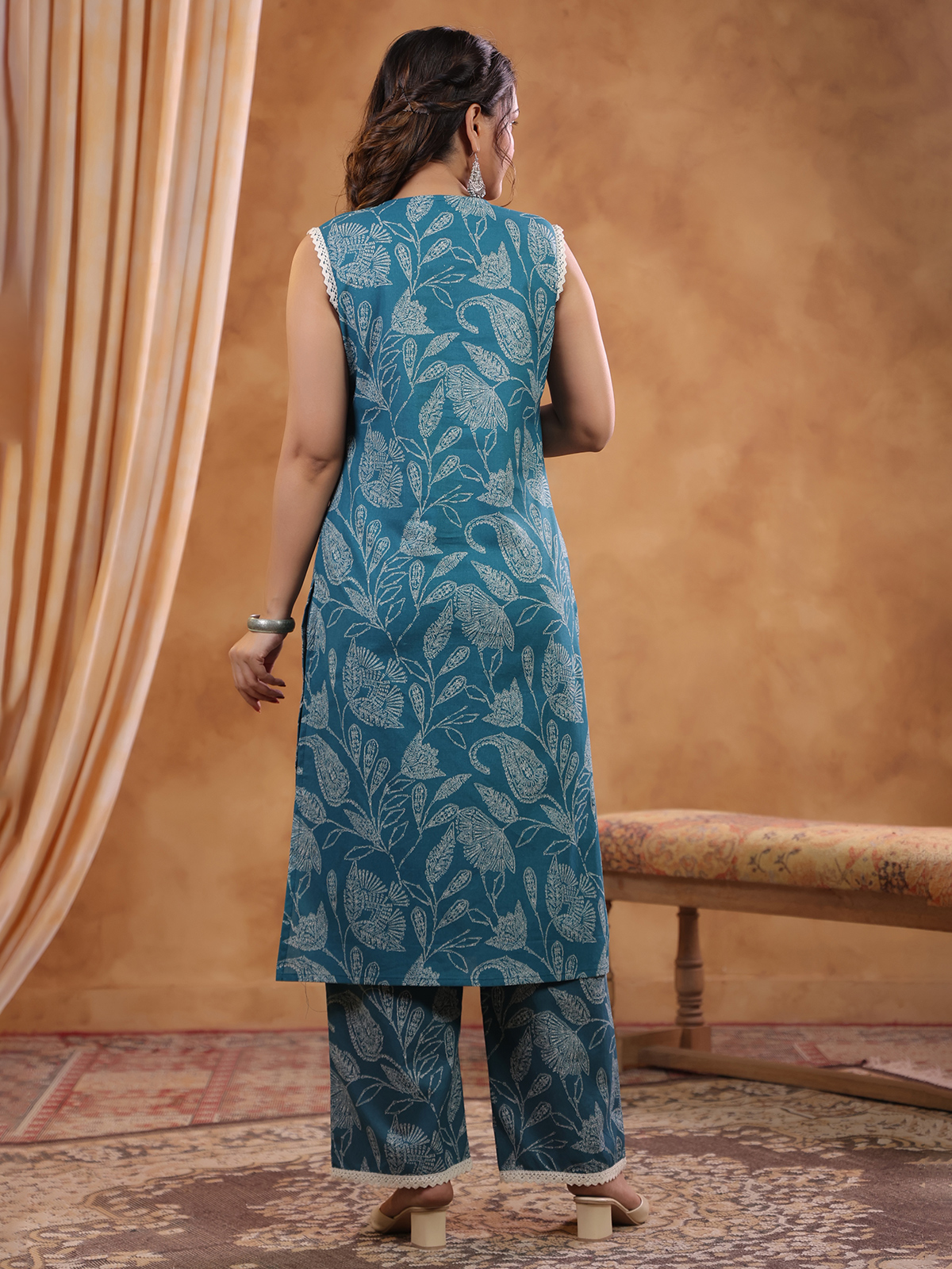 A chic addition to your casual wear, this teal blue printed cotton kurti set brings a classy vibe. Designed with a modern V-neckline and a sleeveless pattern, it comes with matching pants for a complete, stylish look.