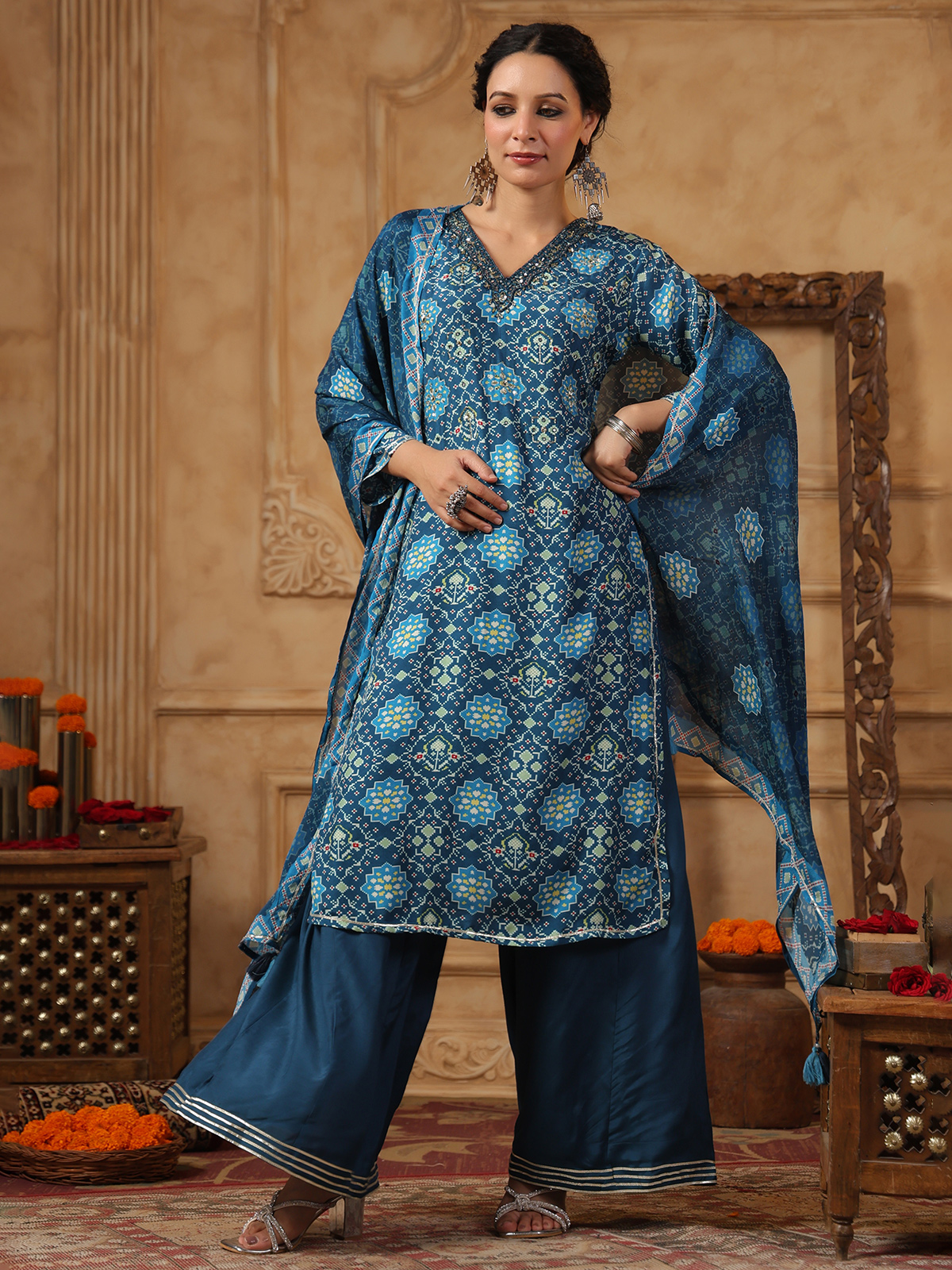 Add a stylish teal blue printed cotton silk kurti set to your closet to give it a makeover. It features a V neck, quarter sleeves, with elaborate mirror, cutdana, sequin, and beadwork. It's a great option for casual attire.