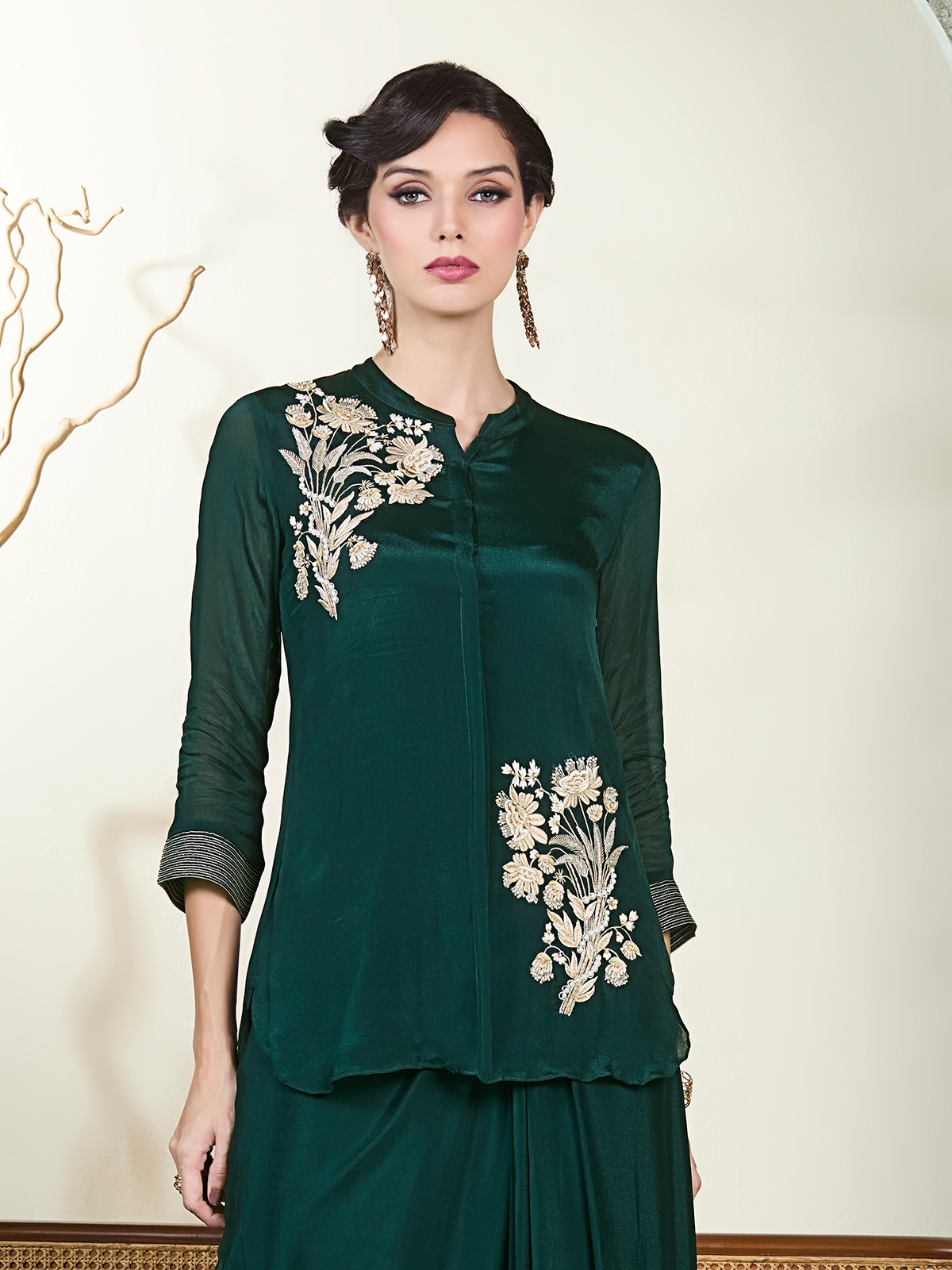 This teal green silk indo-western set features detailed embroidery highlighted with sequins, beads, and cutdana for a rich festive glow. The quarter sleeves give it a refined finish, making it a striking choice for weddings, mehendi events, and reception evenings where elegance and bold colour make the look stand out.
