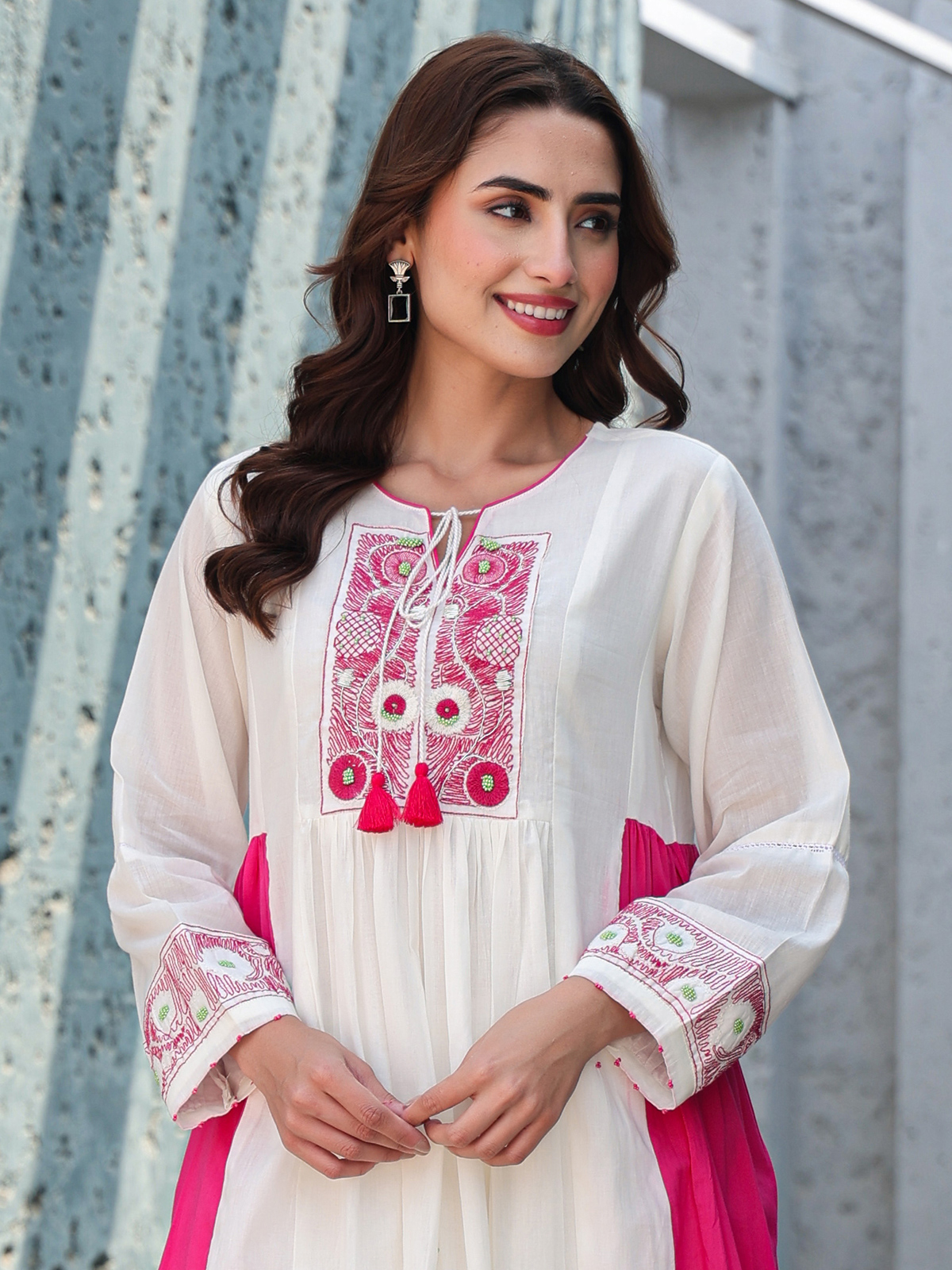 White And Pink Cotton Kurti Set For Women Festive Wear