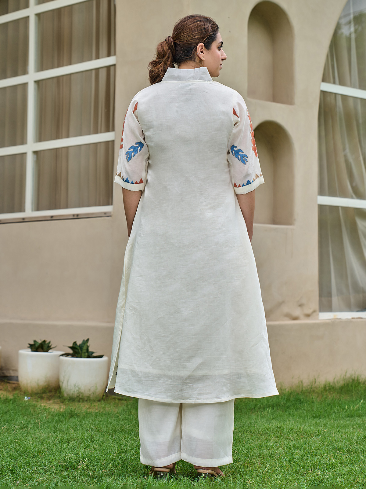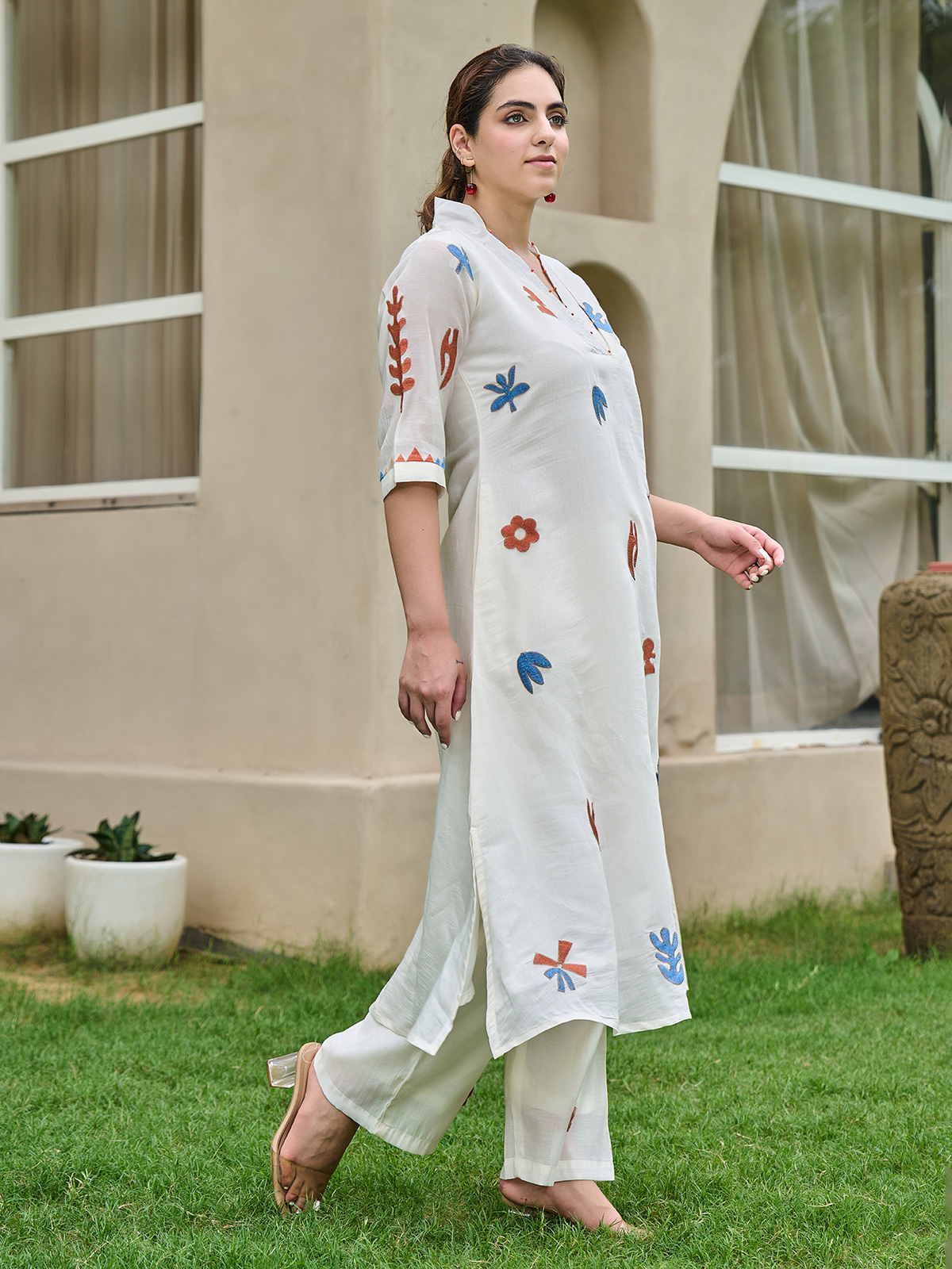 Bright and minimalist, this white cotton kurti set features subtle thread work that flows like poetic lines. Designed with a V-neckline and quarter sleeves, it comes with coordinated pants, offering a modern yet elegant ensemble for festive occasions and family celebrations.