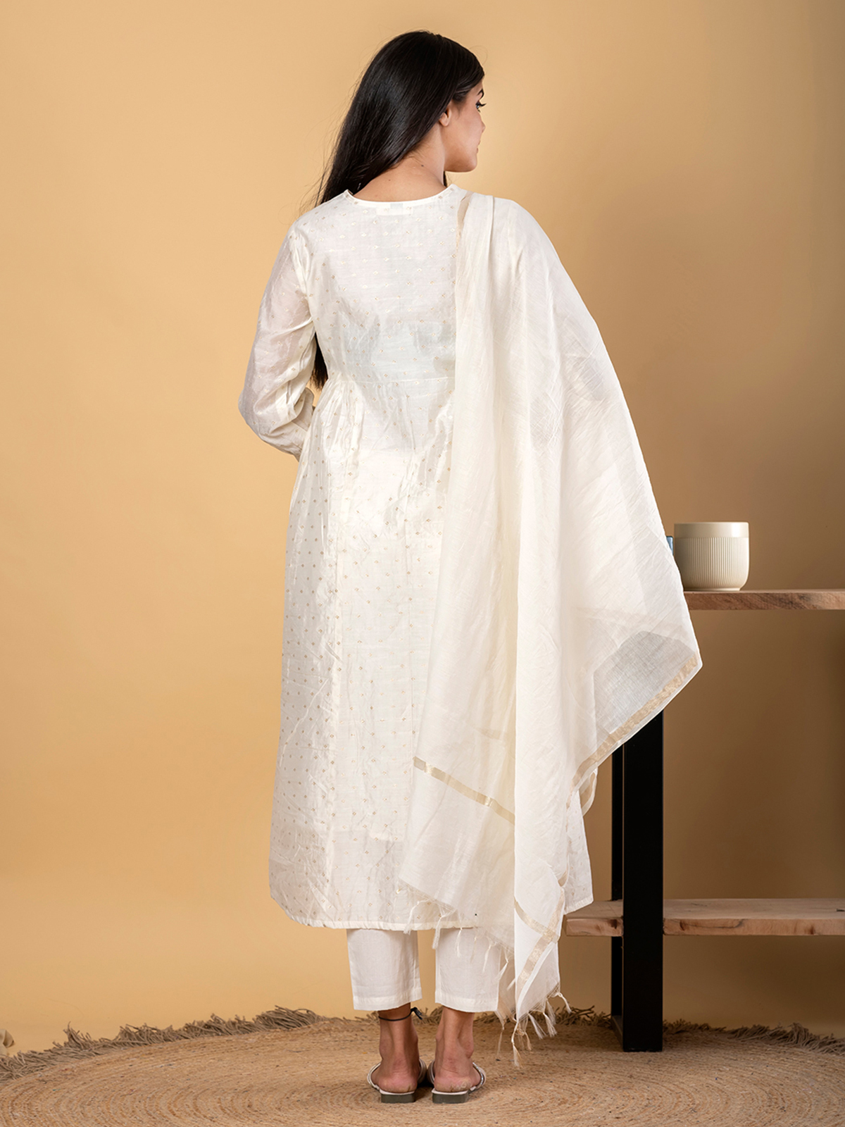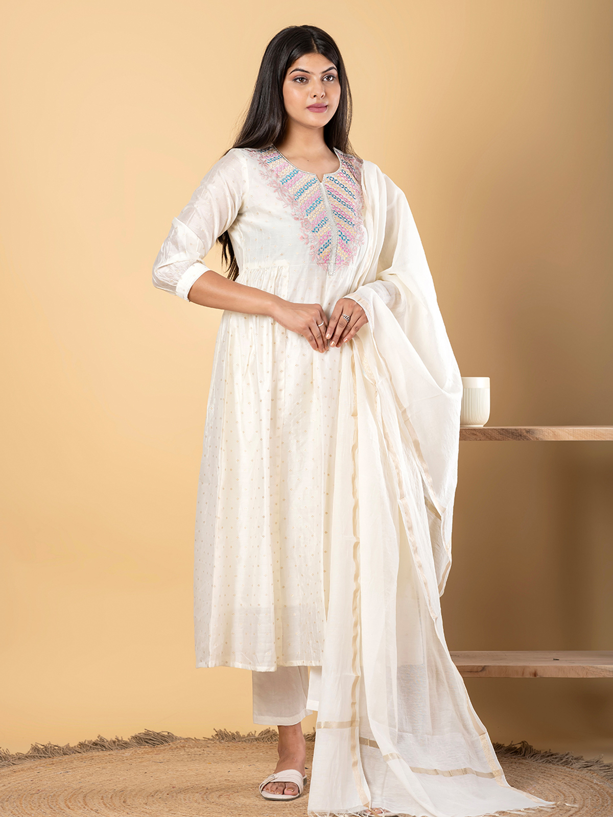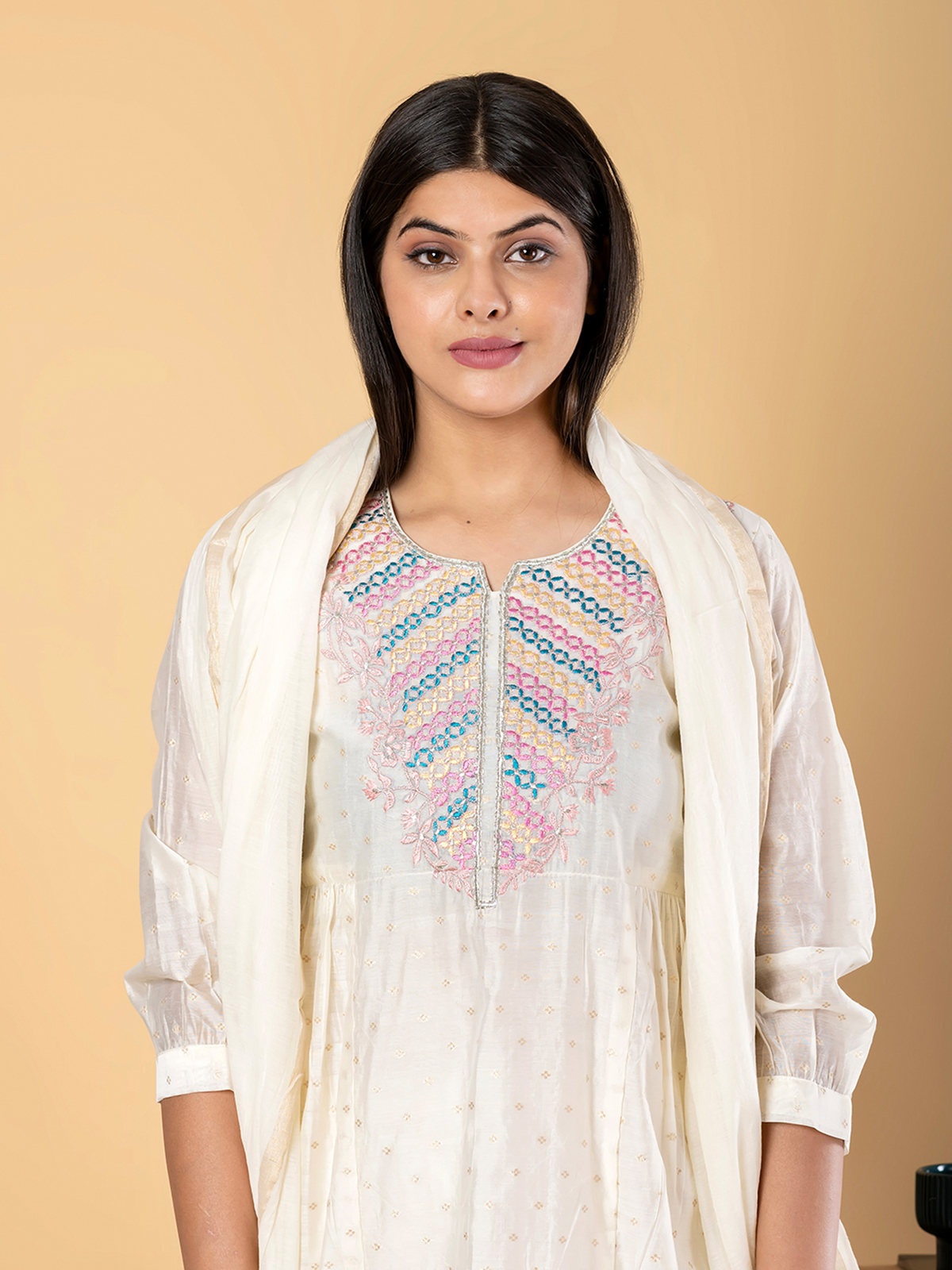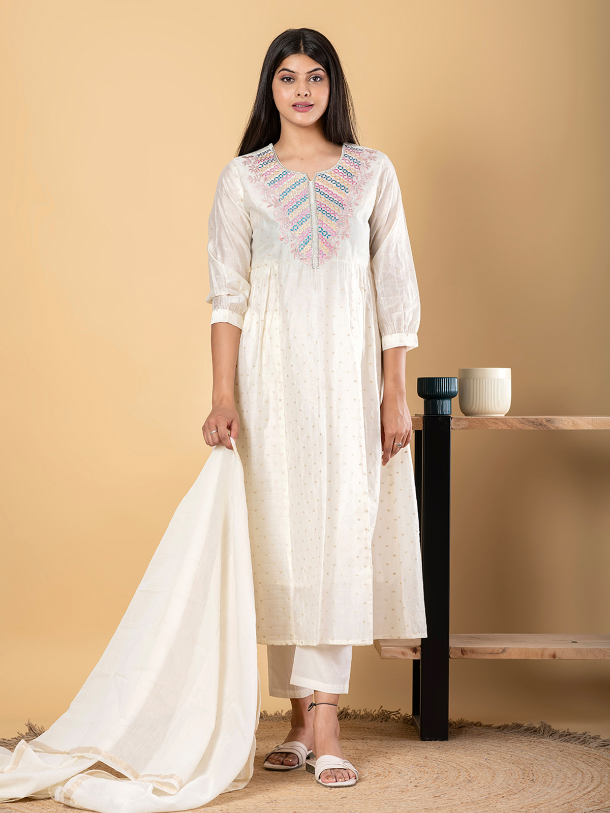 Soft white chiffon floats gracefully, enriched with embroidery and shimmering zari that glints like morning light. Featuring a round neckline and quarter sleeves, it is paired with coordinating pants and a dupatta, offering a delicate, airy ensemble perfect for festive celebrations with a touch of modern elegance.