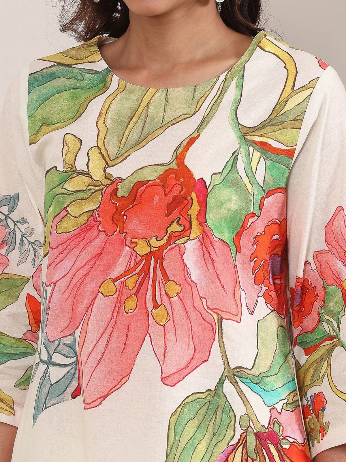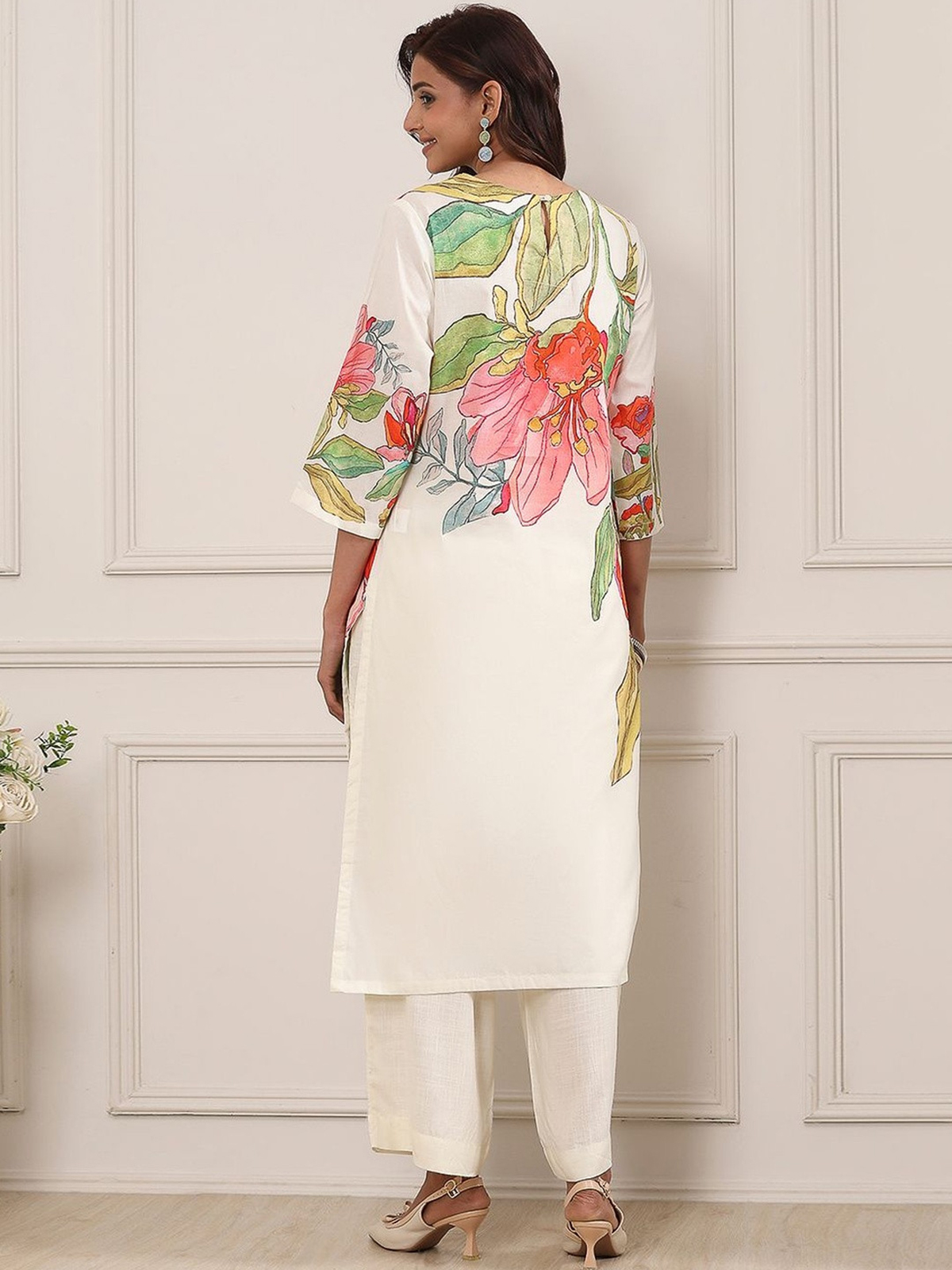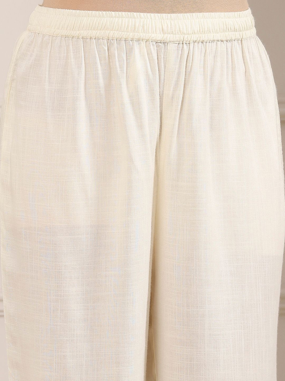 This white printed kurti set is a timeless festive essential crafted in smooth cotton silk fabric. Featuring a straight-cut silhouette, round neckline, and quarter sleeves, it offers a graceful and polished look. Paired with a matching palazzo, it is perfect for festive gatherings and daytime celebrations.