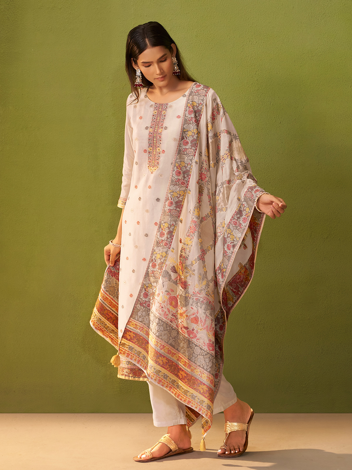 Festive charm glows through this white silk kurti set, styled with a round neckline and quarter sleeves. Sequins, zari, and beads glisten softly upon subtle printed textures, reflecting delicate artistry. Finished with matching pants and a flowing dupatta, the look exudes serene beauty and regal charm, perfect for joyful gatherings and timeless elegance.