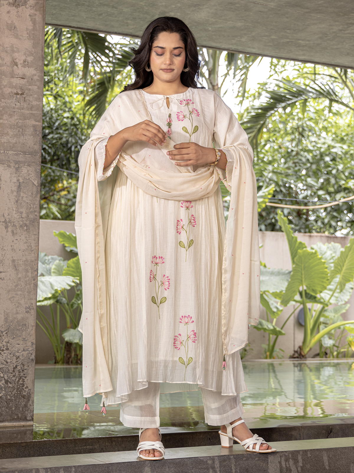 Combining cultural craftsmanship and contemporary style, the kurti set in vibrant white silk showcases fine thread, cutdana and beads work. Its keyhole neckline and quarter sleeves add refined simplicity. Paired with a comfortable pant and dupatta, it is ideal for both day events and evening celebrations.