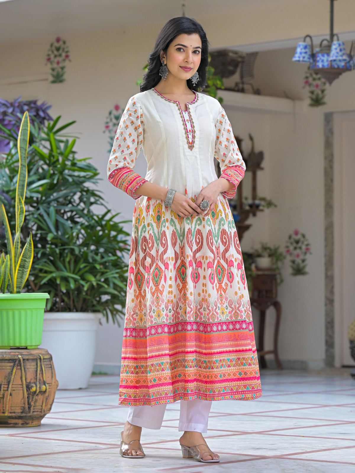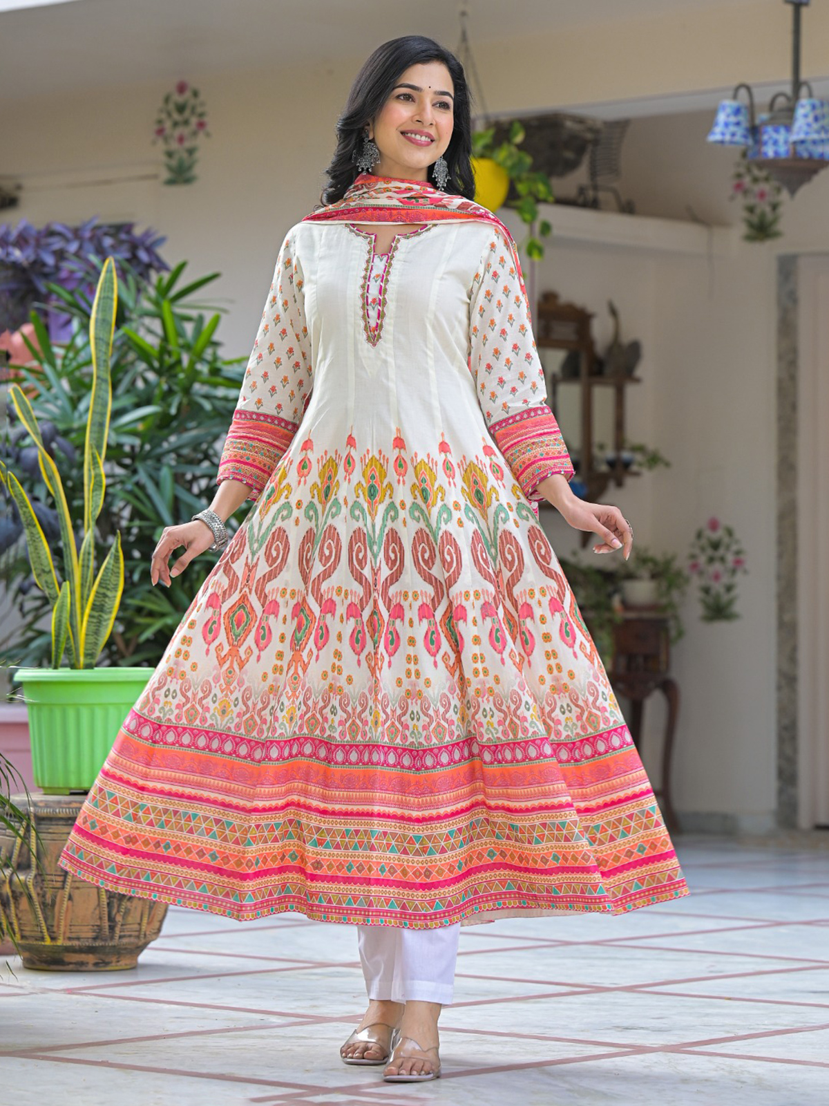 Chic and versatile, this white printed cotton silk suit is crafted with a quarter sleeve design and elegant dupatta. Embellished with delicate beads, it offers a polished yet relaxed feel perfect for daytime functions and family festivities.