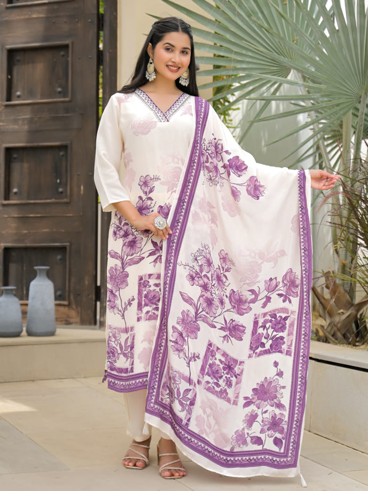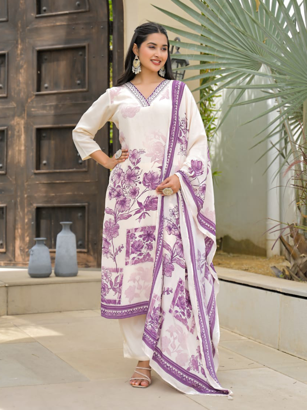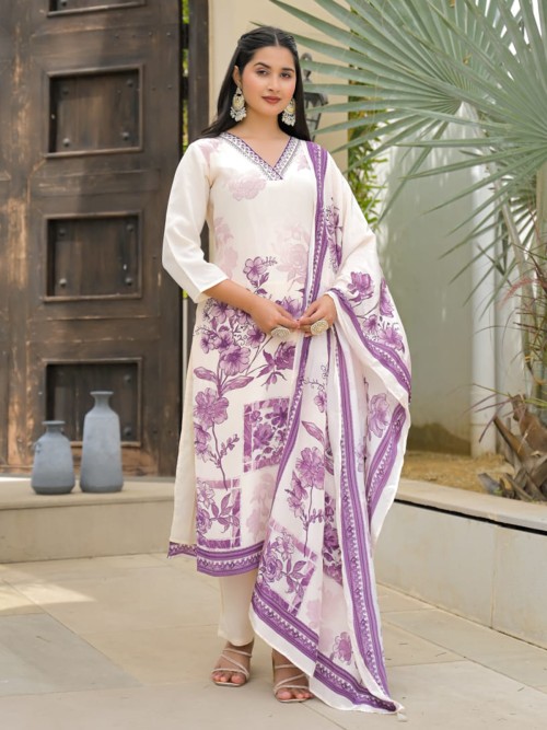 Pure white silk exudes serene charm in this kurti set. Light printed designs add delicate elegance, enhancing its airy, modern look. With a V-neck and quarter sleeves, styled with a coordinating pant and dupatta, ideal for refined festive occasions.