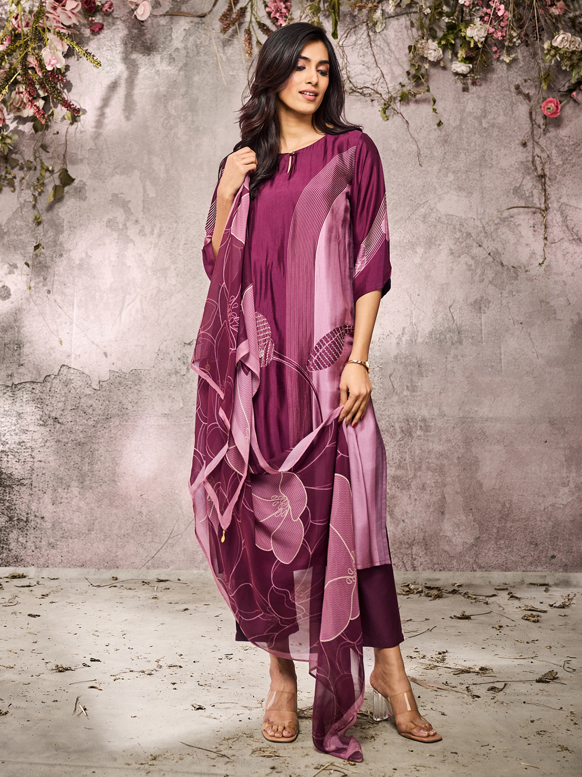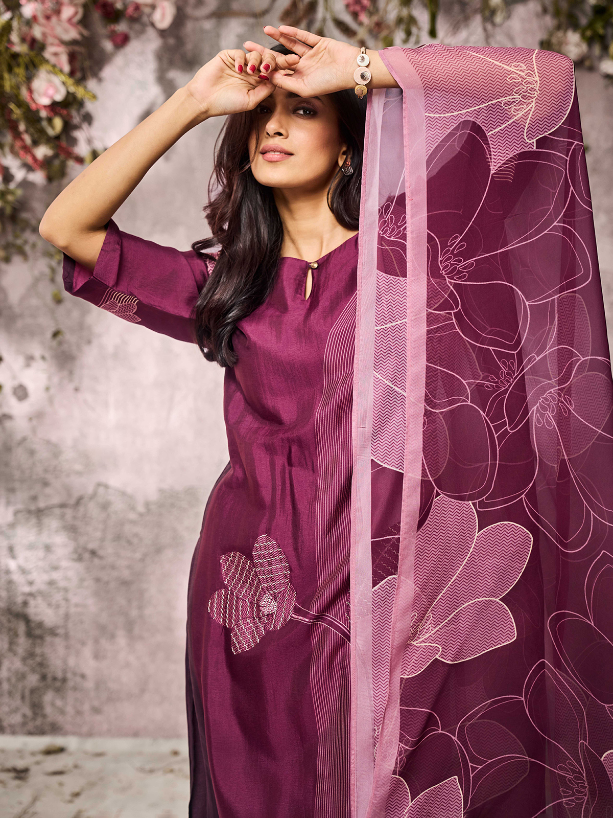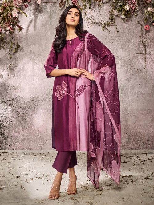 In rich wine silk, delicate threadwork paints an aura of quiet luxury. The keyhole neckline and quarter sleeves blend contemporary ease with festive tradition. Paired with pant and dupatta, it carries regal warmth for refined celebrations.