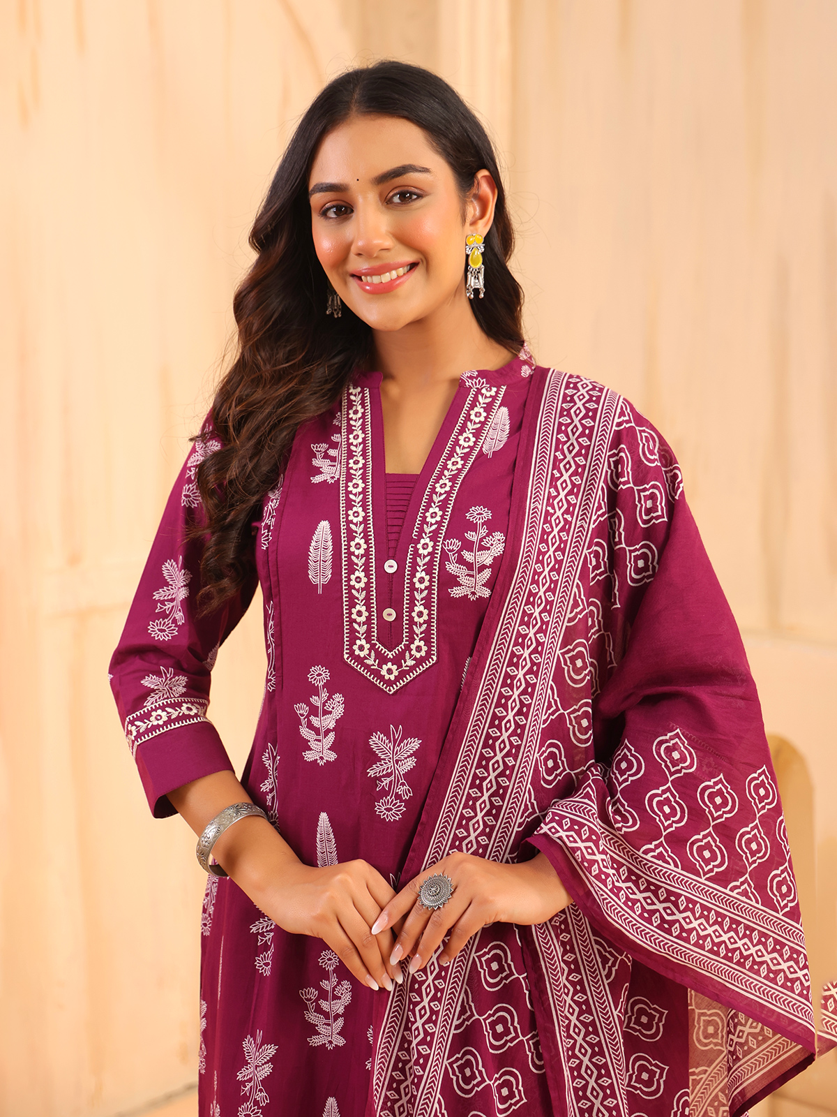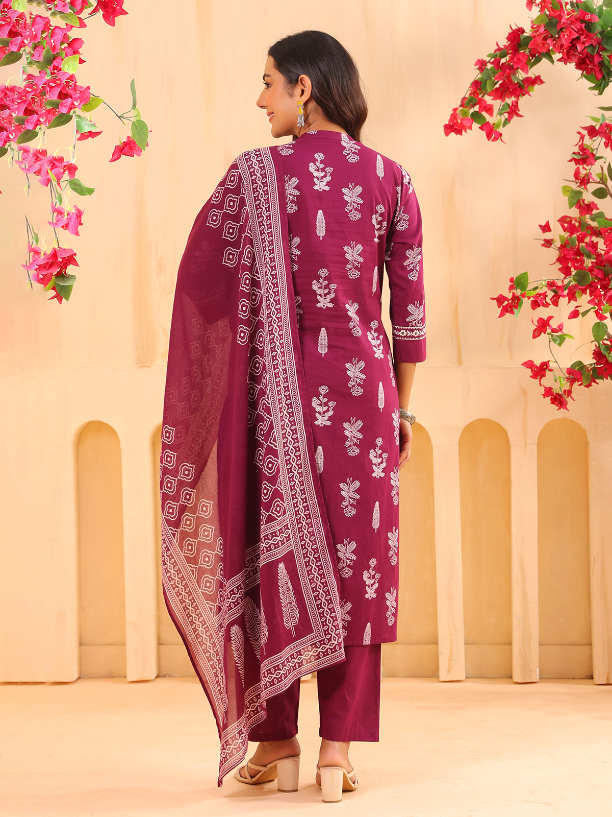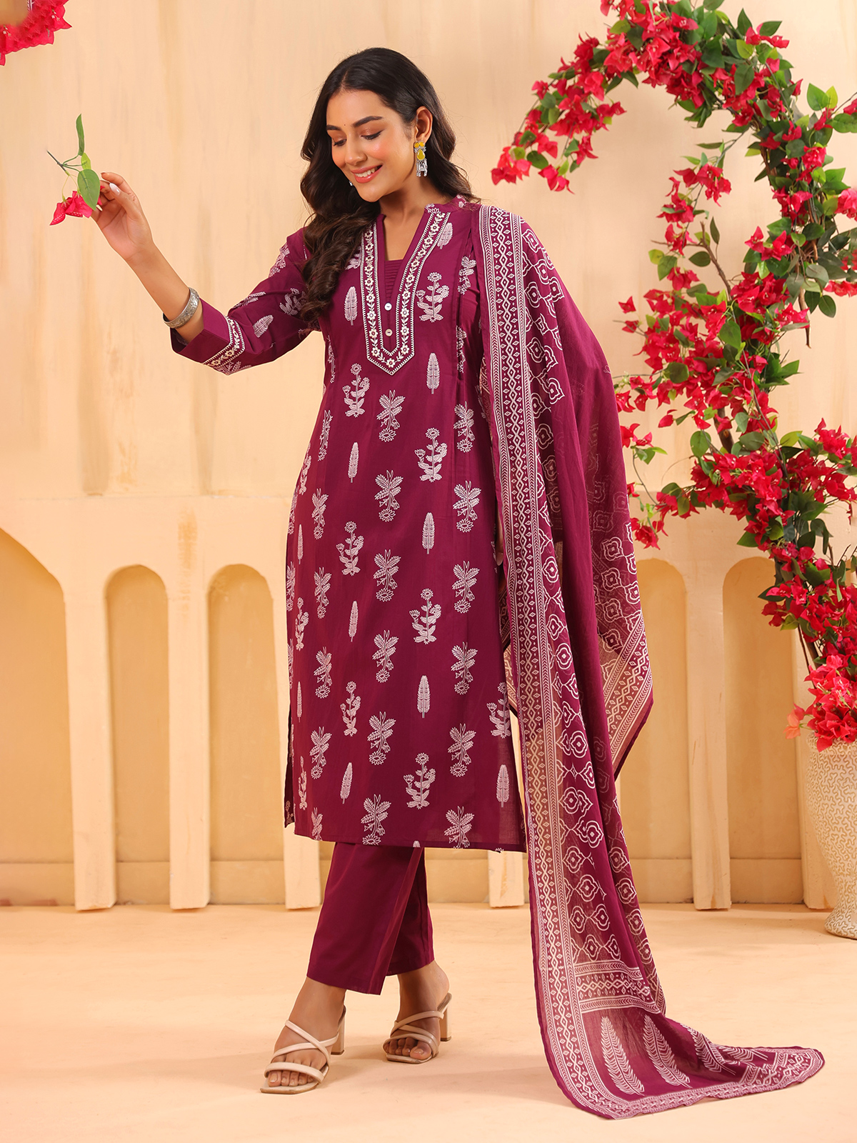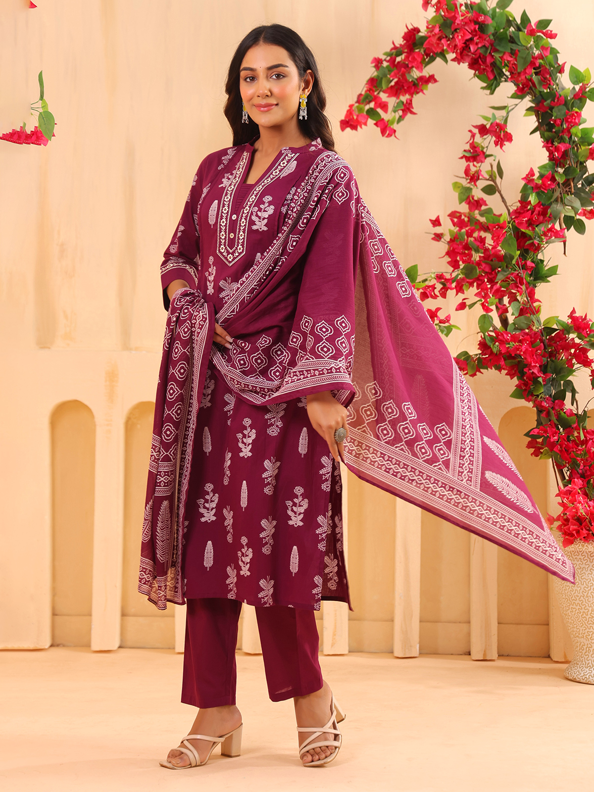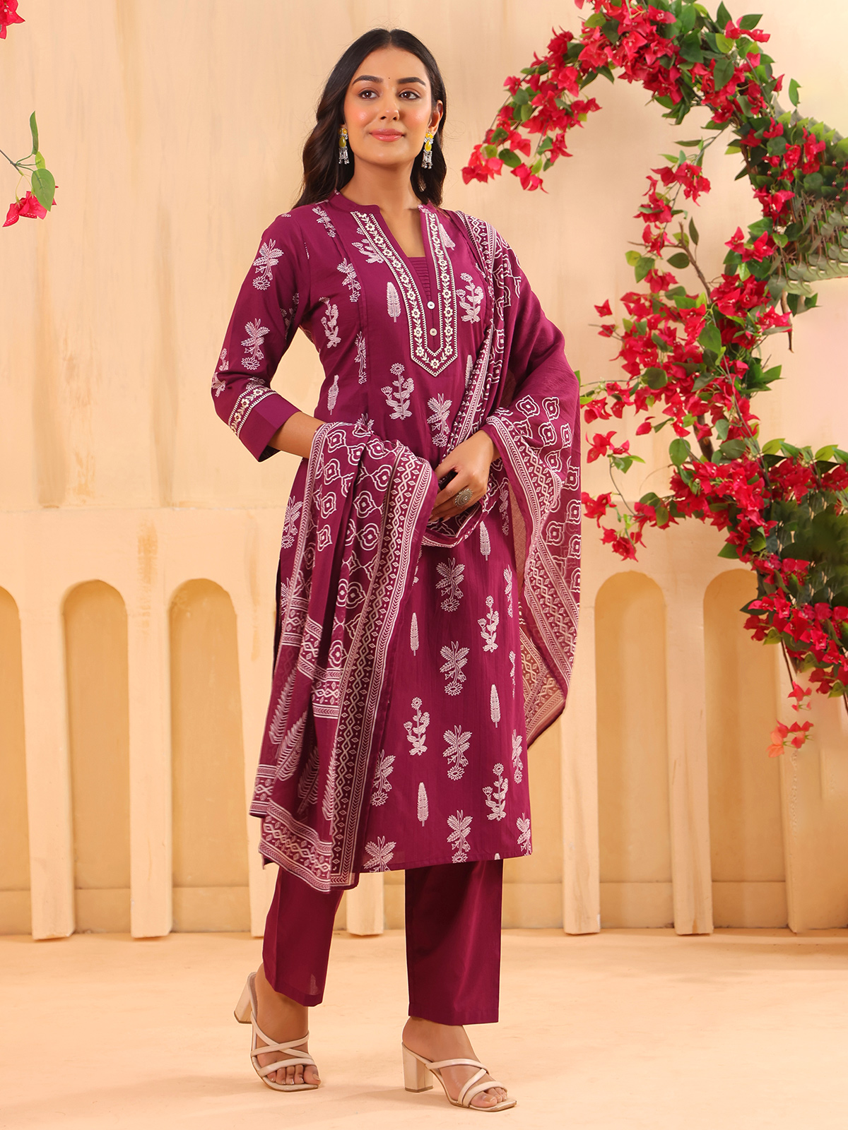 Embracing rich festive charm, this wine cotton kurti set adds depth and elegance to your style. Crafted with a stand neckline and quarter sleeves, enhanced with printed detailing along with embroidery and aabla work. Ideal for festive wear, it is paired with a pant and a printed dupatta for a balanced and stylish look.