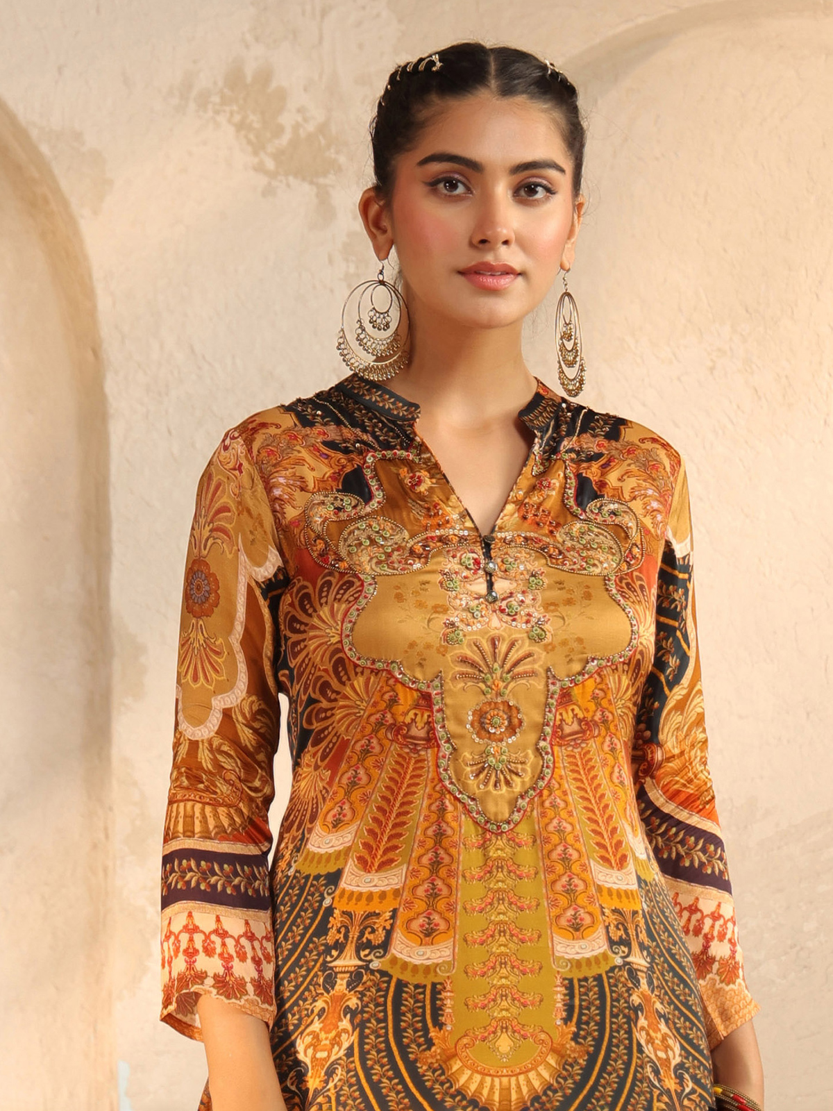 Striking in yellow and black silk, this printed kurti shines with sequins and cutdana. A stand neckline and quarter sleeves enhance its festive design, styled with pants. The vibrant contrast blends traditional artistry with celebratory sparkle.