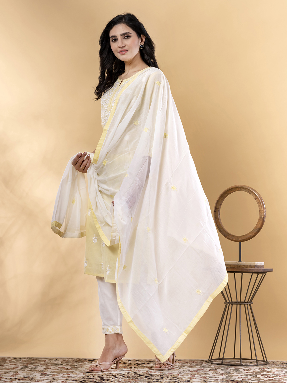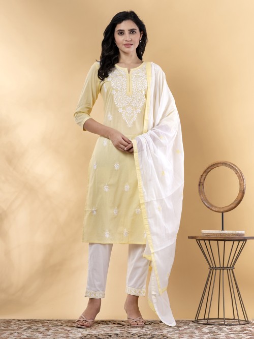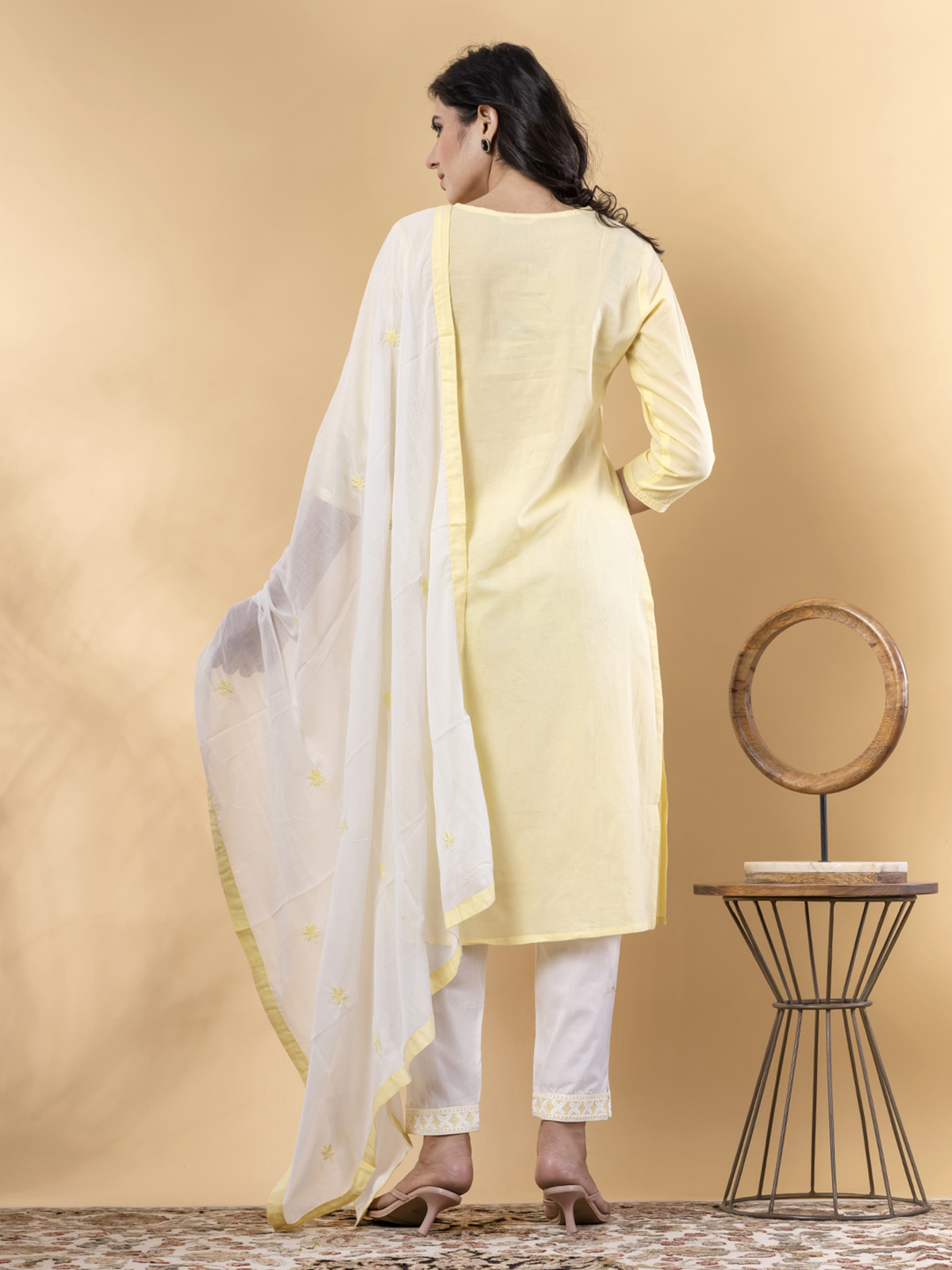 In cheerful yellow cotton, this straight-cut kurti set radiates festive brightness. Enhanced with delicate embroidery, quarter sleeves, and a pant, it comes with a soft dupatta for a complete, graceful look perfect for cultural events and daytime celebrations.