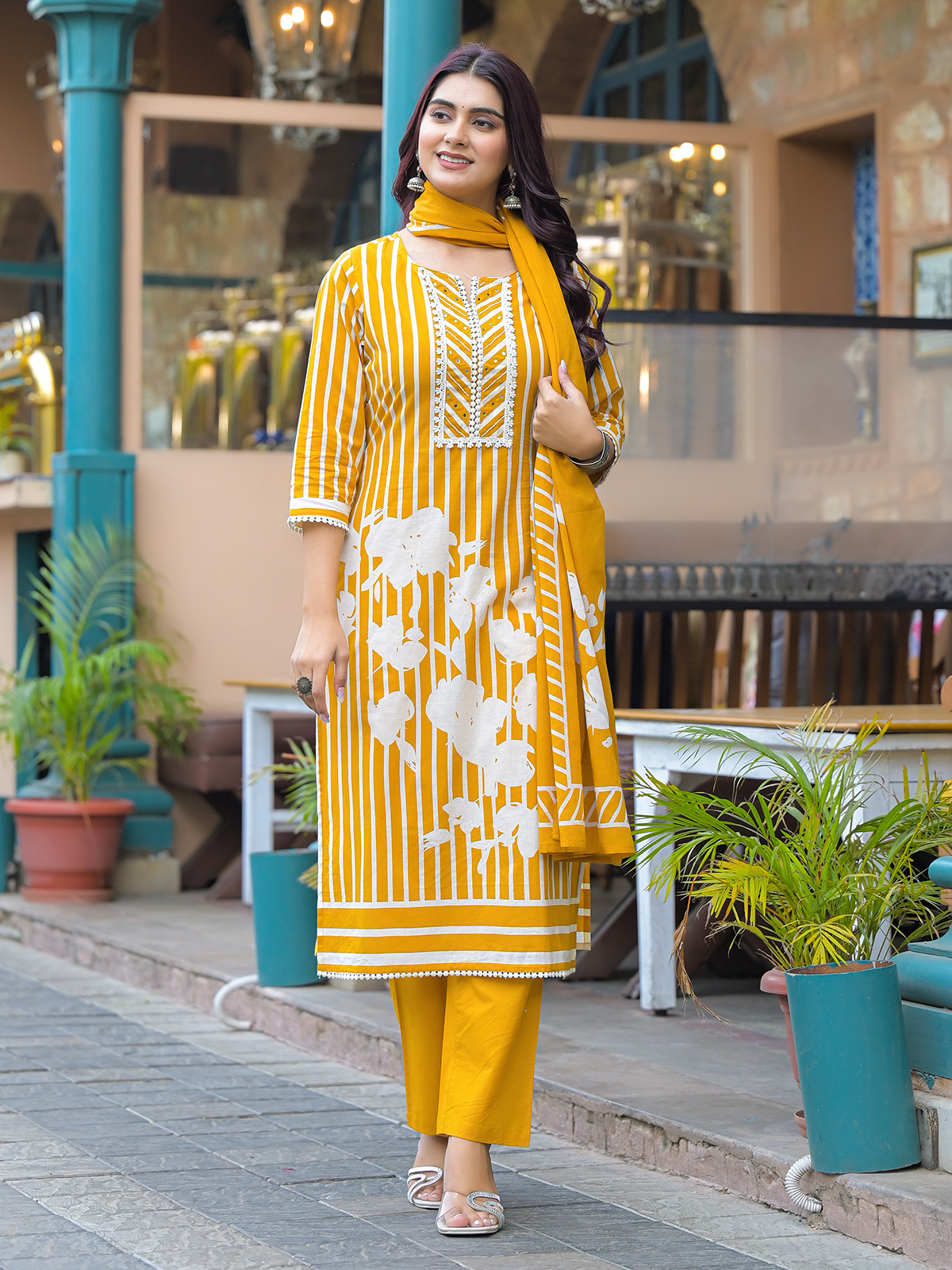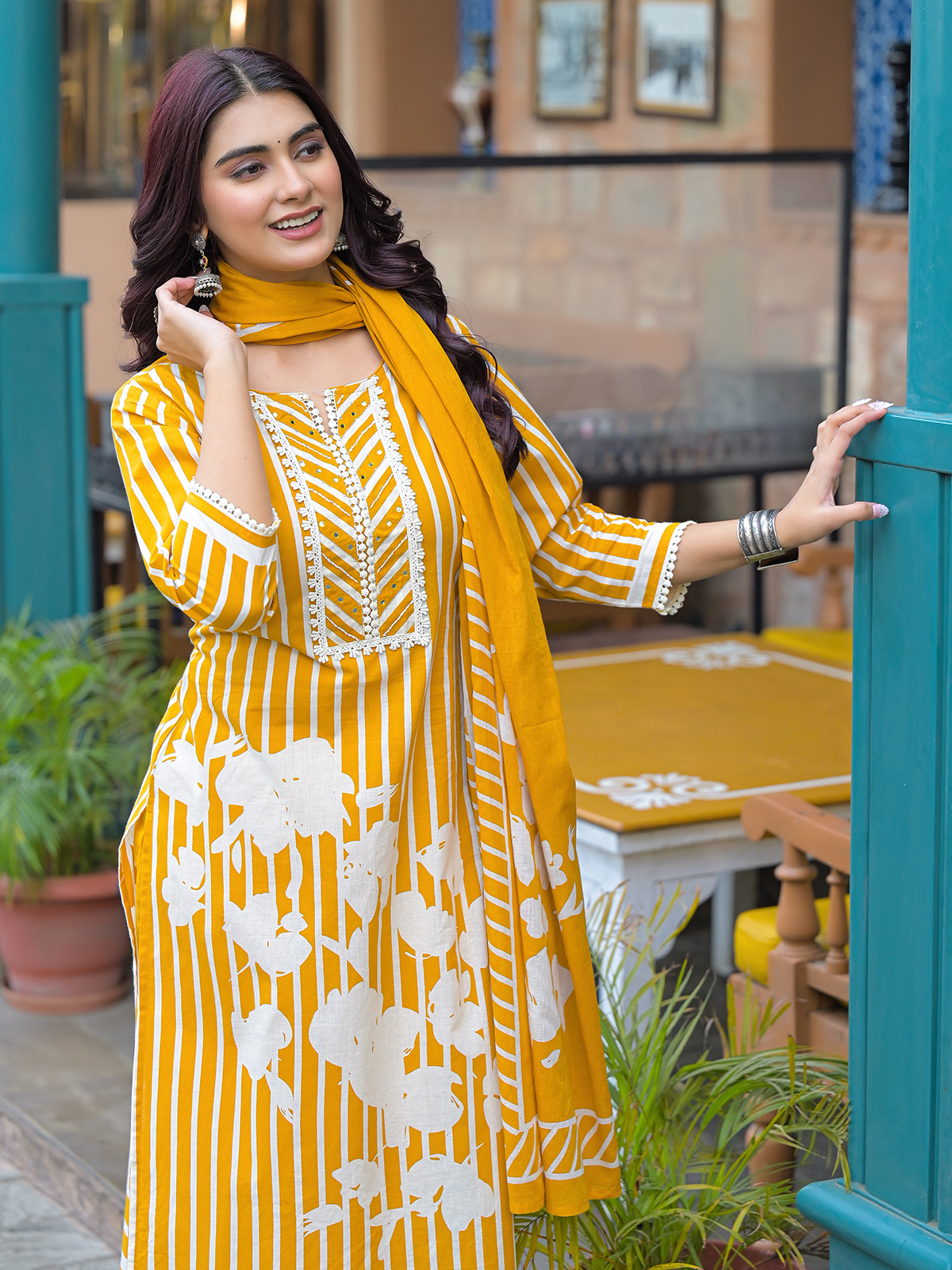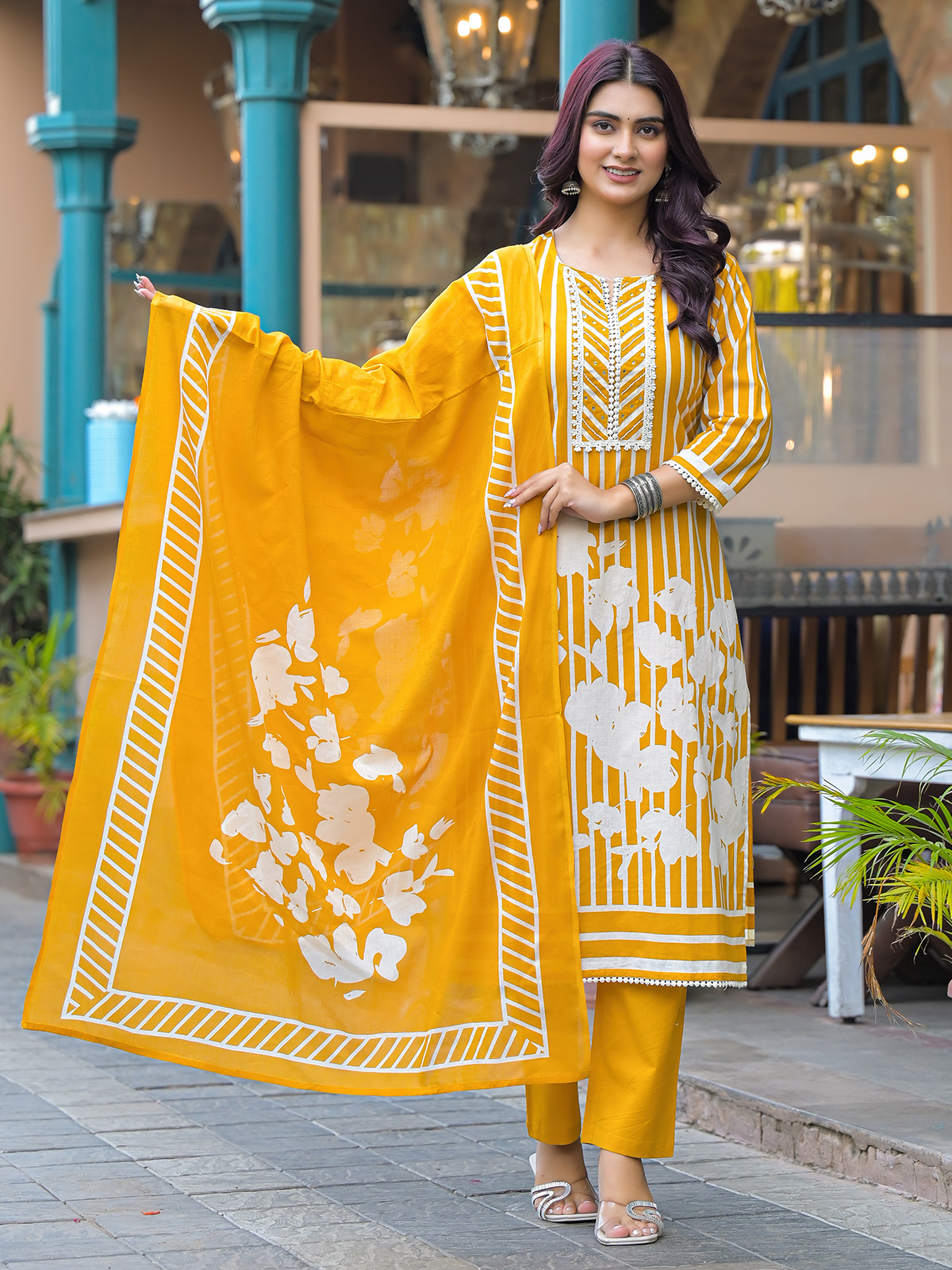 Designed to enhance a woman’s natural elegance, this yellow cotton kurti set brings timeless festive appeal. Styled with a round neckline and quarter sleeves, it is detailed with aabla, thread and refined cutwork on printed motifs for a rich ethnic finish. Ideal for festive occasions, the set comes with a comfortable pant and a printed dupatta.