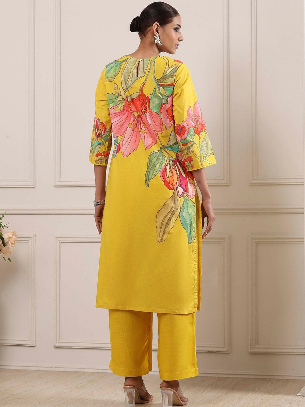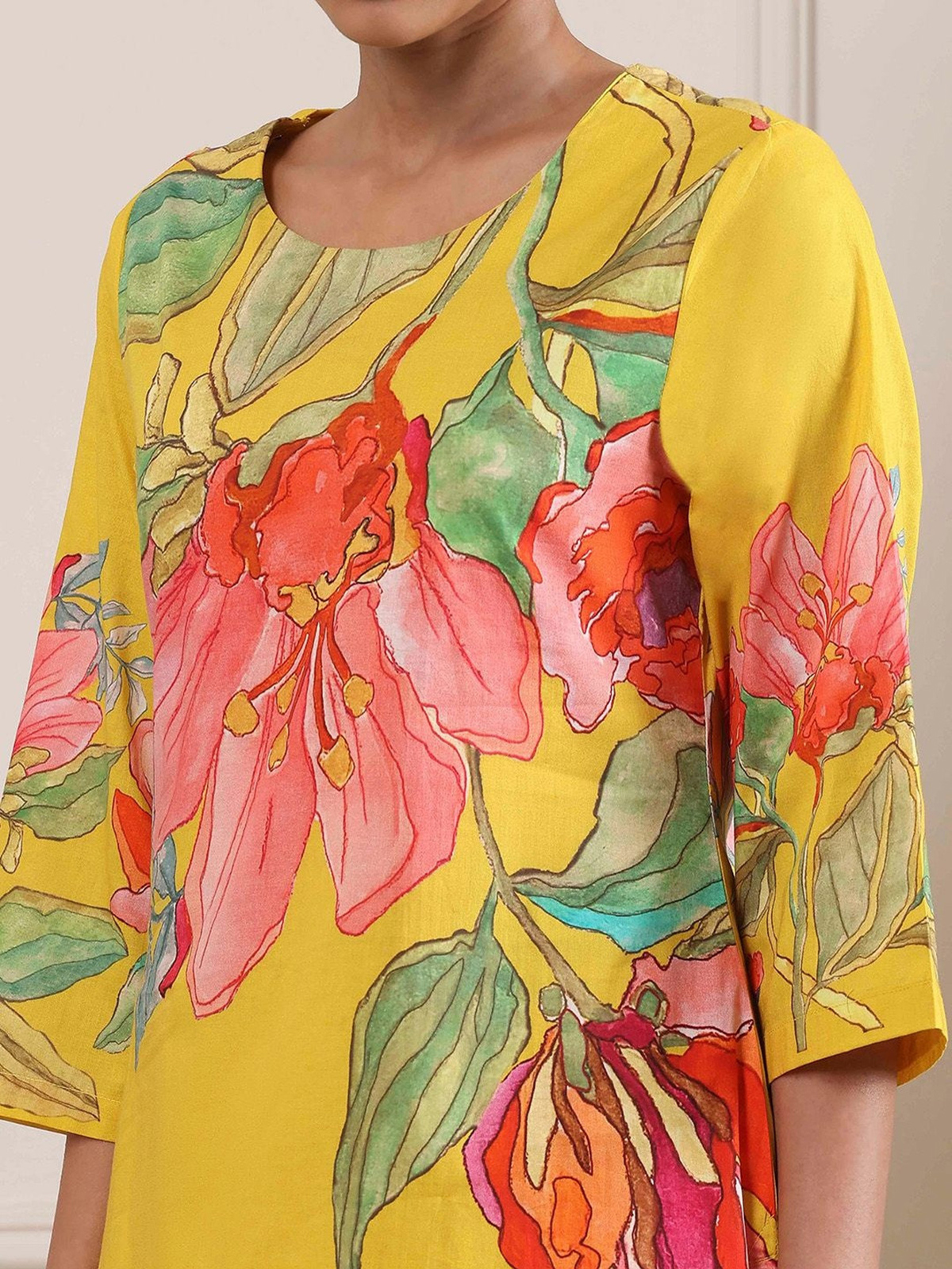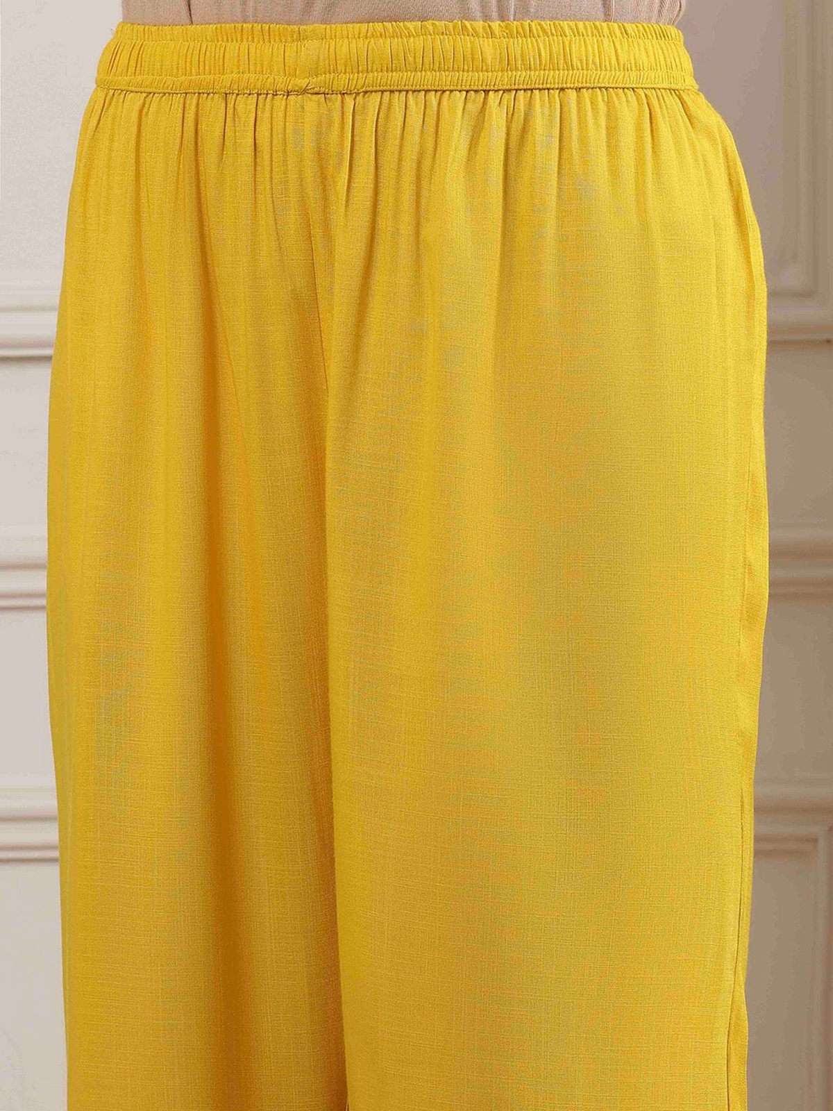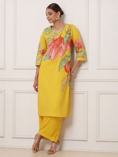Add a pop of sunshine to celebrations with this yellow printed kurti set made from luxurious cotton silk. The straight-cut design, round neck, and quarter sleeves ensure a flattering fit. Styled with a coordinated palazzo, this festive ensemble blends traditional elegance with modern comfort beautifully.