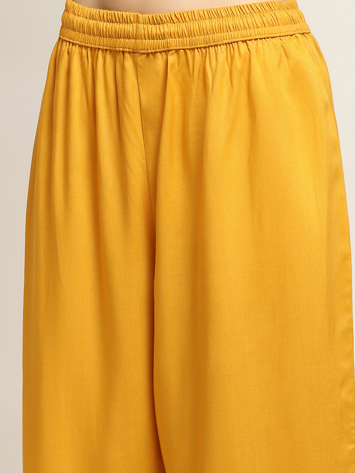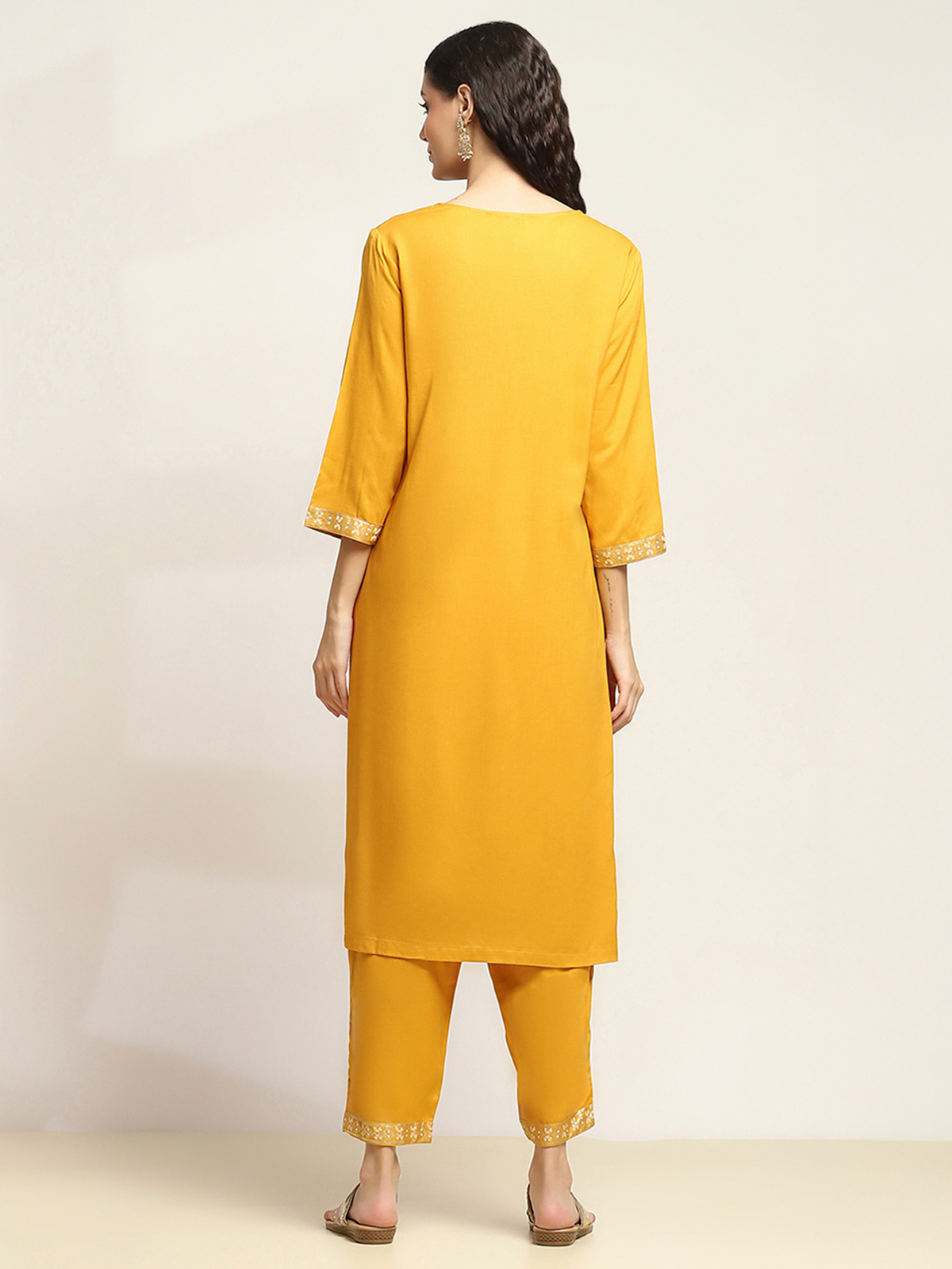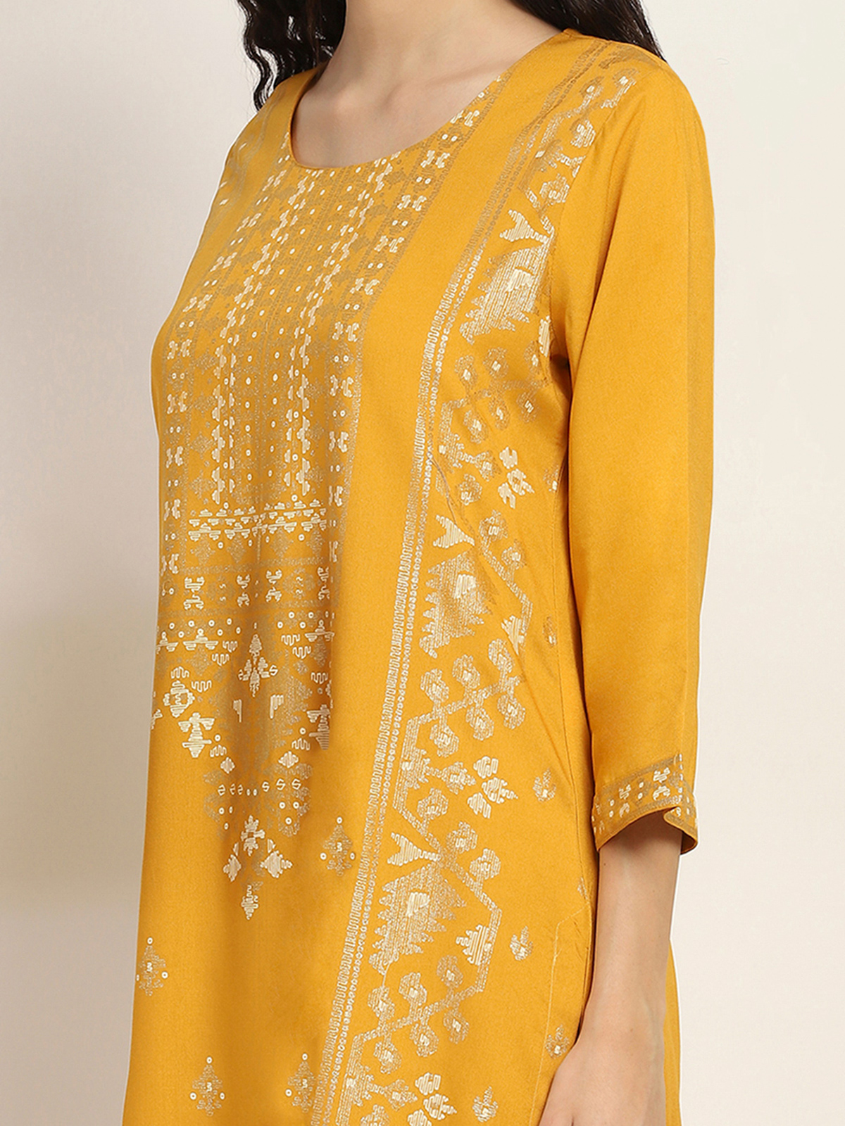 This sunny yellow viscose rayon kurti set features an elegant printed design, styled with a round neckline, quarter sleeves, and matching pants. Lightweight and comfortable, it blends casual charm with festive sophistication, making it a versatile choice for daytime celebrations and stylish everyday wear.