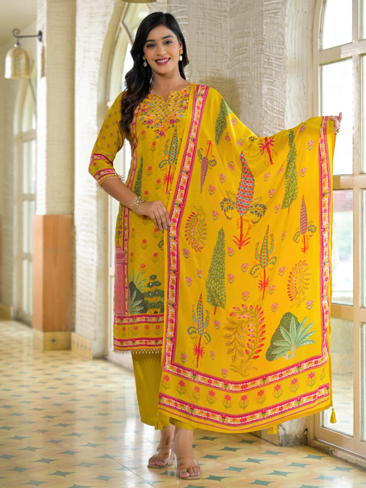 Vibrant yellow silk radiates cheerful charm in this kurti ensemble. Sequins, beads, and cutdana enhance playful printed motifs, creating a joyful sparkle. Quarter sleeves lend modern grace, paired with a coordinating pant and dupatta, ideal for bright festive occasions and spirited gatherings.