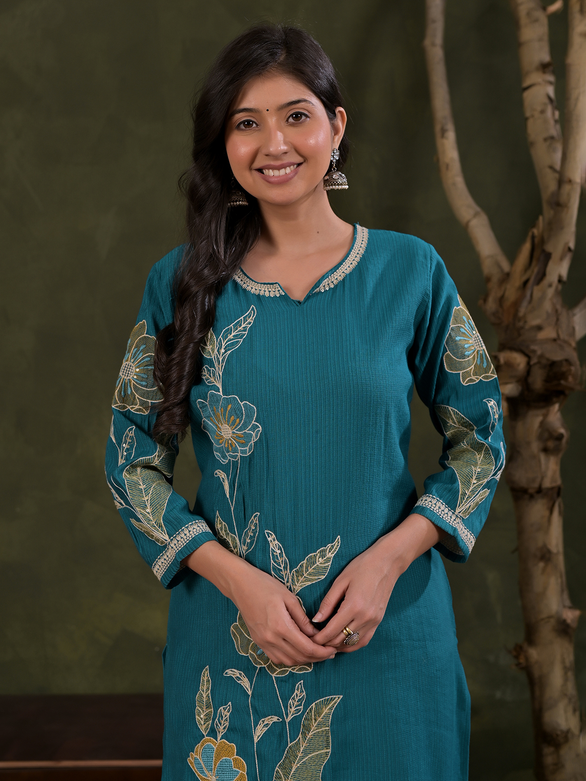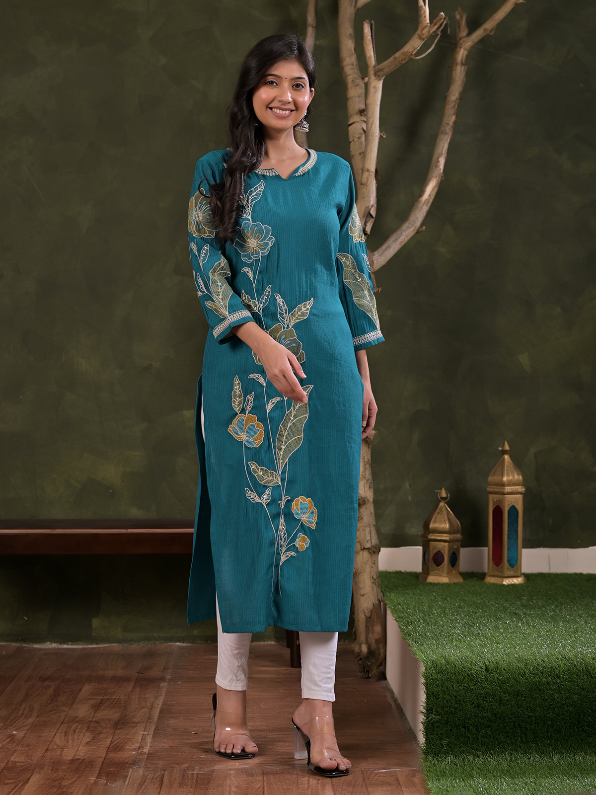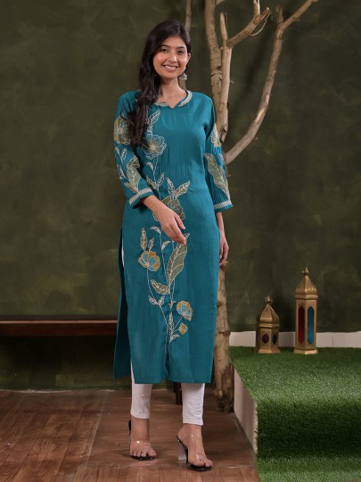 Refreshing aqua blue tones define this silk kurti crafted for modern casual styling. Adorned with elegant embroidery, it highlights subtle craftsmanship. The sweetheart neckline and quarter sleeves enhance its soft appeal. Designed in a straight cut silhouette, this kurti offers a perfect blend of comfort and graceful everyday elegance.