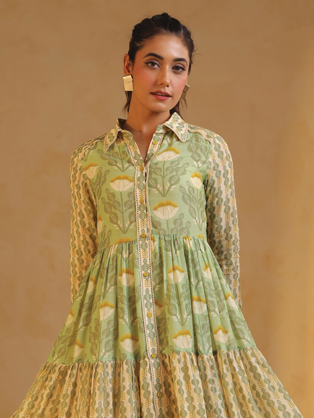 In beige and green silk, this printed kurti exudes graceful simplicity. A smart collar with quarter sleeves adds to its casual appeal, making it a versatile outfit for daywear, friendly gatherings, or semi-formal occasions where comfort meets elegance.