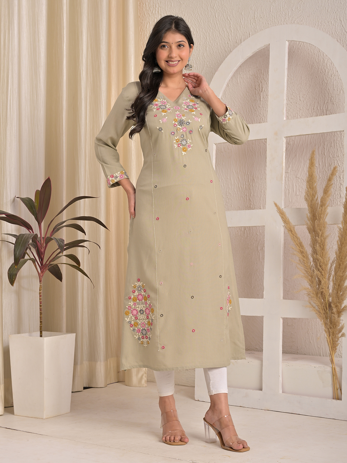 This beige silk kurti is beautifully accented with intricate embroidery and delicate sequins work. Styled with a V neckline and quarter sleeves, it offers a neutral, sophisticated look that transitions effortlessly from casual daywear to relaxed evening outings.