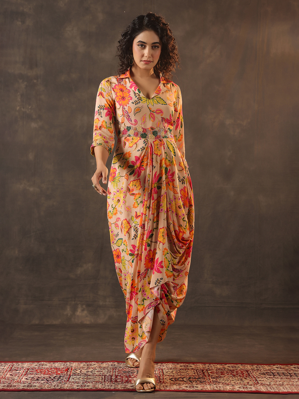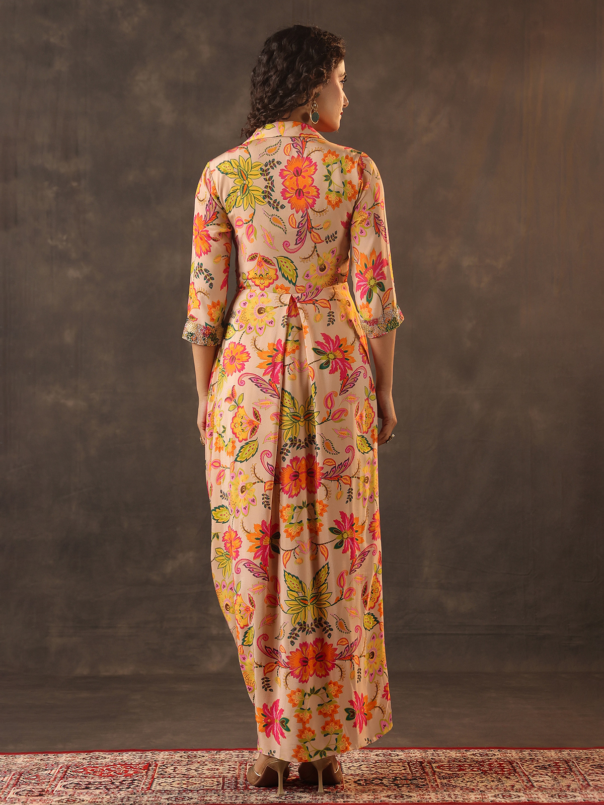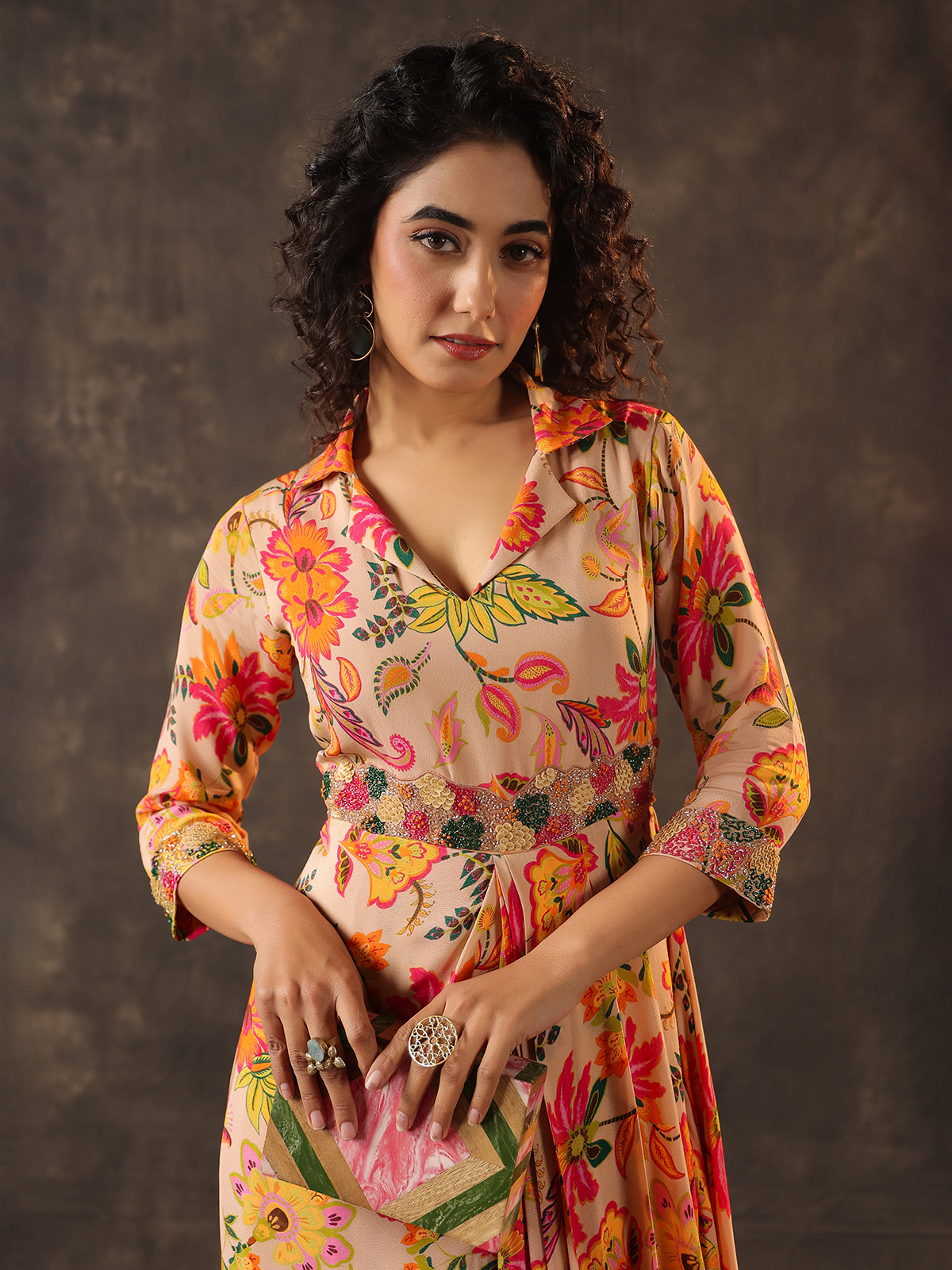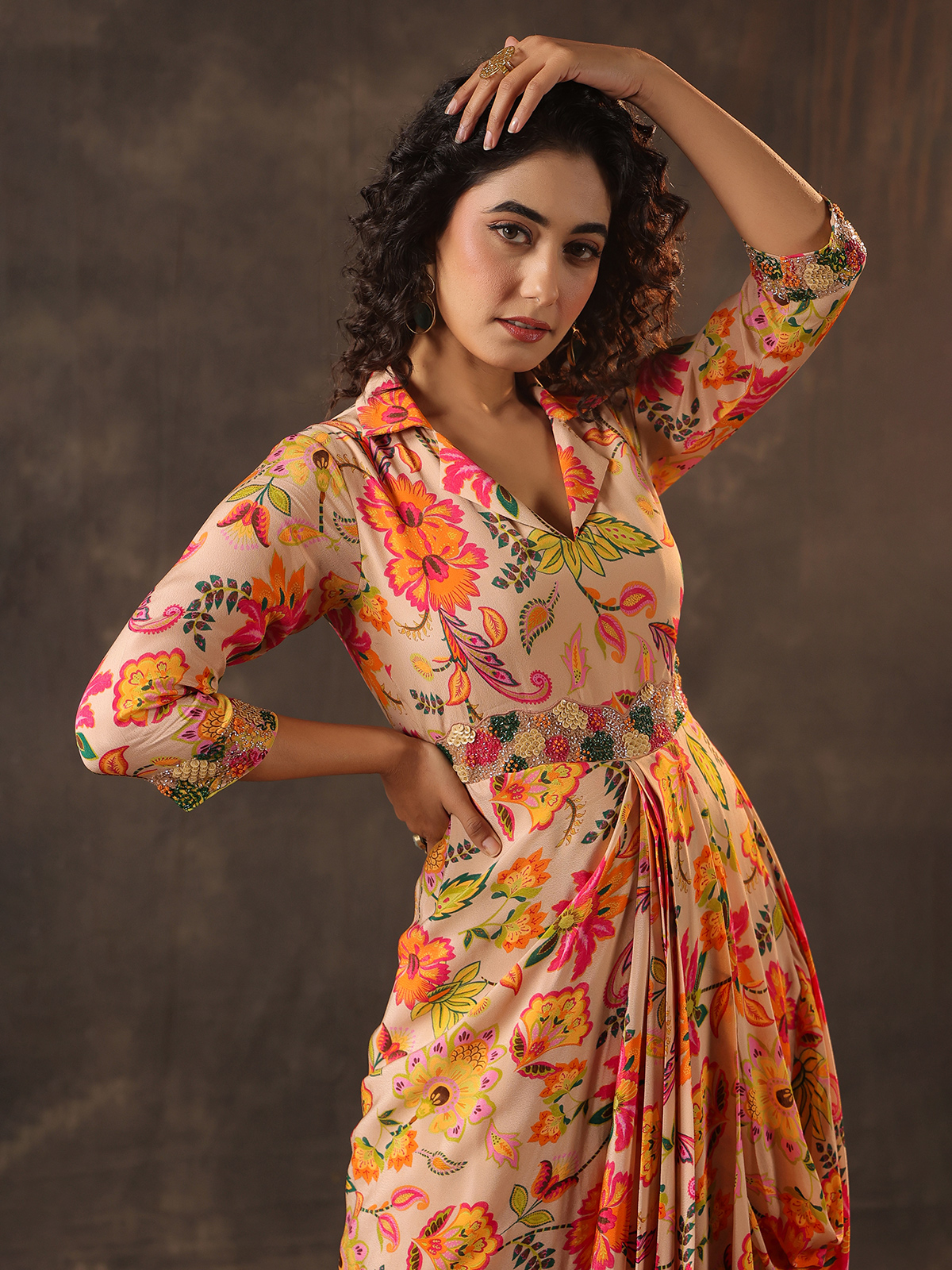 Elegant and refined beige crepe silk kurti. Features a graceful floral printed design enhanced with sequins, cutdana and delicate thread work. Styled with a smart collar neckline and quarter sleeves. It offers a polished look, making it a perfect choice for festive occasions and party wear styling.