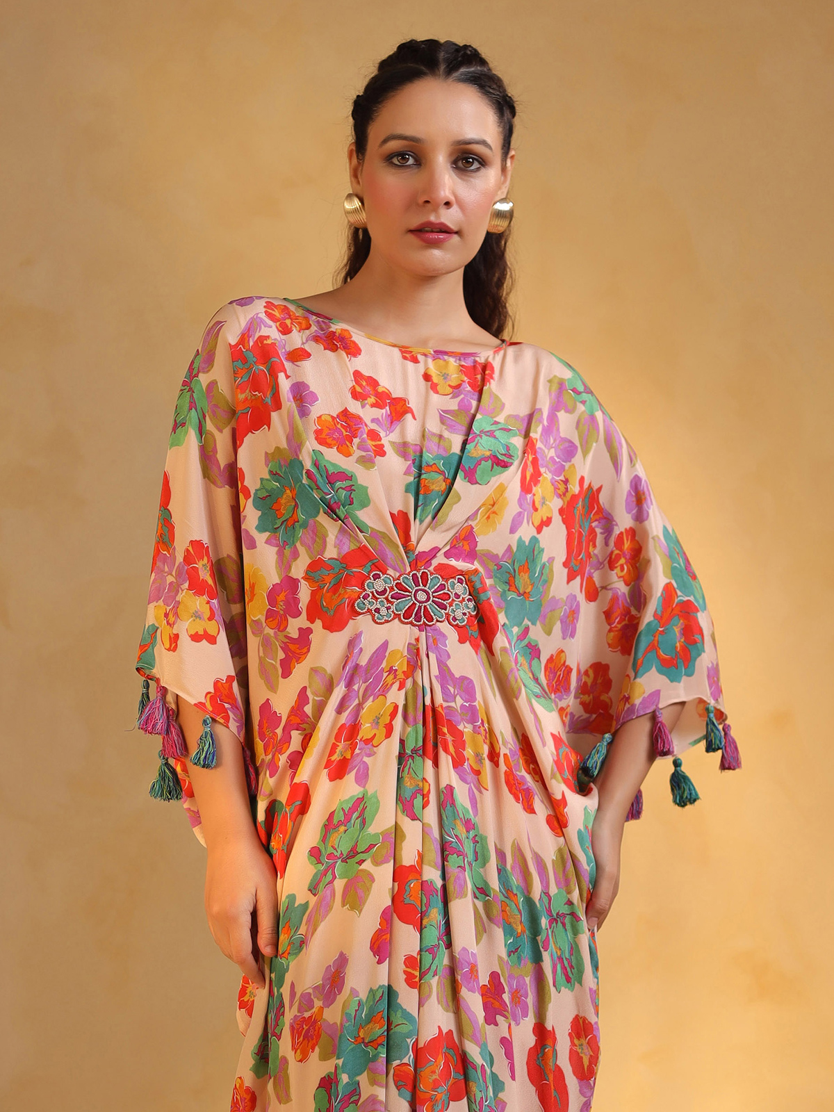 This beige silk printed kurti is enriched with beads and thread accents, giving it subtle festive elegance. The refined boatneck design enhances its timeless appeal, making it suitable for family functions, cultural festivities, and traditional gatherings with understated sophistication.