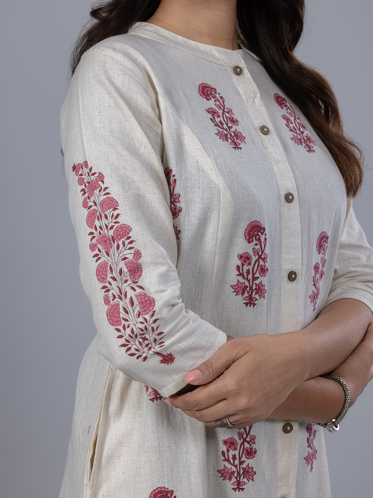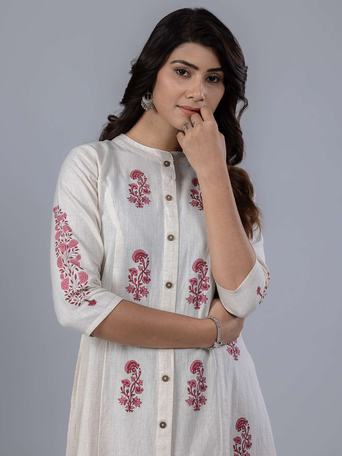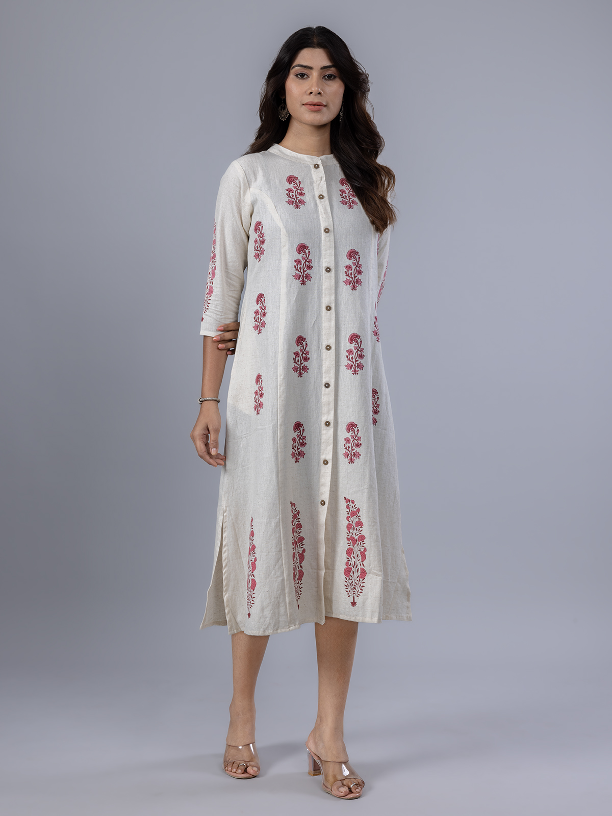 Designed for the modern woman, this beige cotton kurti features a lively red floral print with a smart stand collar and quarter sleeves. Ideal for everyday wear, it radiates grace and freshness, bringing effortless charm to your casual wardrobe.