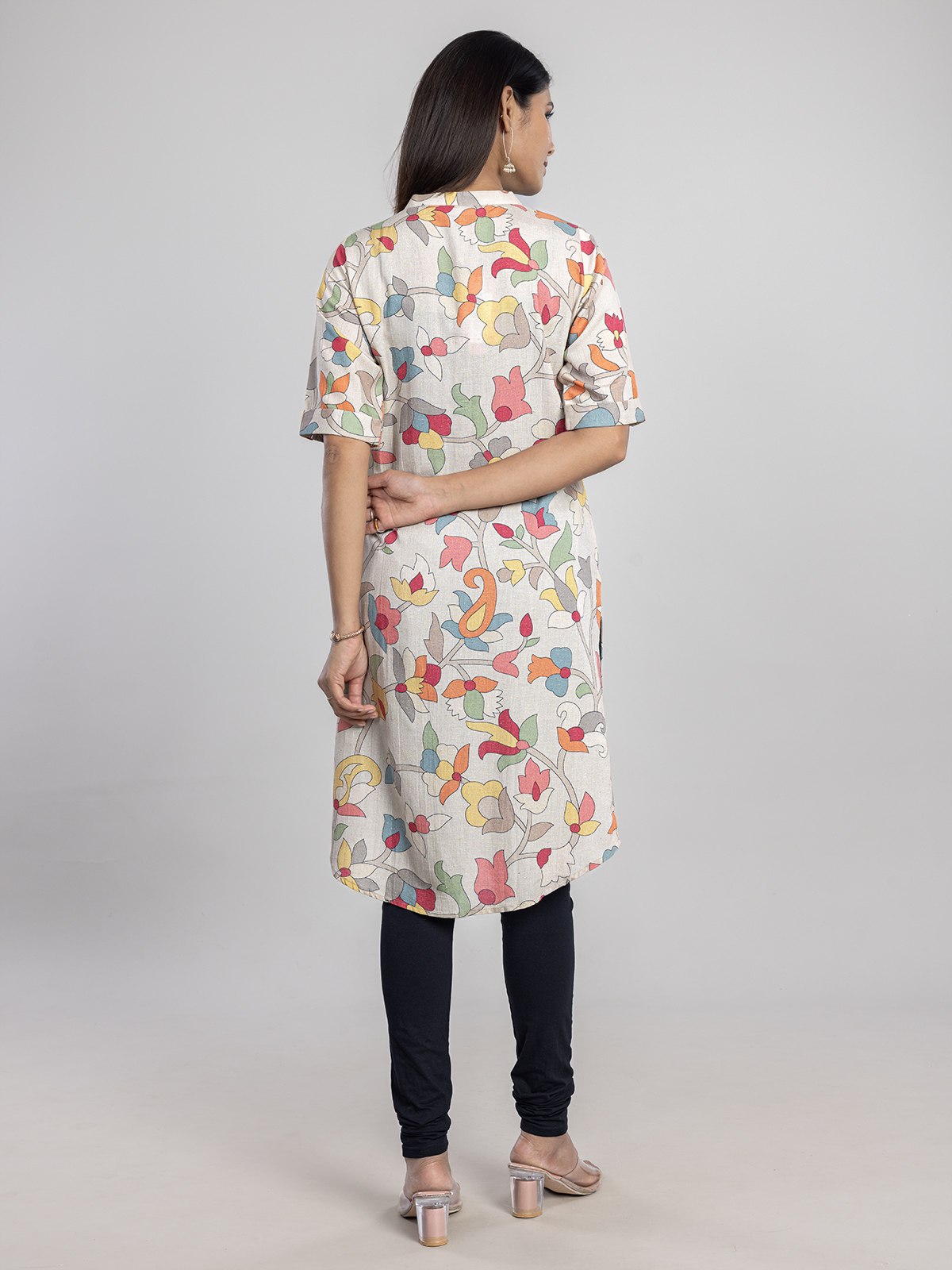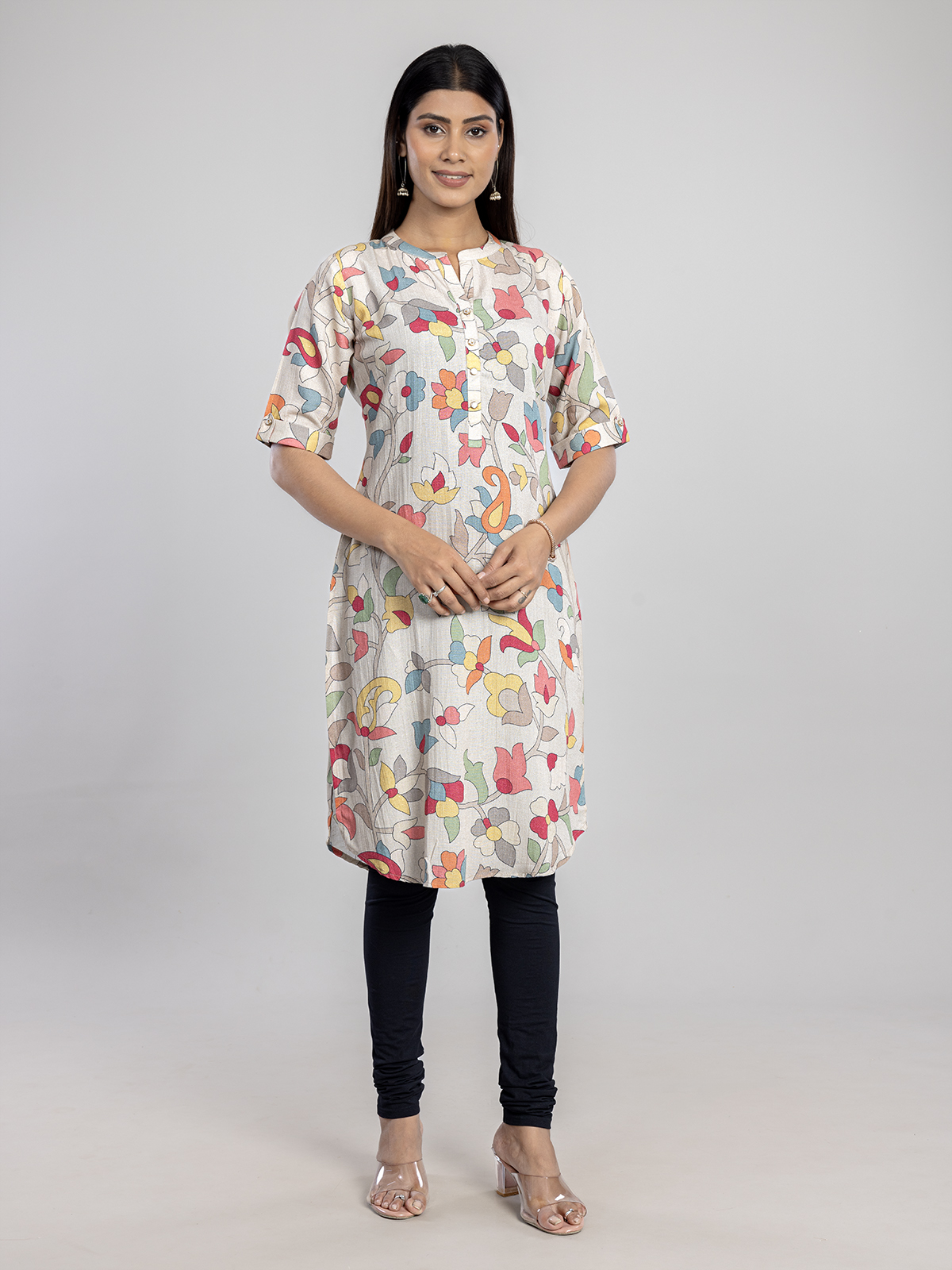 A beige cotton silk printed kurti styled with a stand collar and elbow sleeves. Breezy and elegant, it radiates casual vibrance. The soft fabric ensures comfort all day, while the warm tone complements casual dressing when paired with pants or leggings.