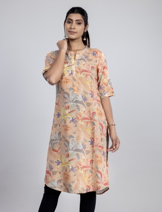 Beige Printed Linen Kurti For Women